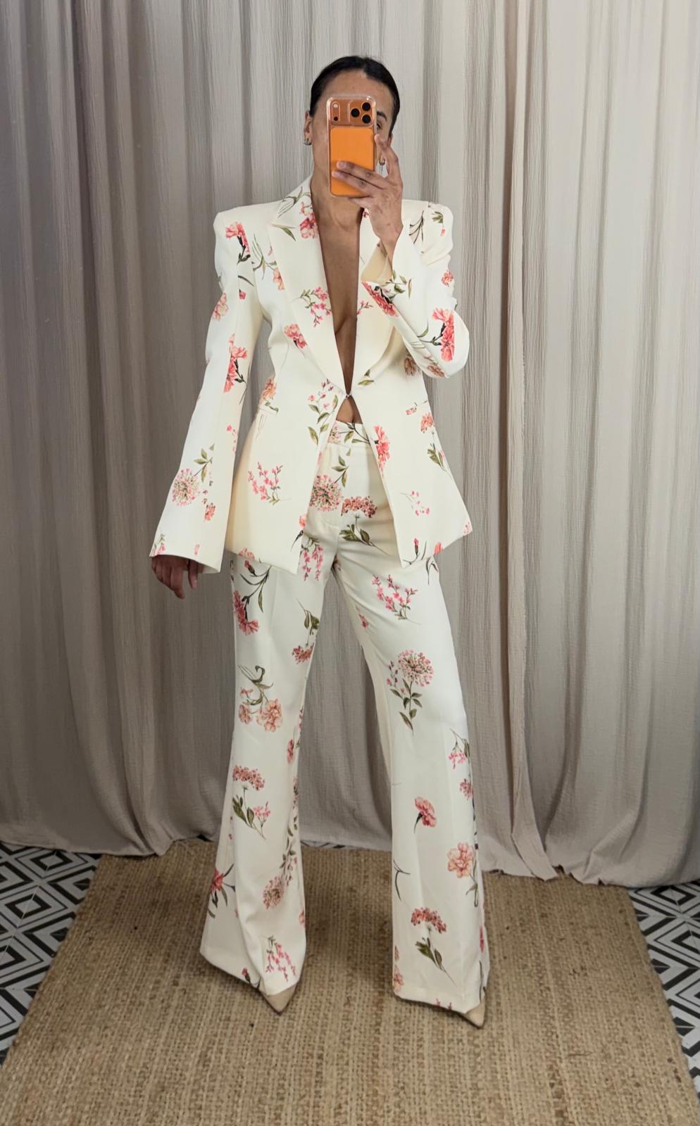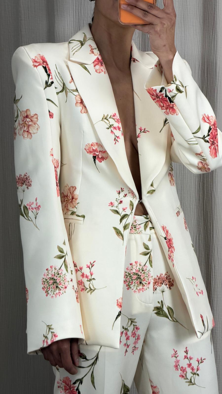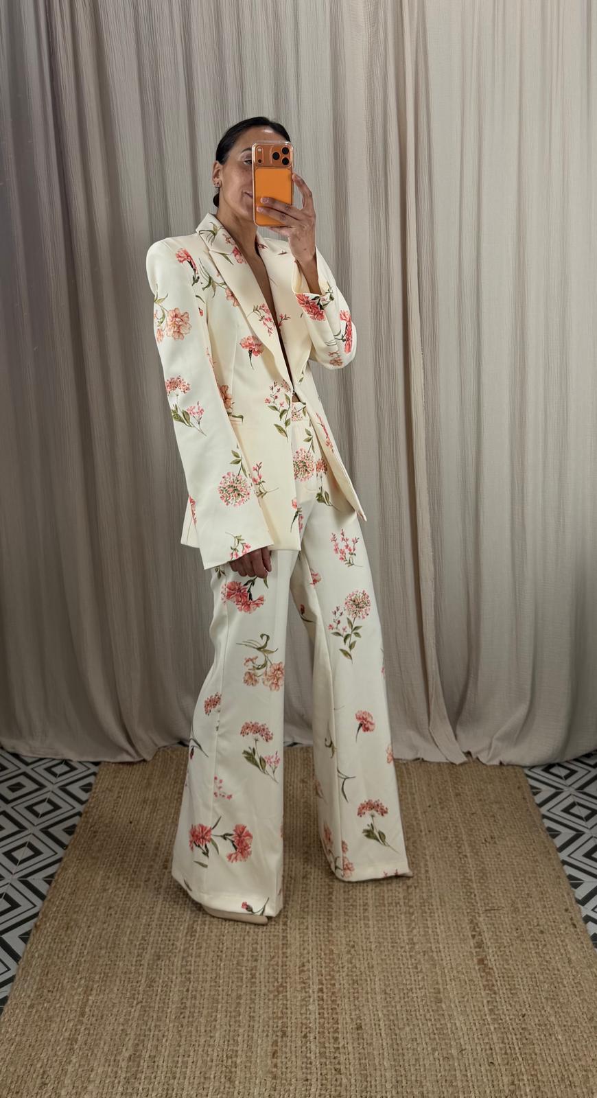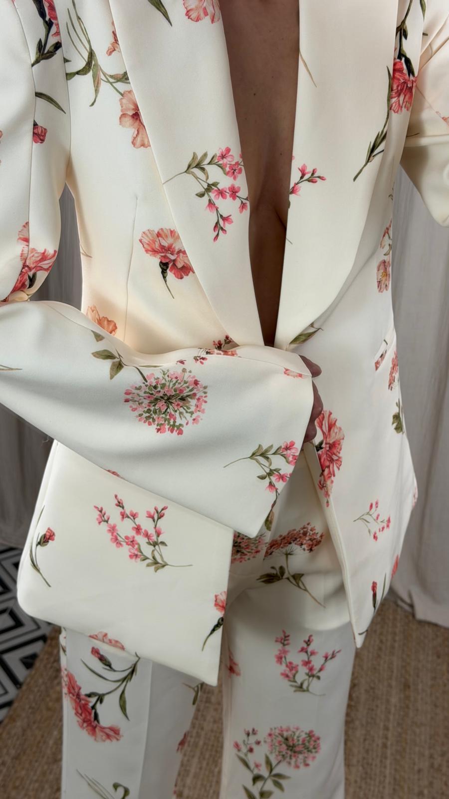 Chaqueta de corte elegante con solapas clásicas tipo sastre y una estructura ligeramente entallada. Hombros definidos y cierre discreto. Manga acampanada.