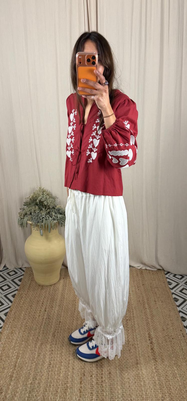 Blusa en color rojo teja con bordados blancos. Manga ligeramente abullonada. Cierre con lazadas y corte recto.