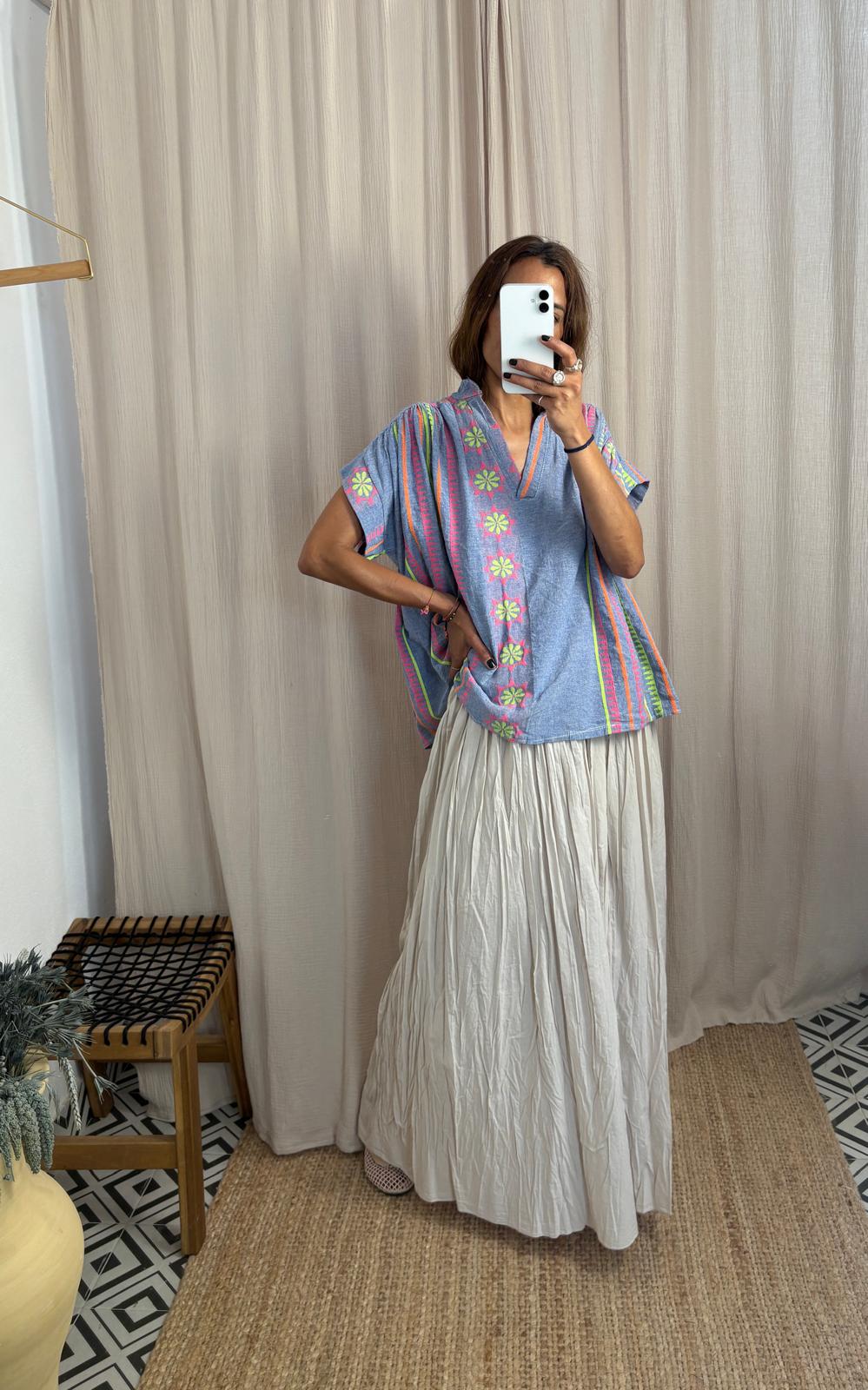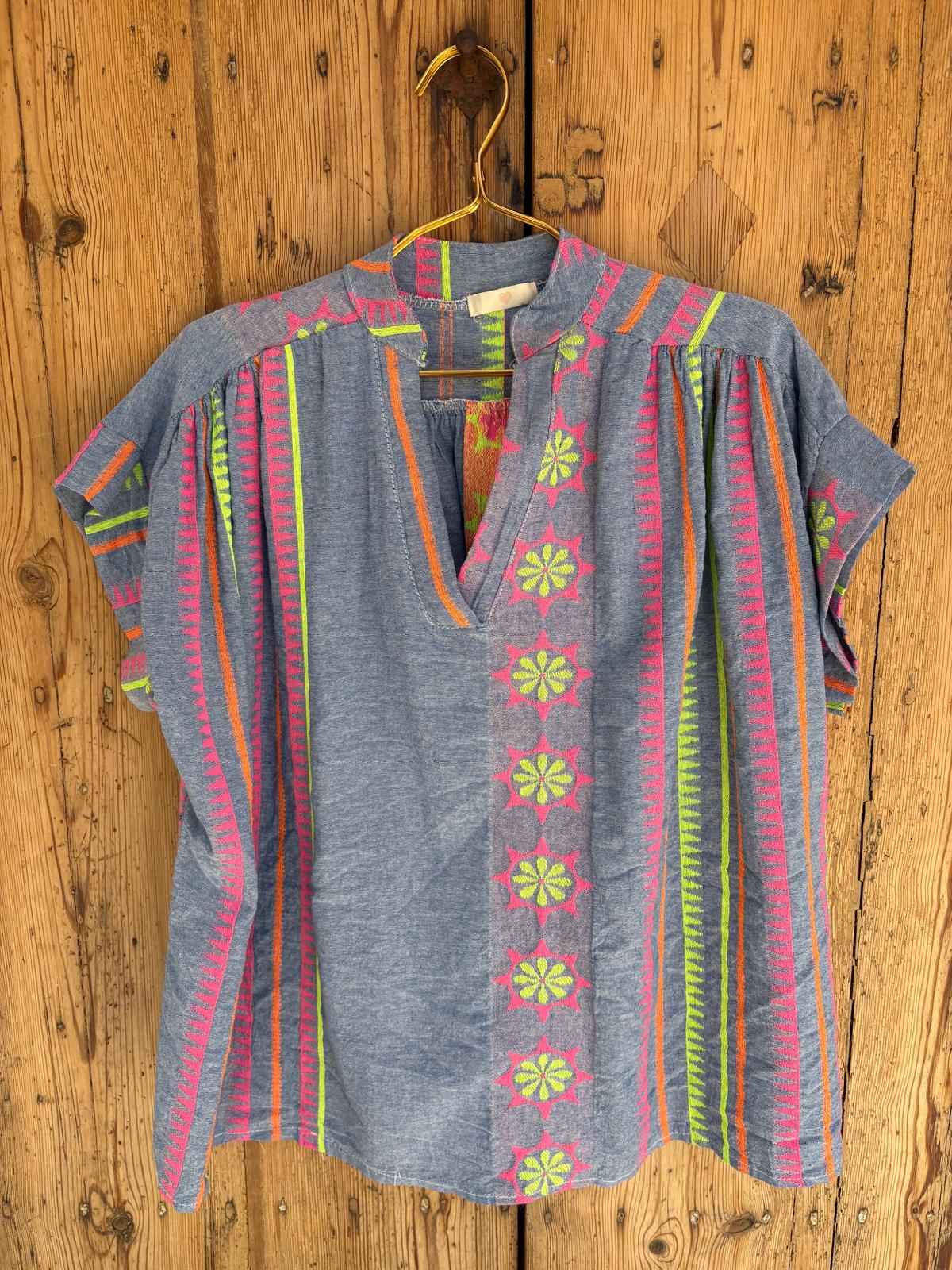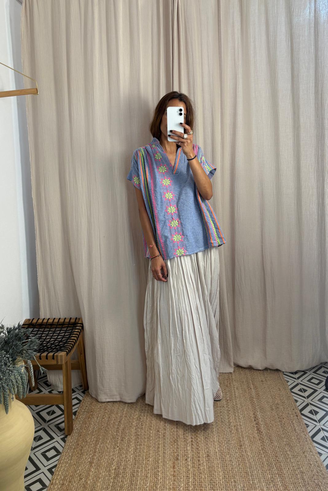 Blusa de manga corta, de corte holgado, en color azul claro con rayas verticales coloridas y bordados florales. Escote en v.