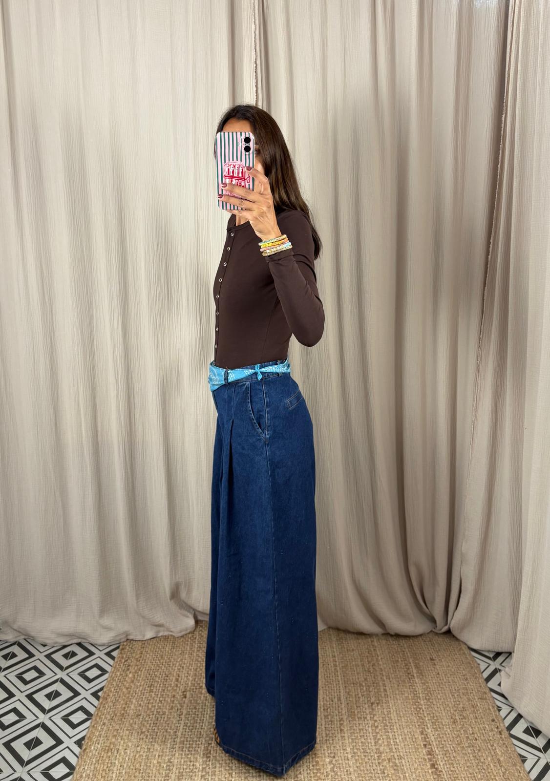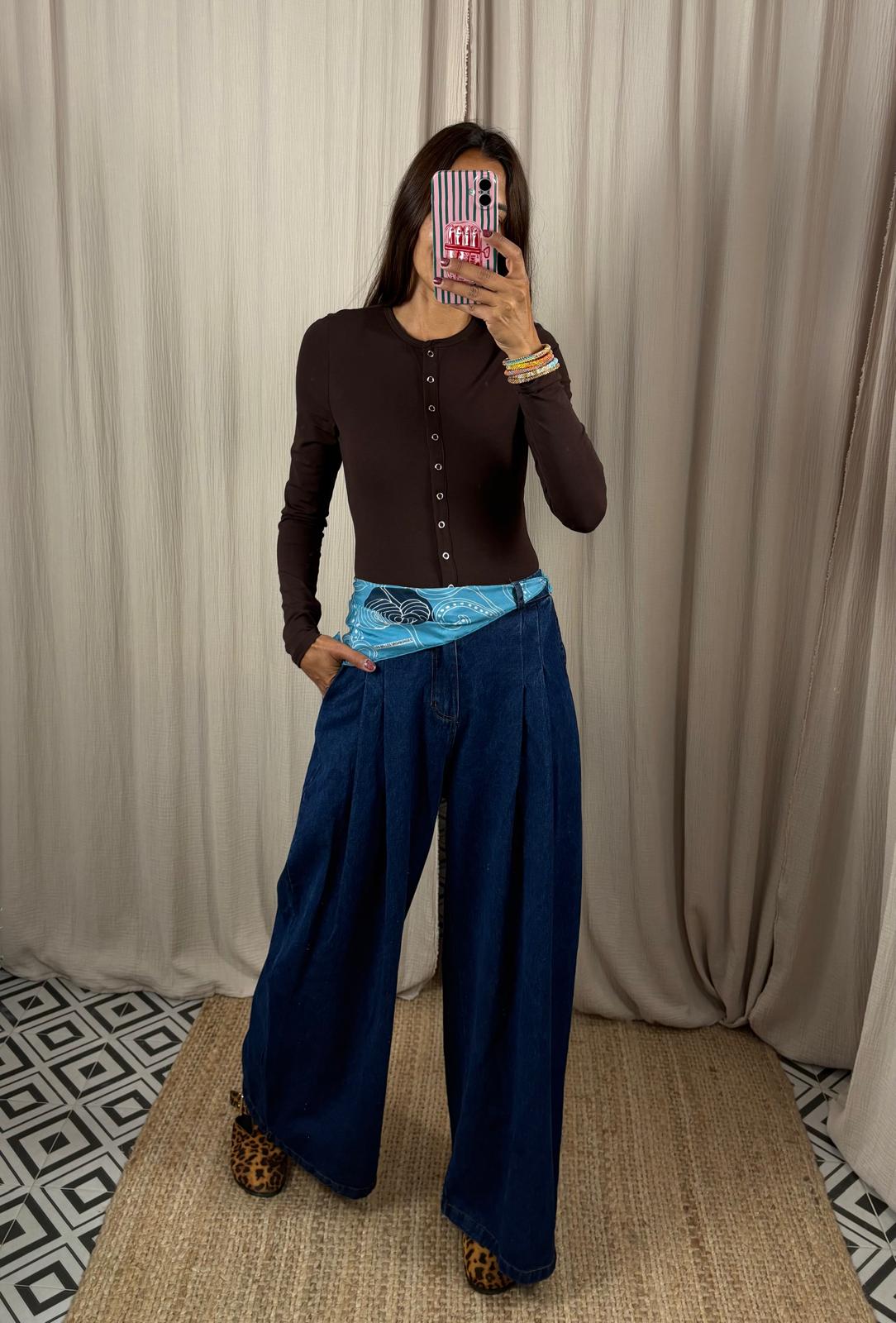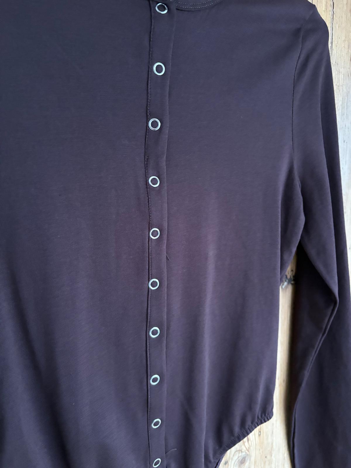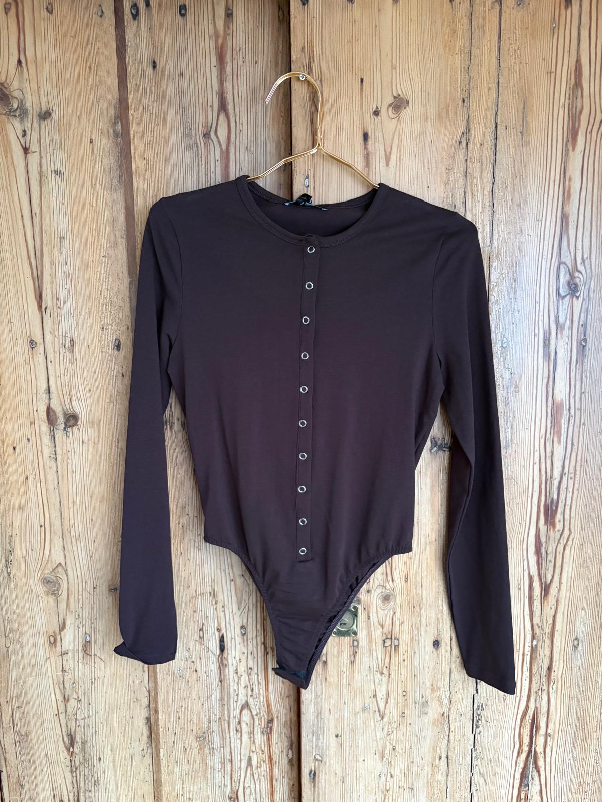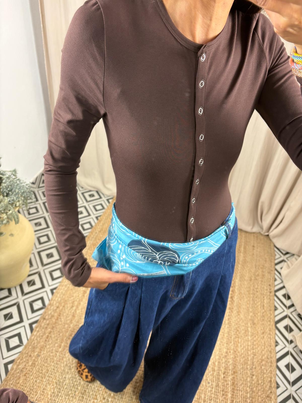 Body en color mocha, con hilera de corchetes. Cuello redondo y manga larga.