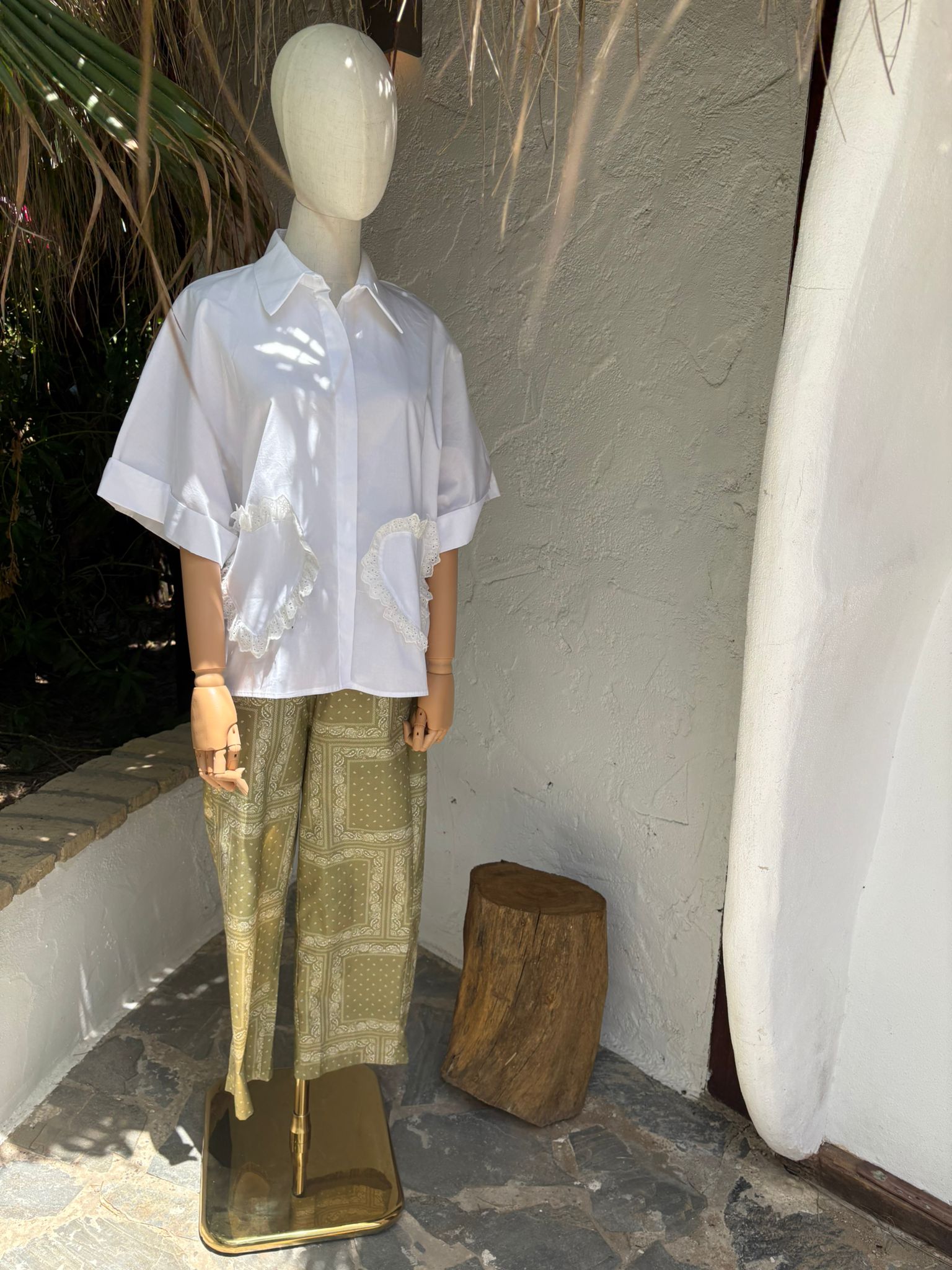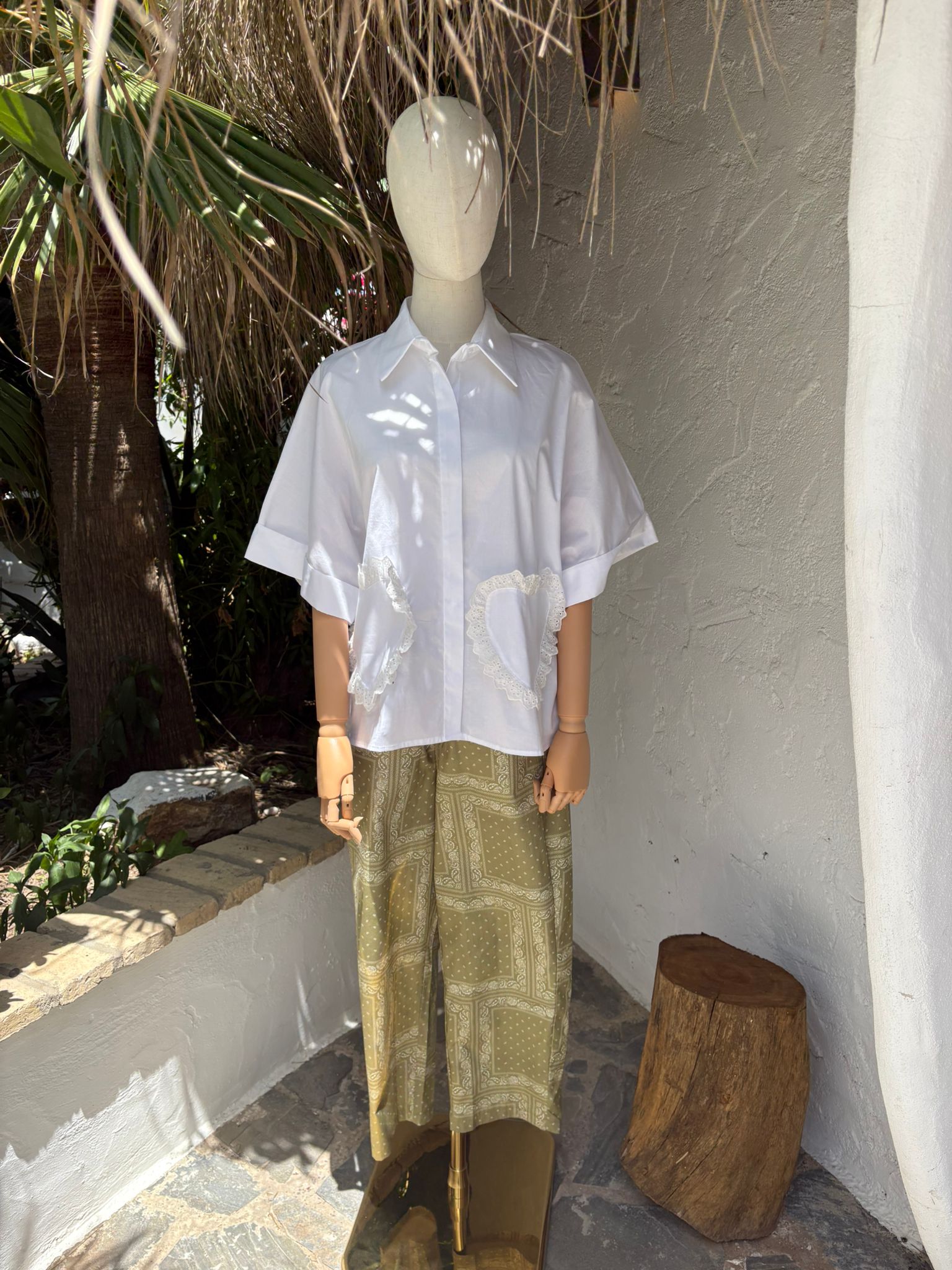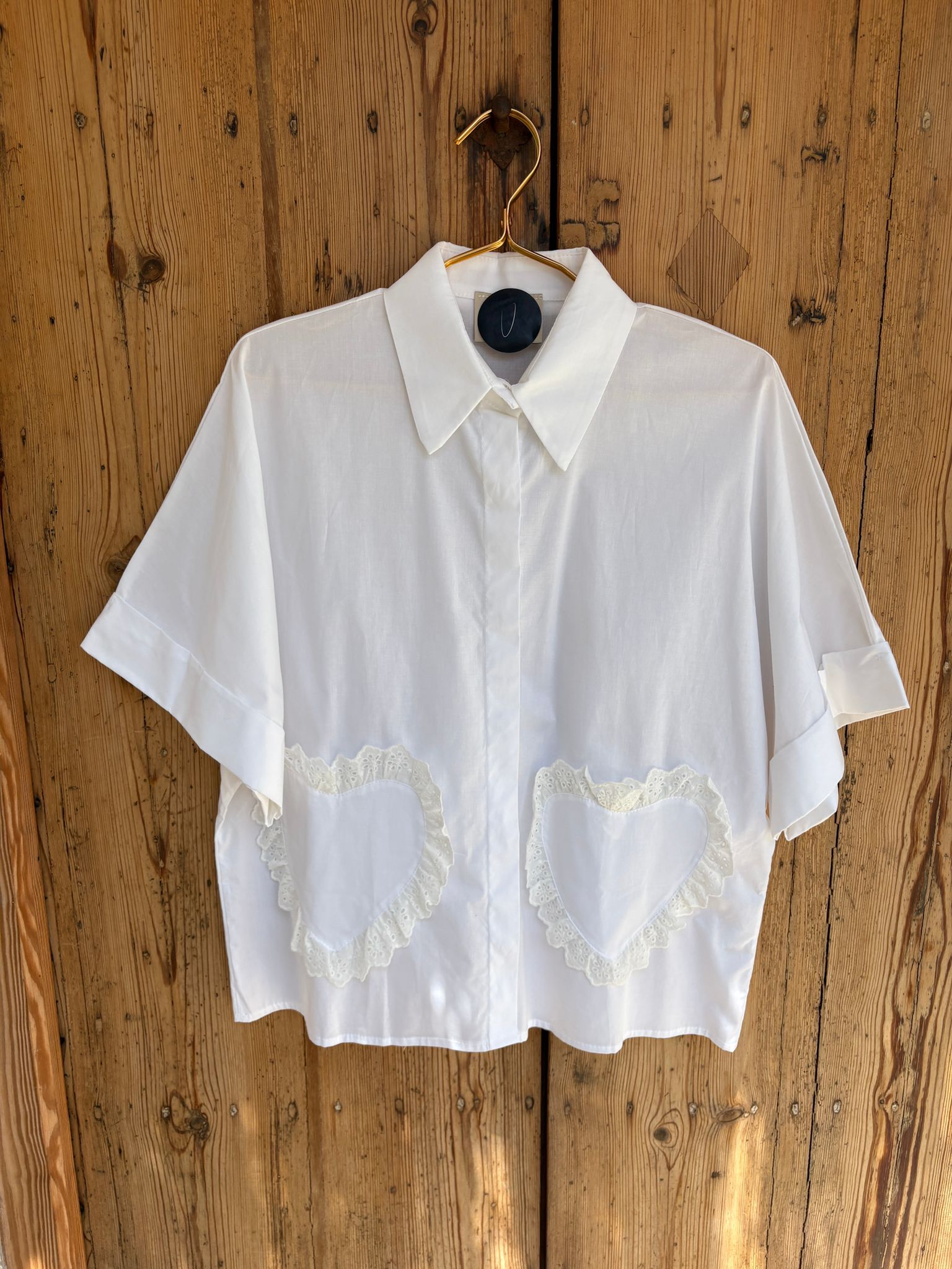 Camisa blanca oversize, corte clásico pero con un toque chic, bolsillos en forma de corazón decorados con encaje. Mangas cortas amplias y cuello estructurado.