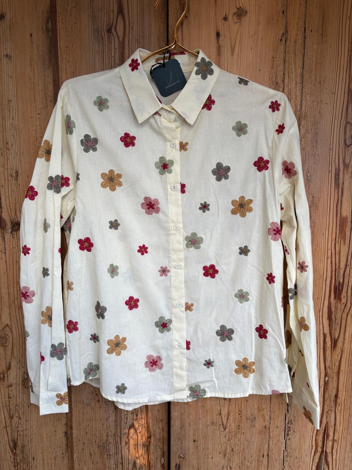 Camisa de corte básico en tono beige con detalle de flores bordadas. Manga larga y cuello camisero.
