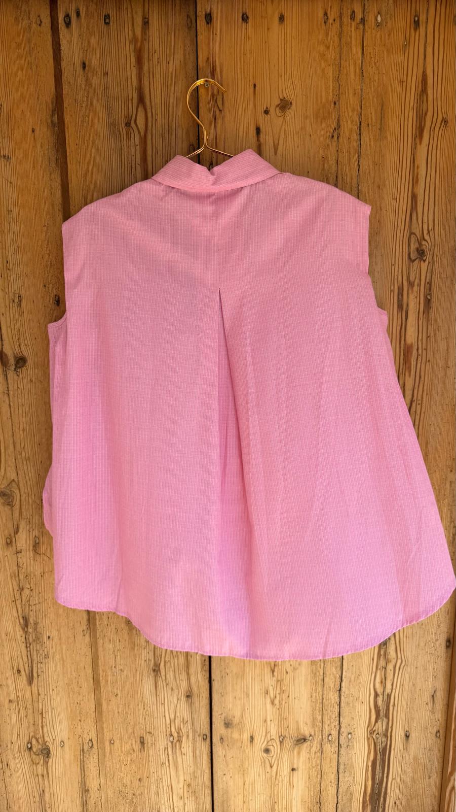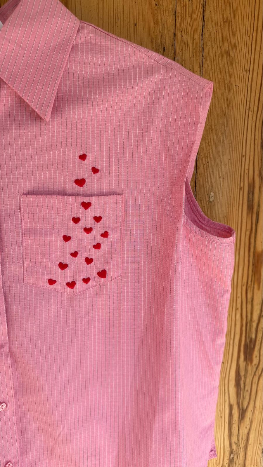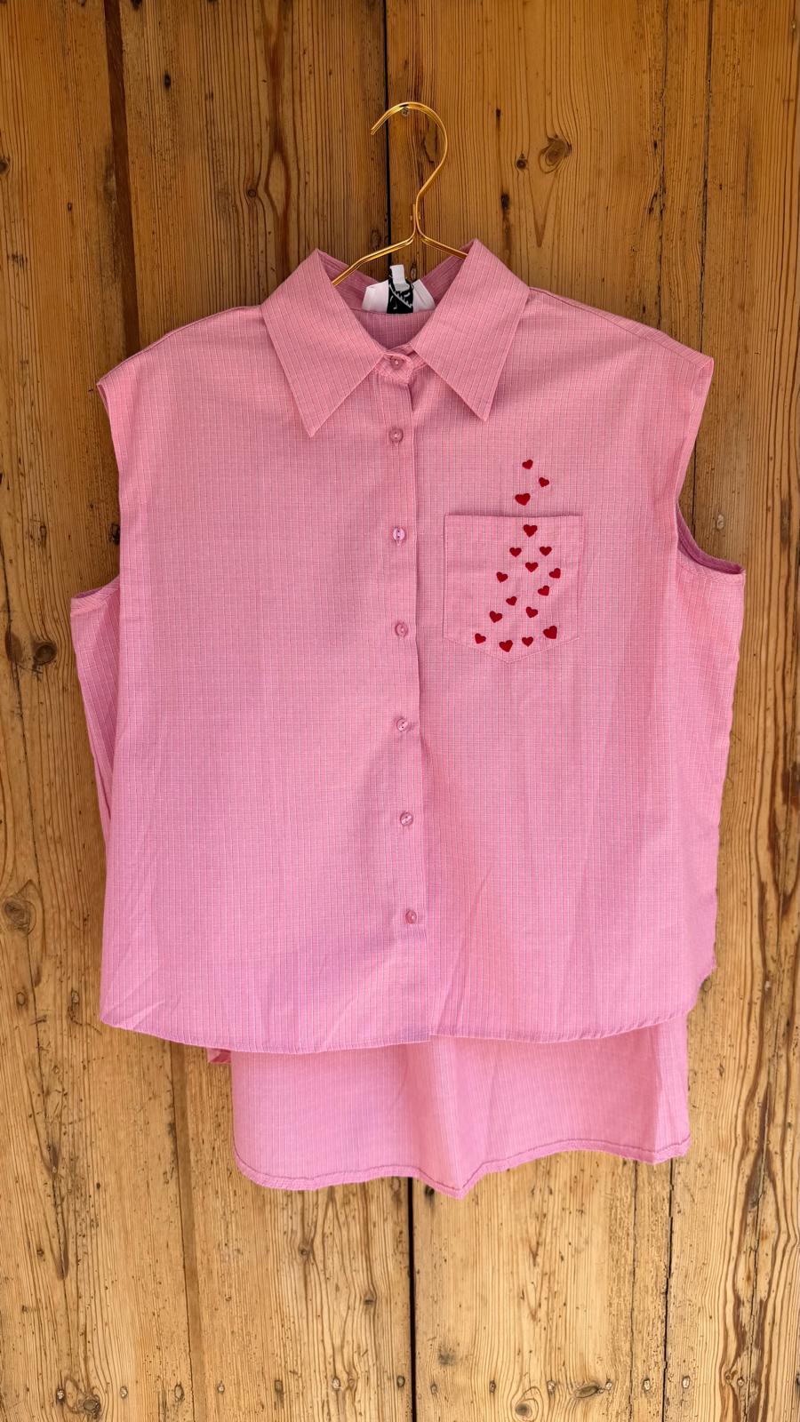 Camisa sin mangas con cuello clásico. Corte amplio y recto. Bolsillo delantero decorado con pequeños corazones.