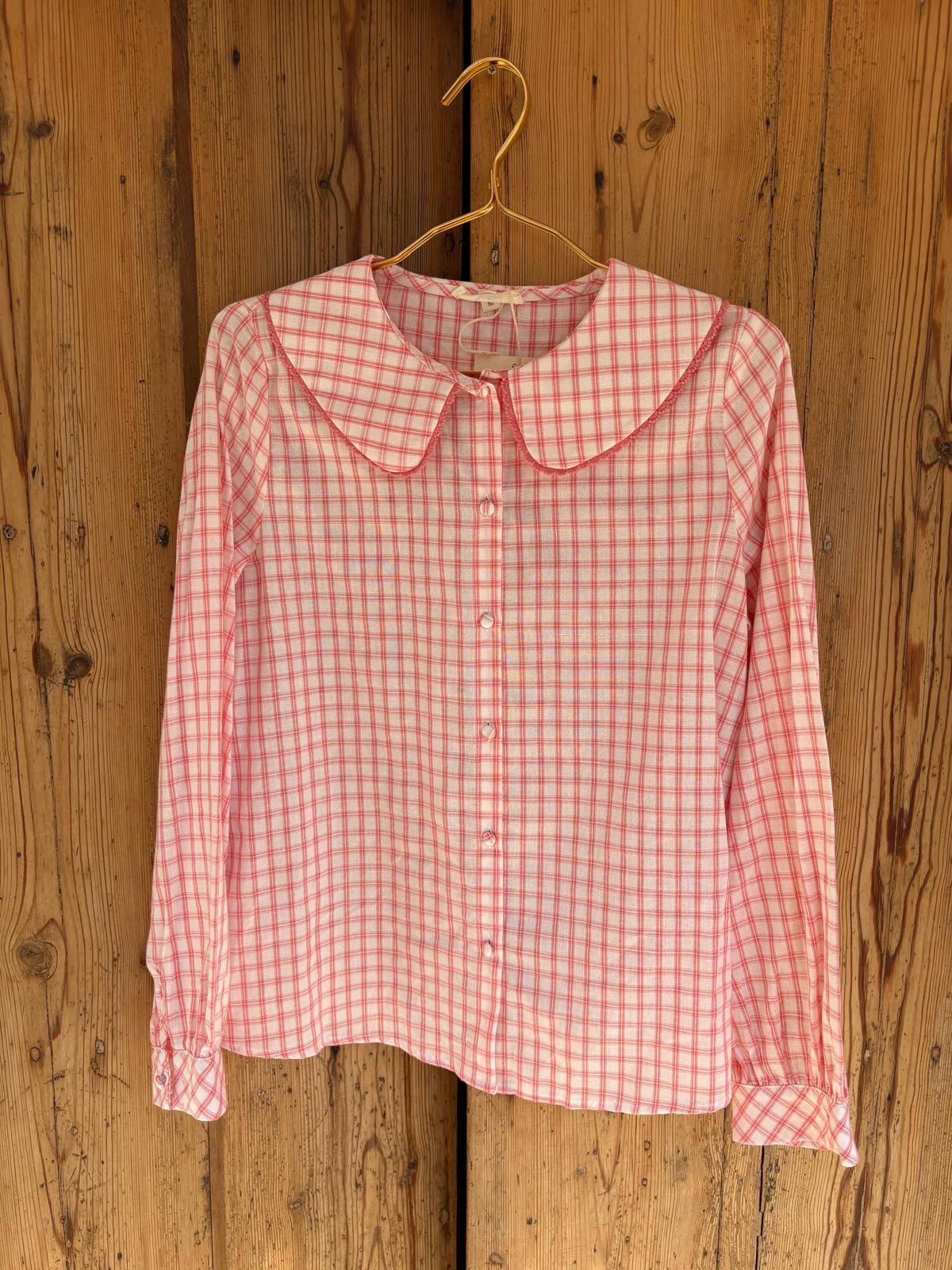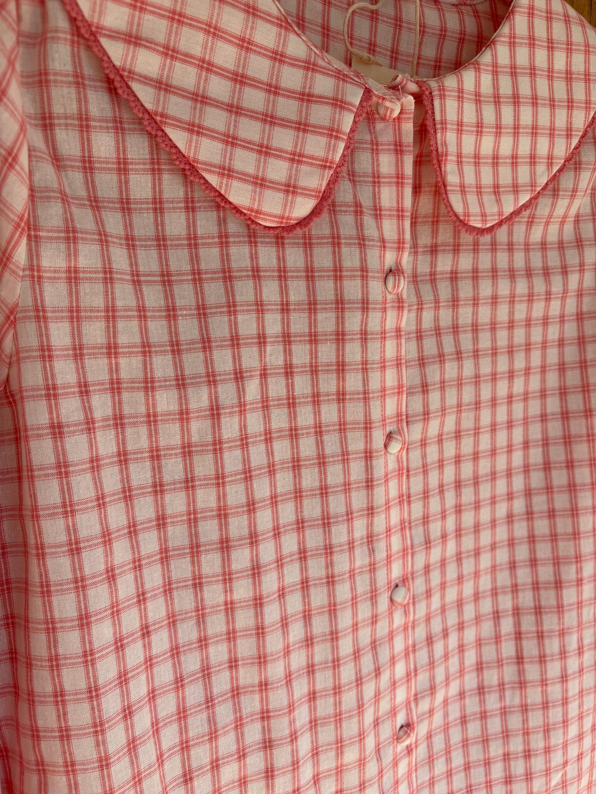 Camisa con tejido a cuadros y manga larga. Cuello redondeado con detalle de crochet.