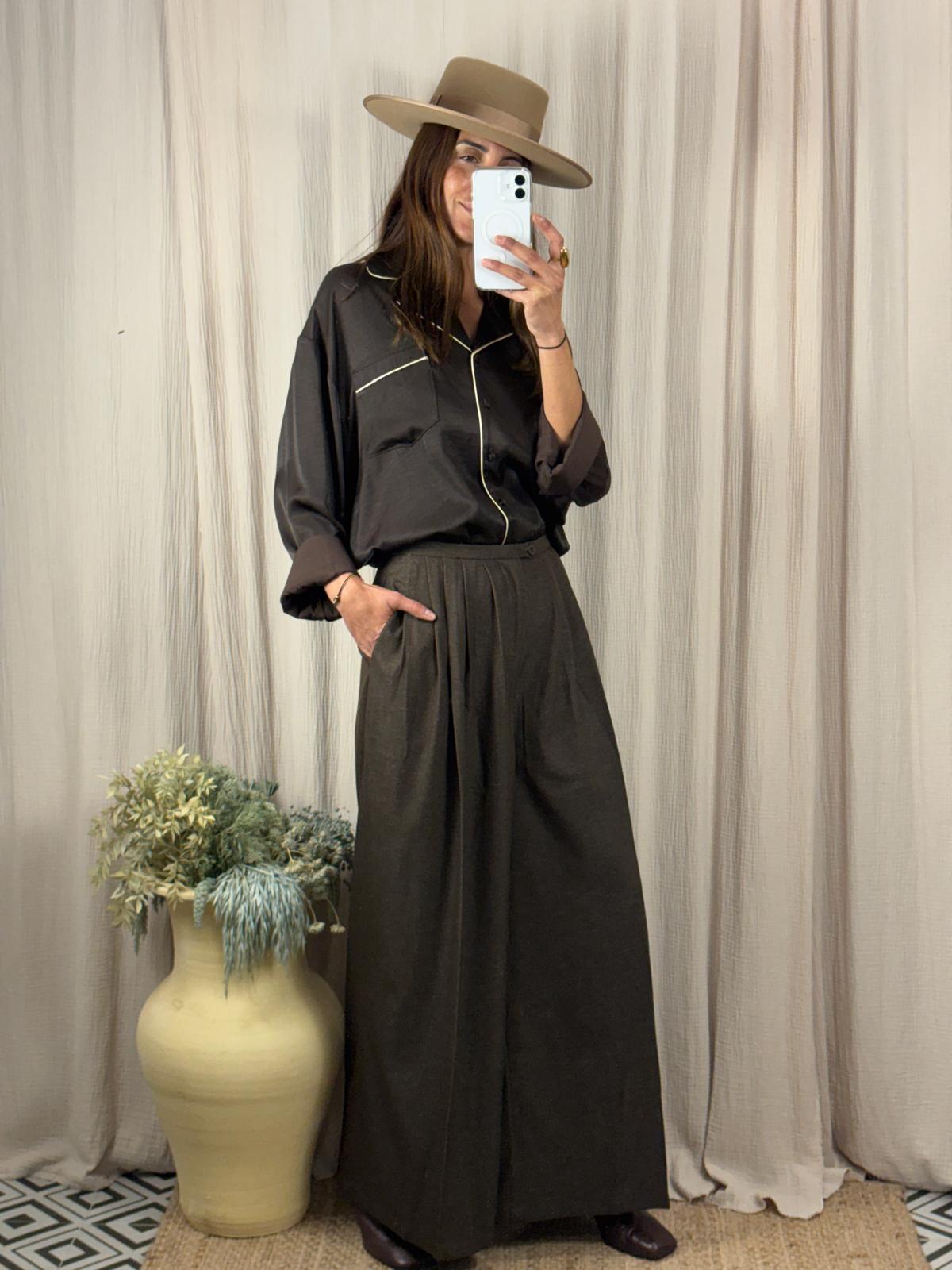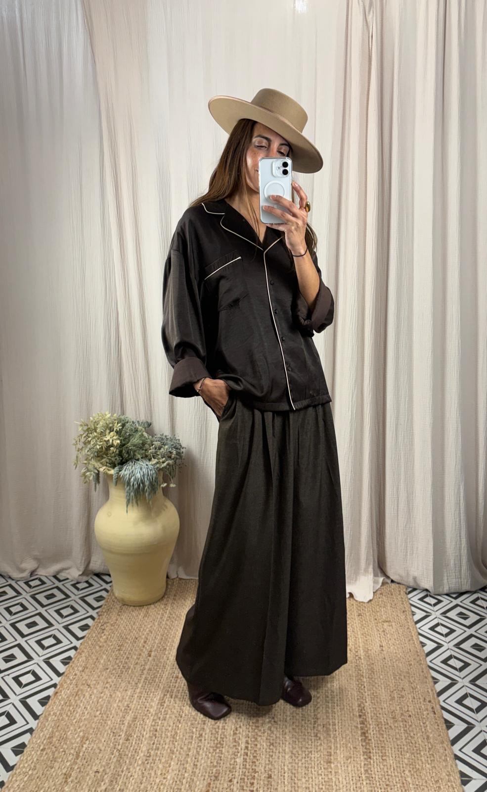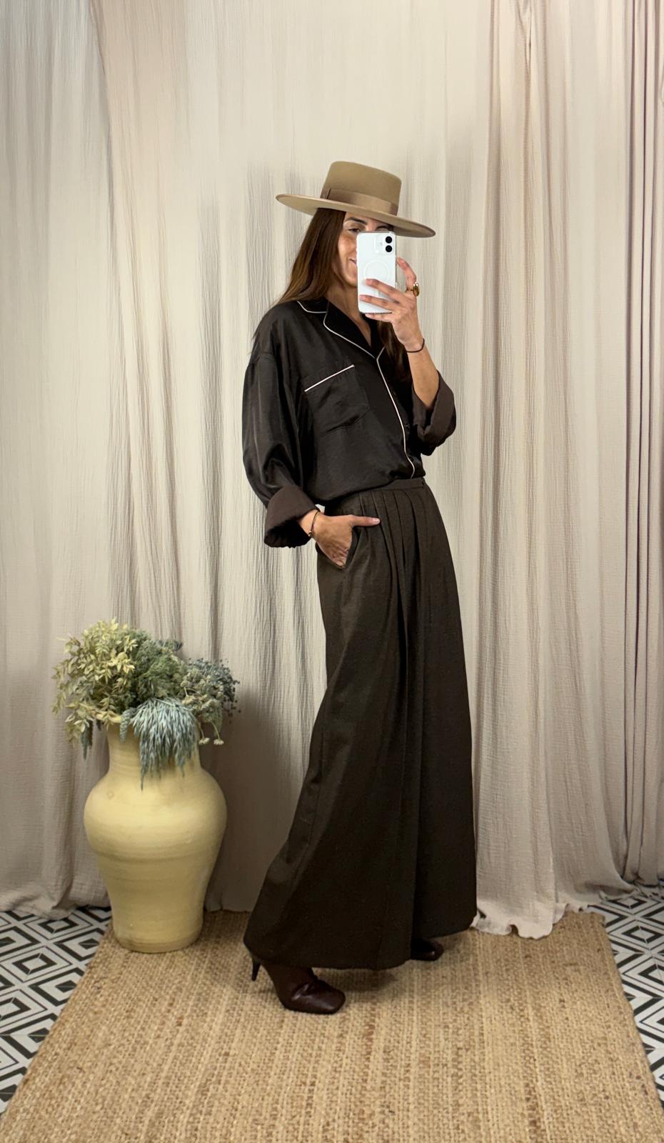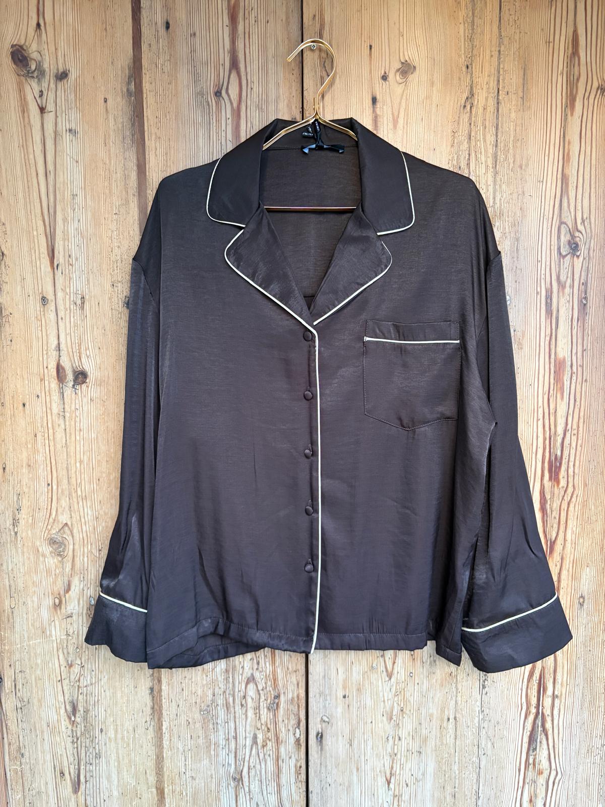 Camisa de estilo pijamero. Corte recto y fluido. Detalle de ribetes en color marfil que recorren el cuello, la tapeta frontal, el bolsillo y los puños. Botones forrados del mismo tejido. Mangas largas ligeramente amplias.