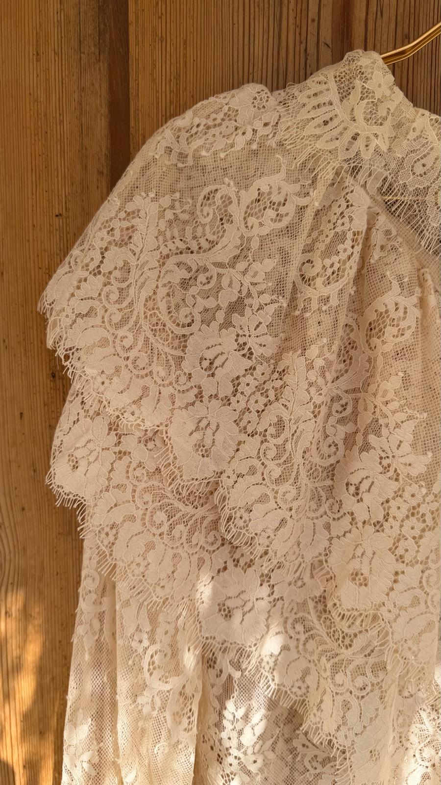 Camisa de encaje con estilo romántico. Volante superior que cubre los hombros y el pecho aportando un aire bohemio. Puño con elástico.