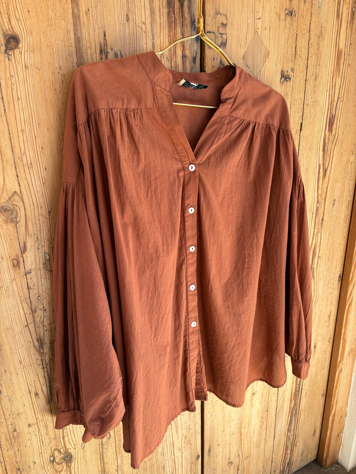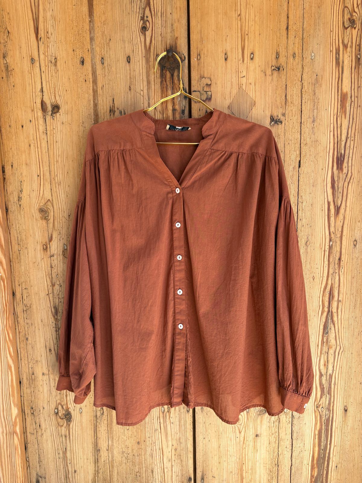 Camisa de manga larga y abullonadas, escote en V con cuello mao. De estilo amplio y fluido con caída recta.