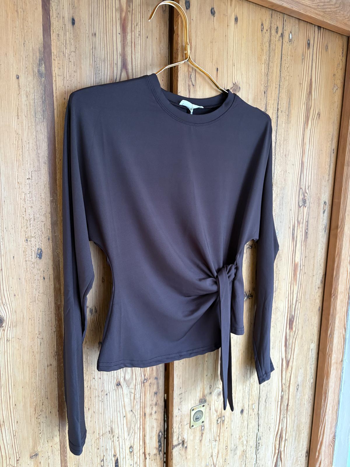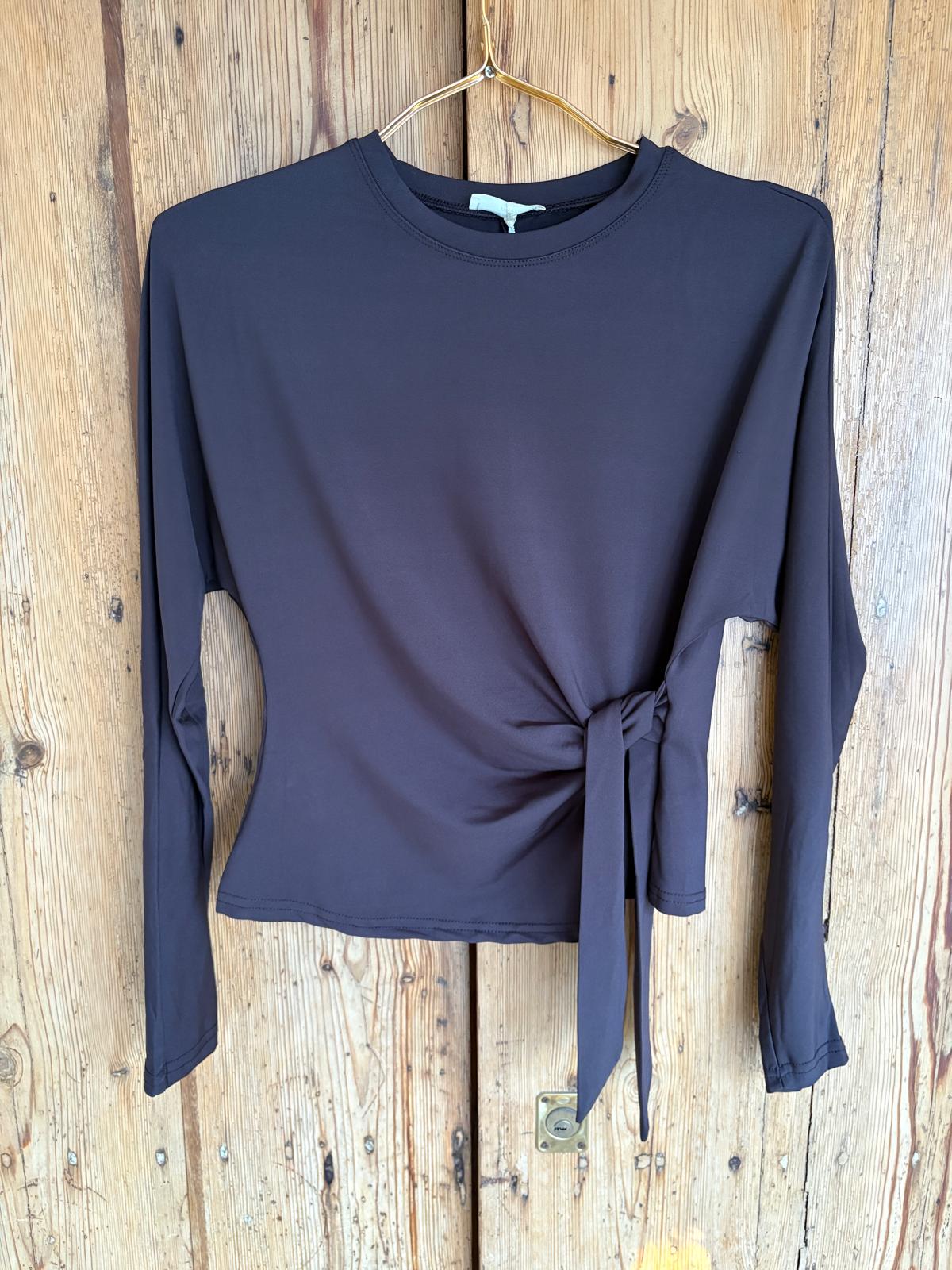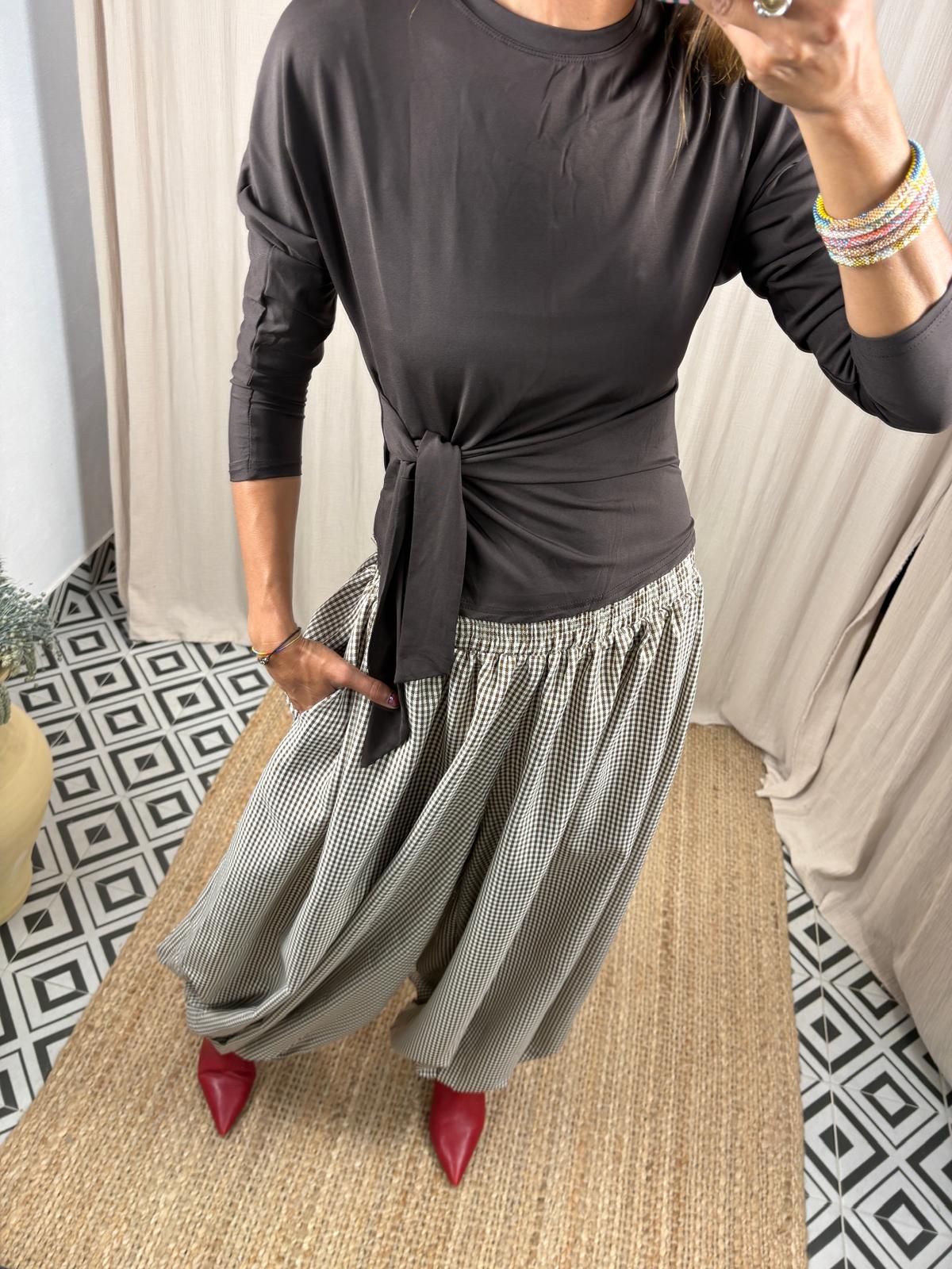 Camiseta de manga murciélago y cuello redondo. Detalle de lazo para anudar en el lateral.