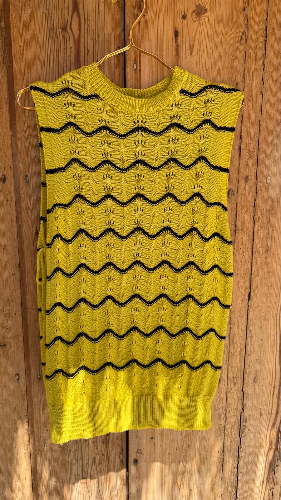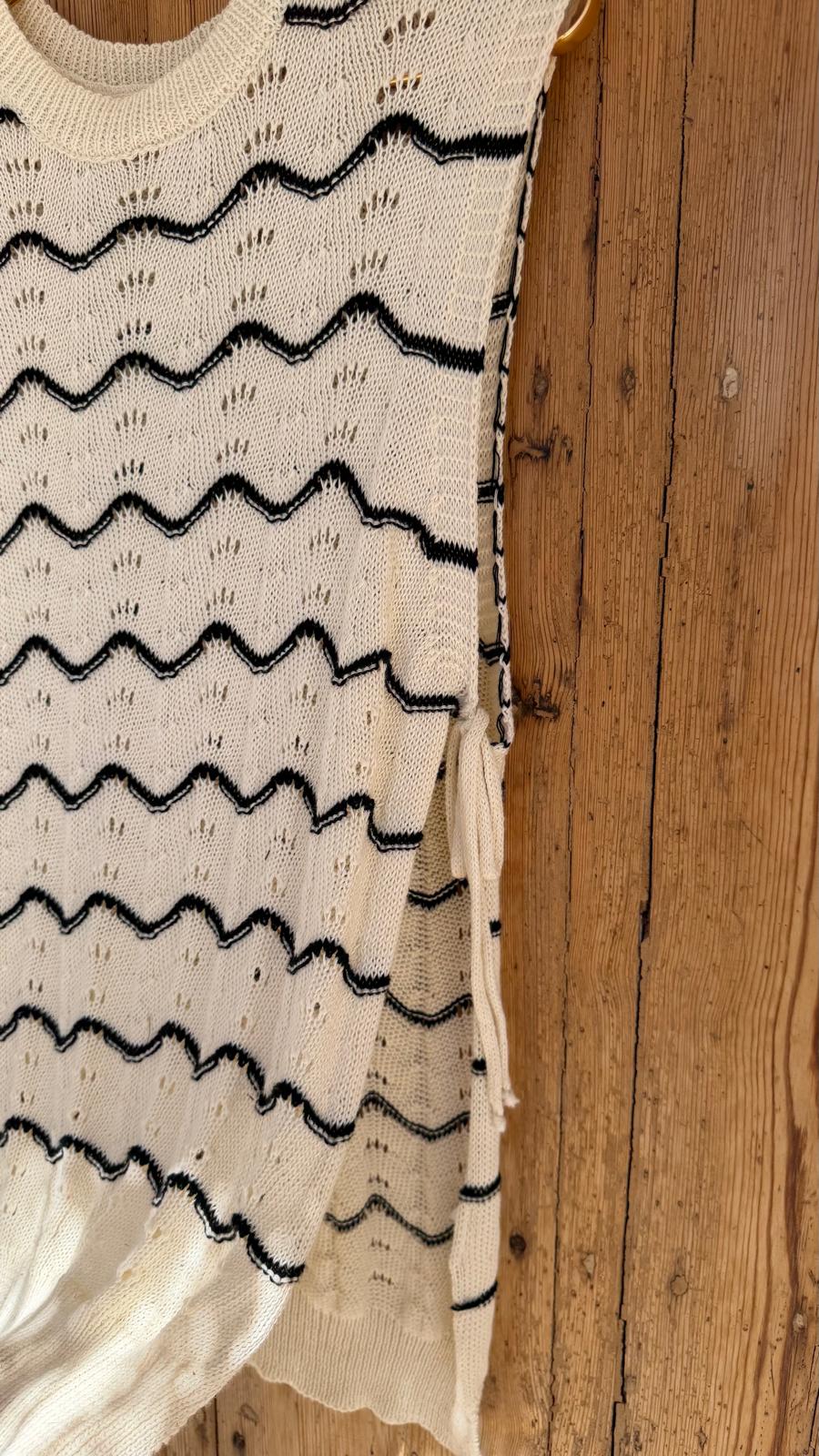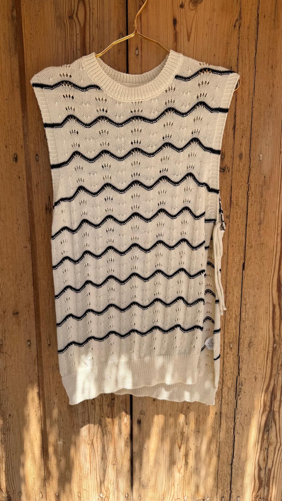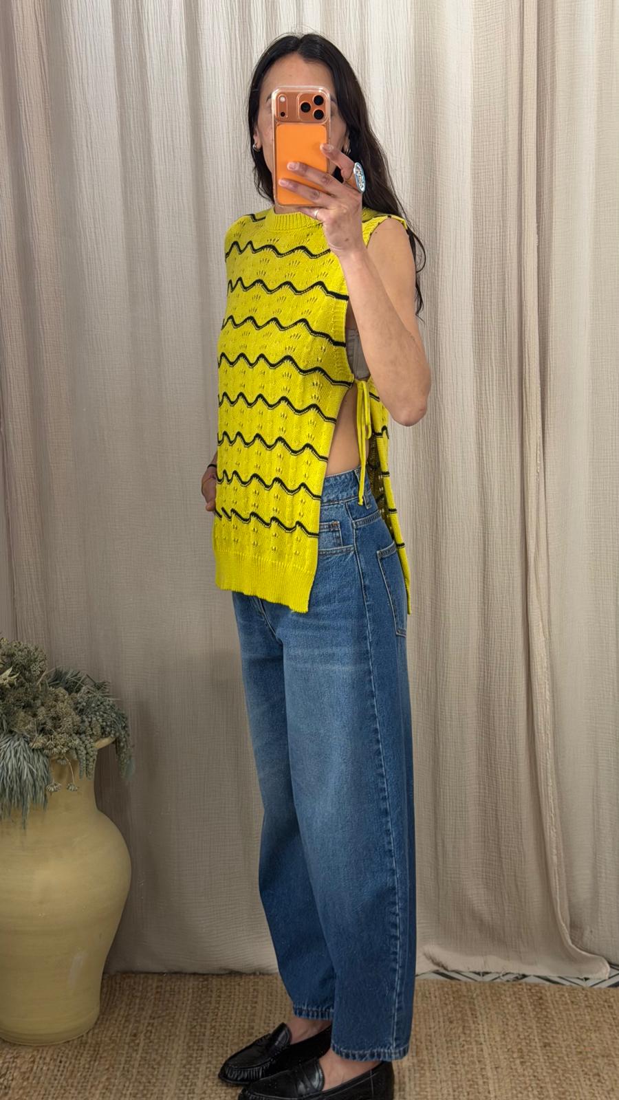 Chaleco en hilo fino sin mangas. Cuello redondo. Corte suelto. Laterales abiertos con lazos ajustables. Largo a la cadera.