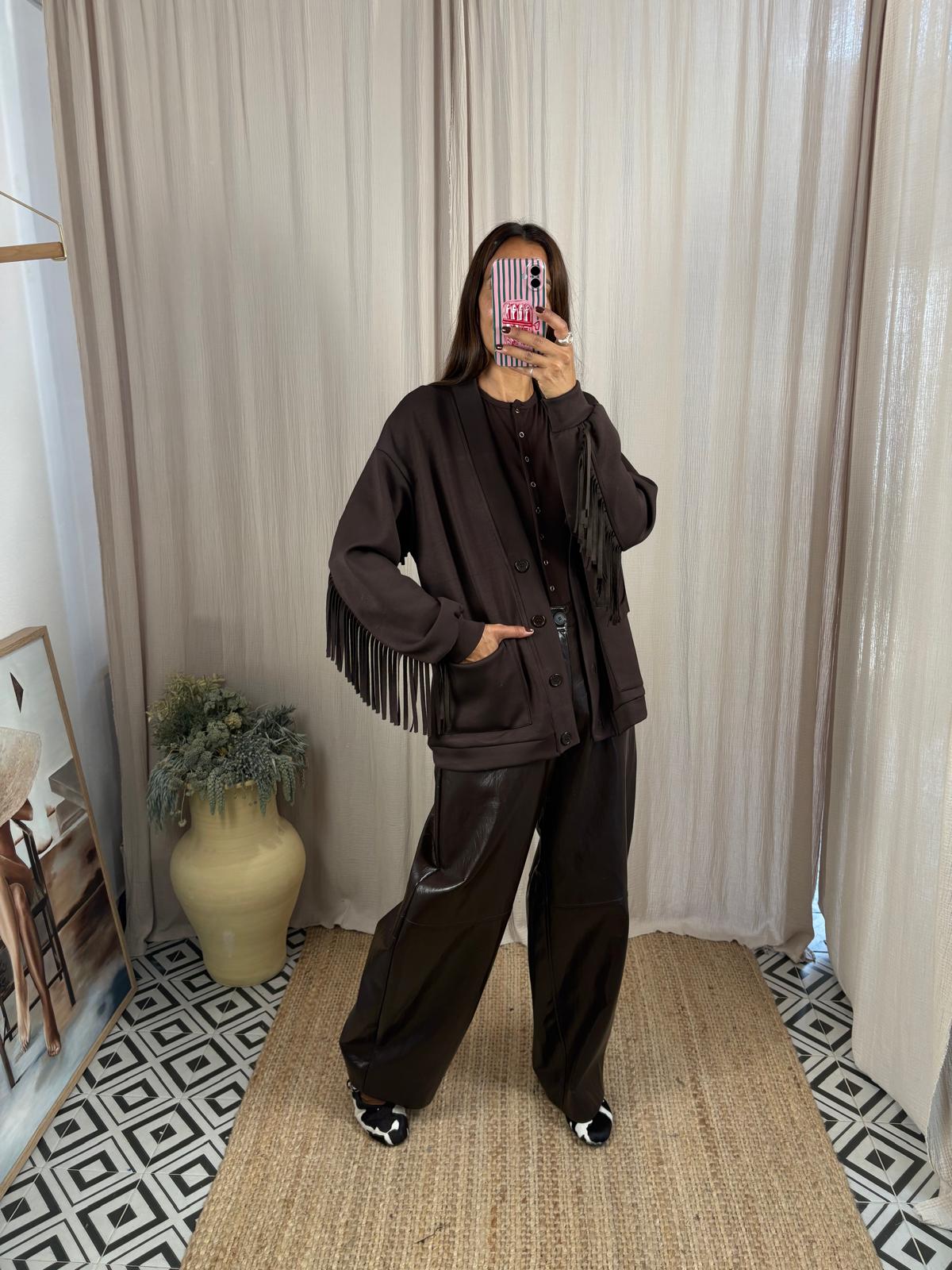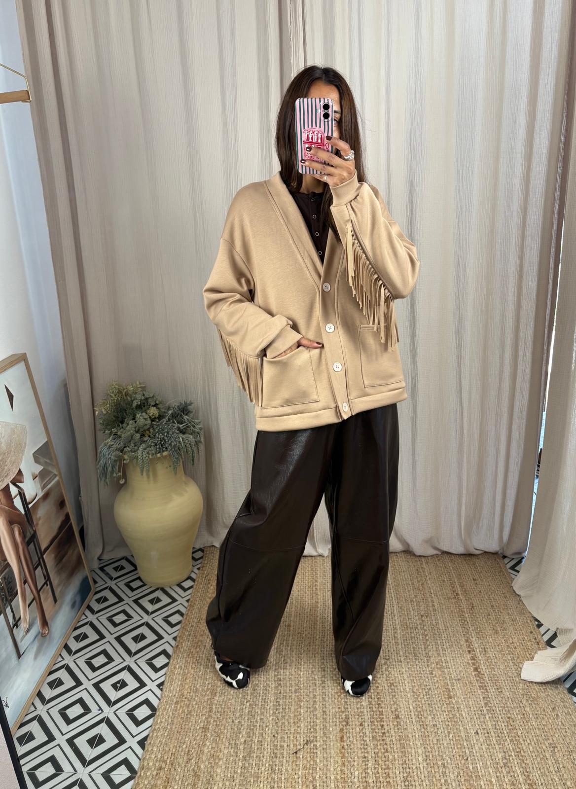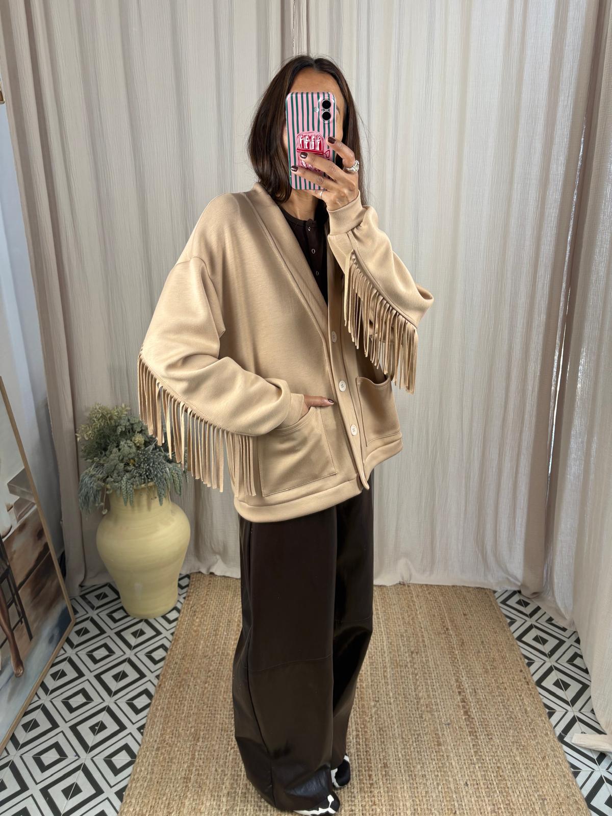 Chaqueta de corte holgado y recto. Silueta oversize. Cierre con botones en la parte delantera. Detalle de flecos.