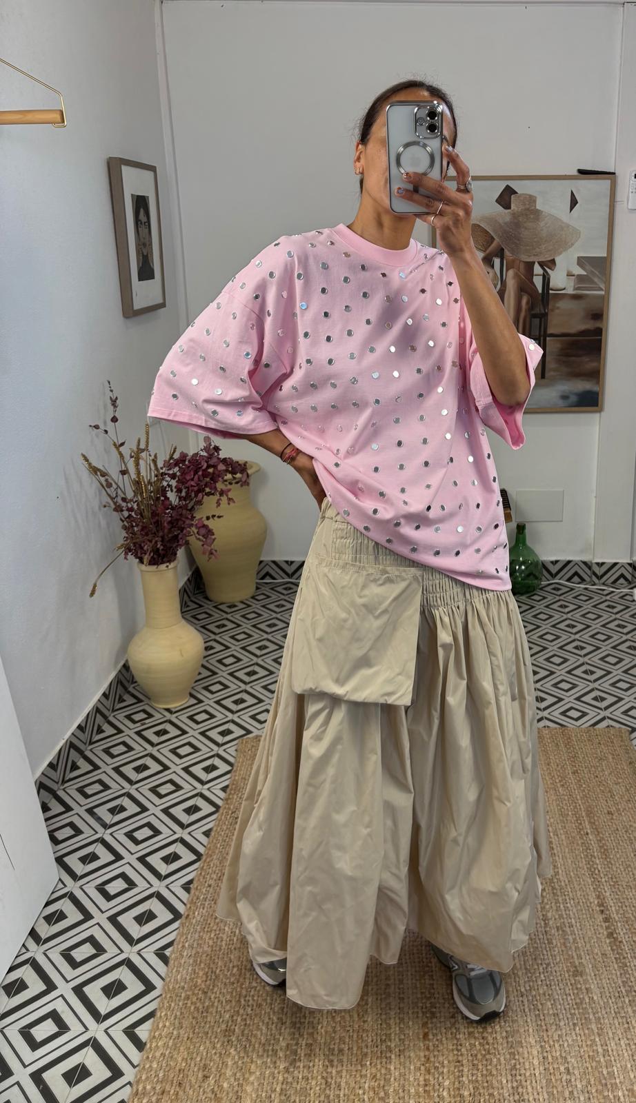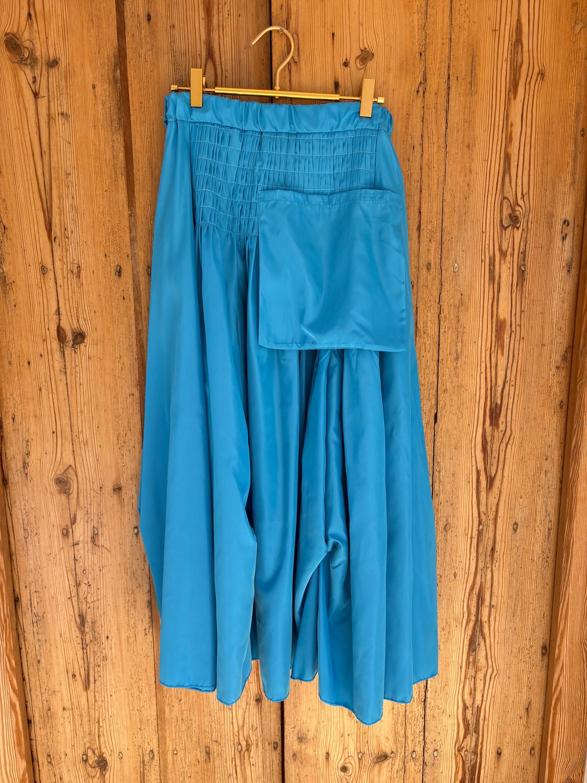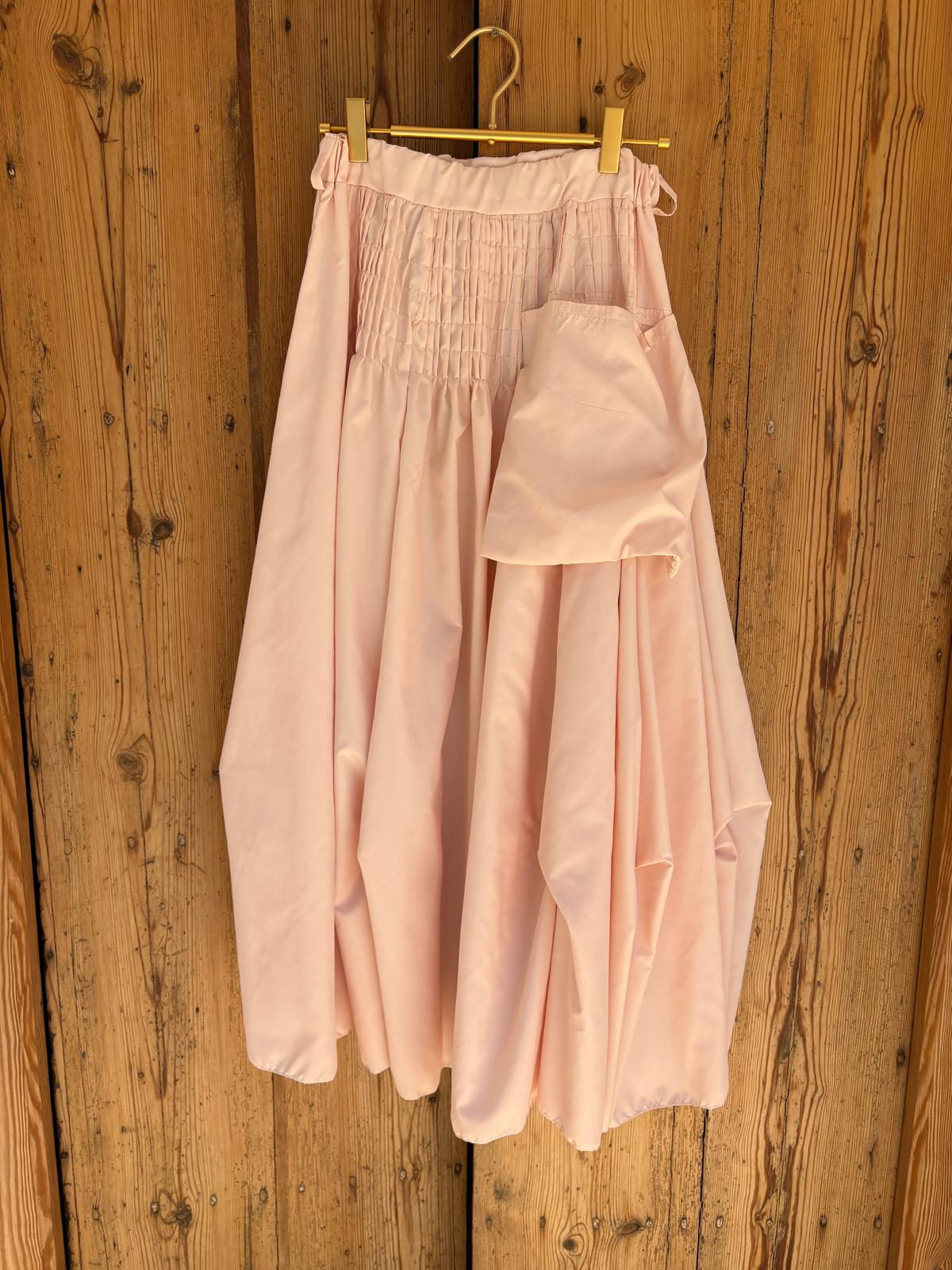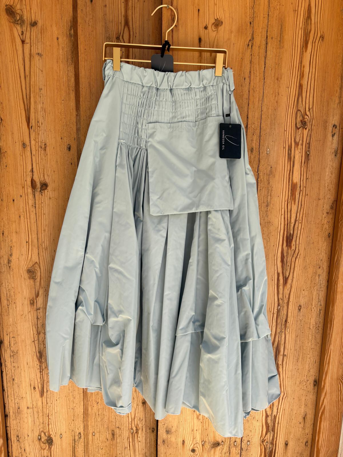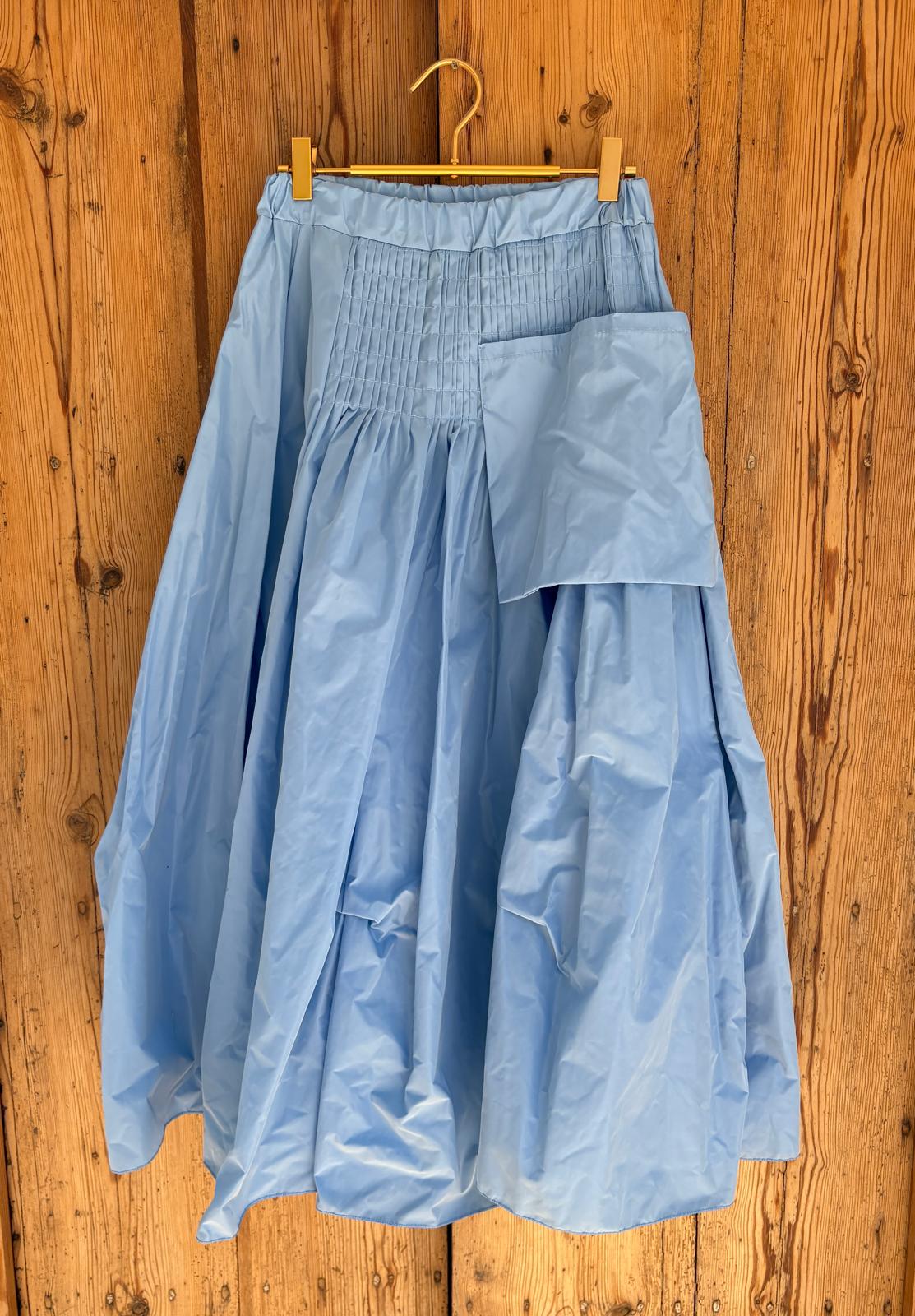 Falda con volumen,tejido similar al tafetán. Detalle de fruncidos verticales en el centro, amplia y con bolsillo grande en el lateral.