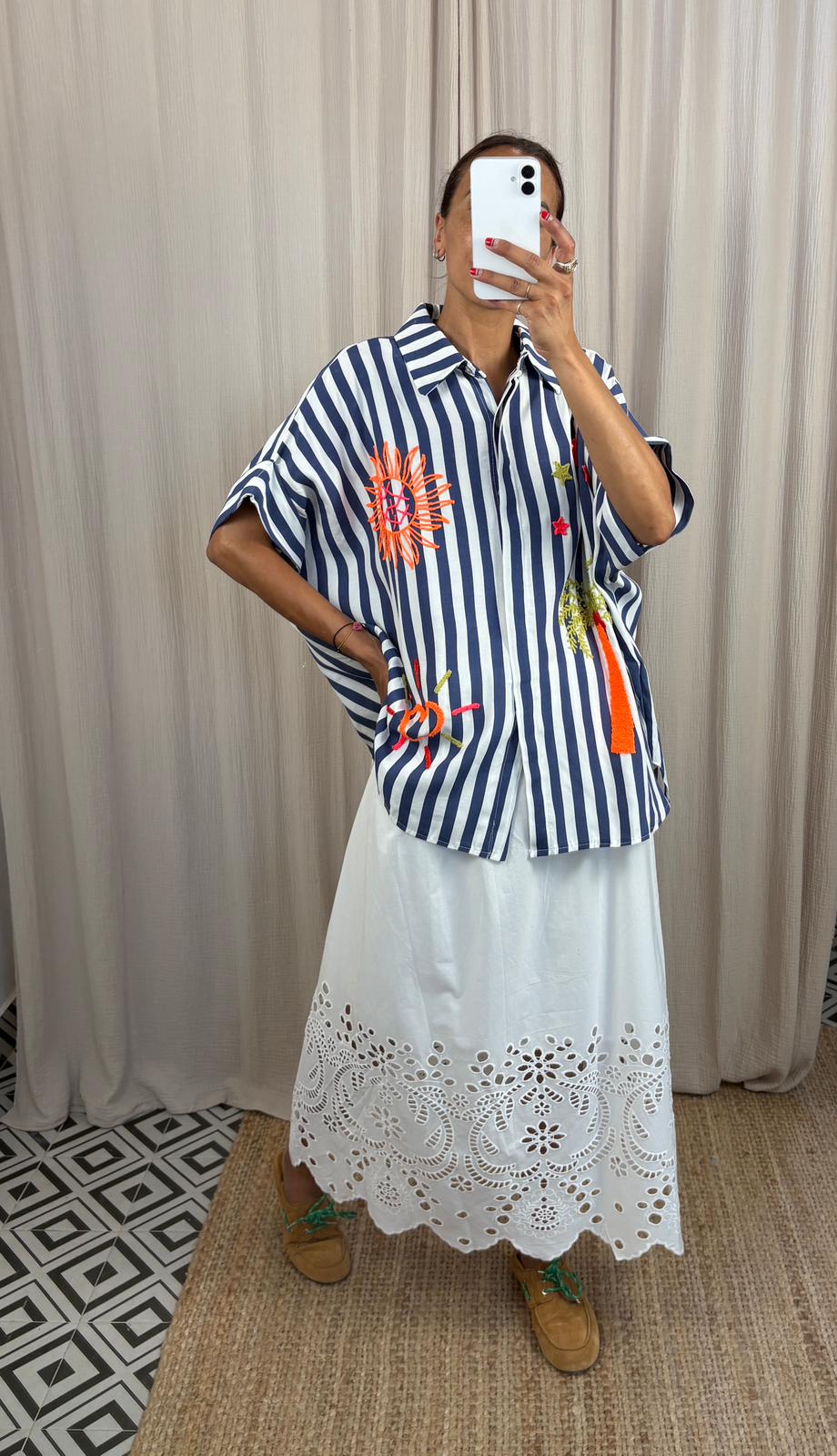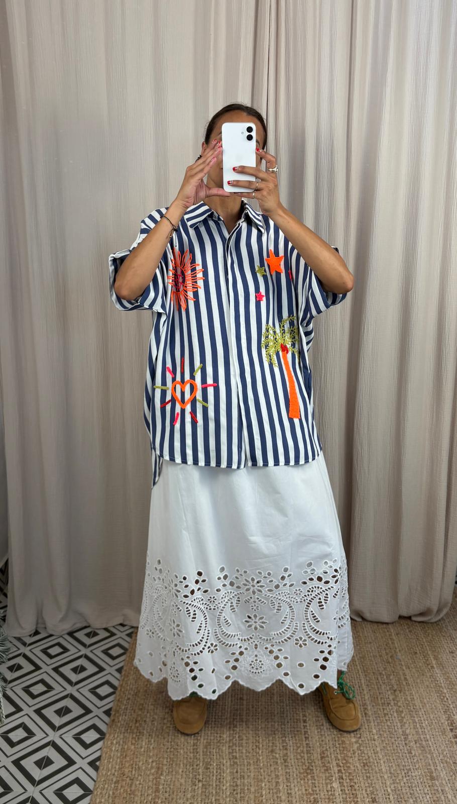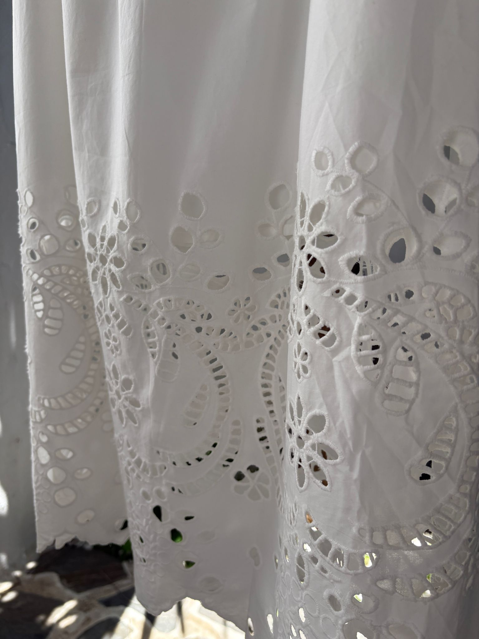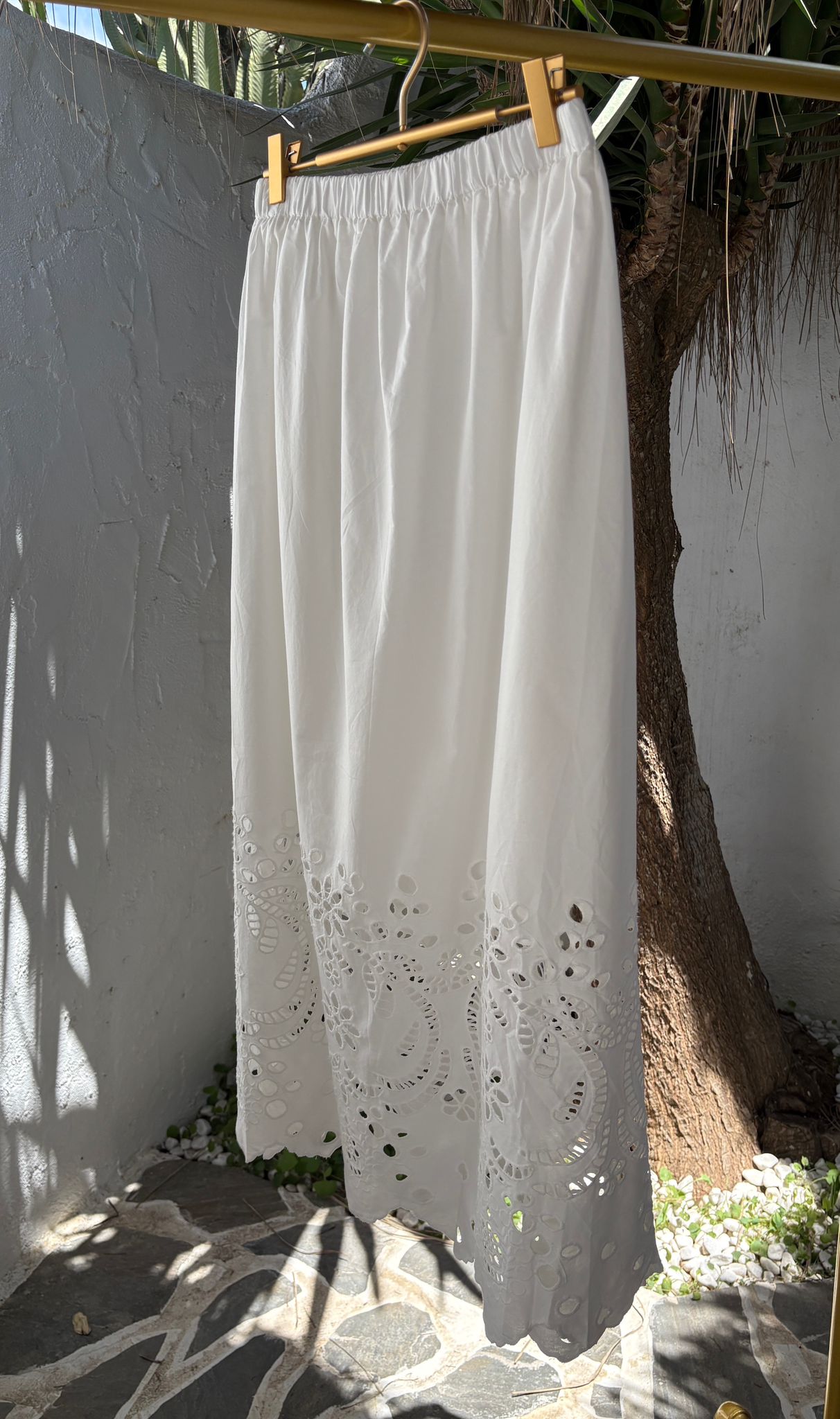 Falda con diseño romántico y veraniego, detalle decorativo en la parte inferior con bordado calado. Cintura elástica. Ideal para looks relajados y elegantes.