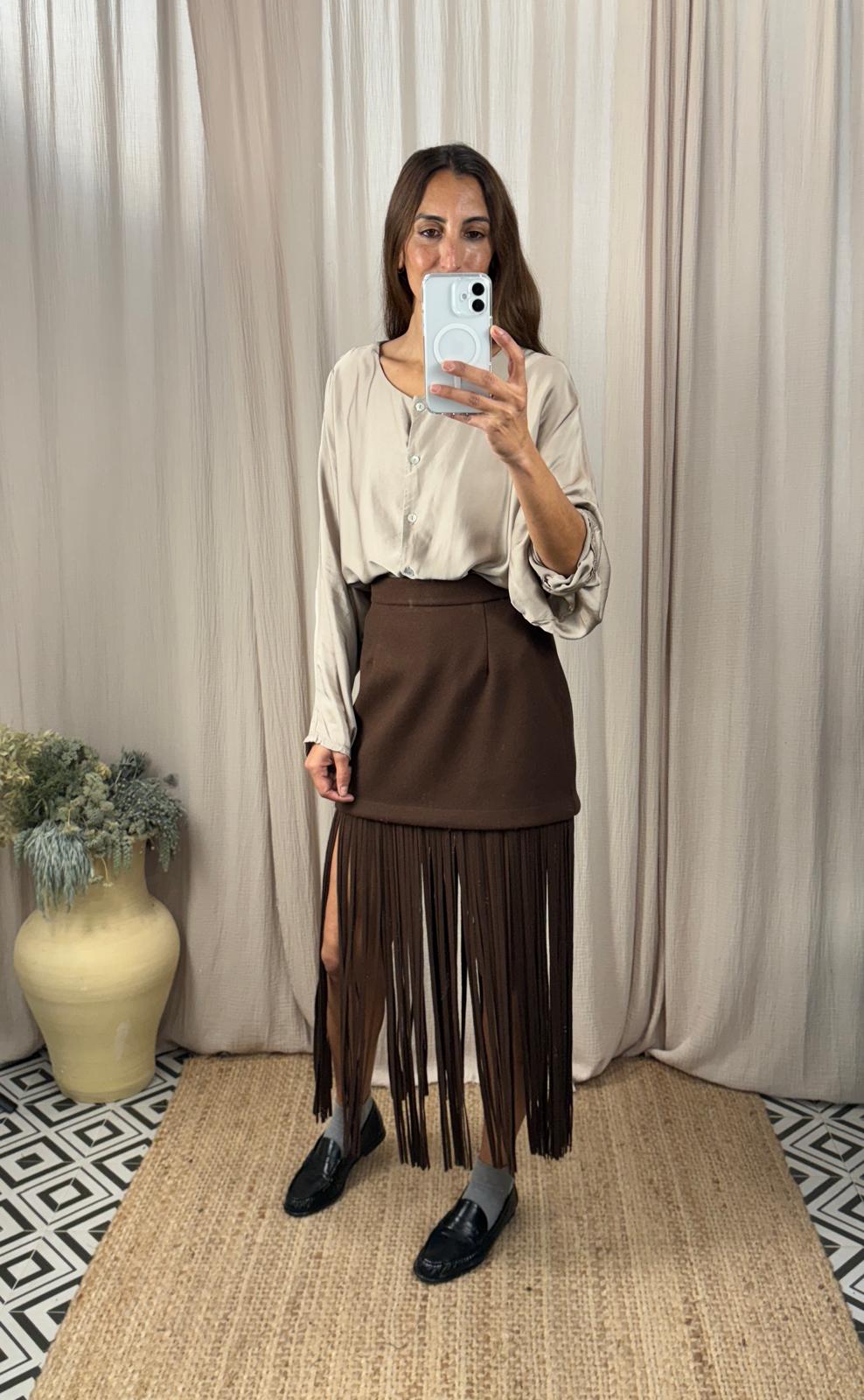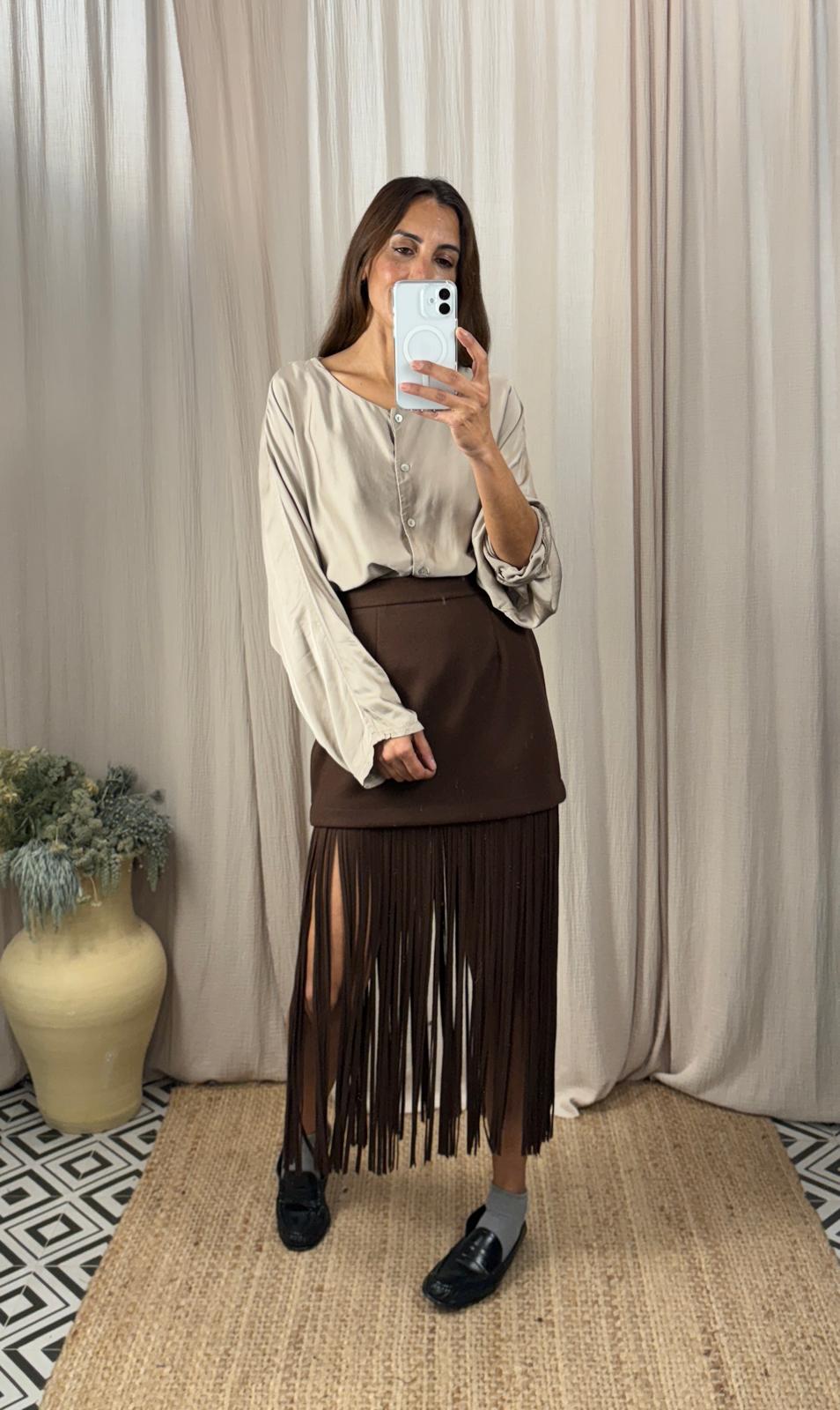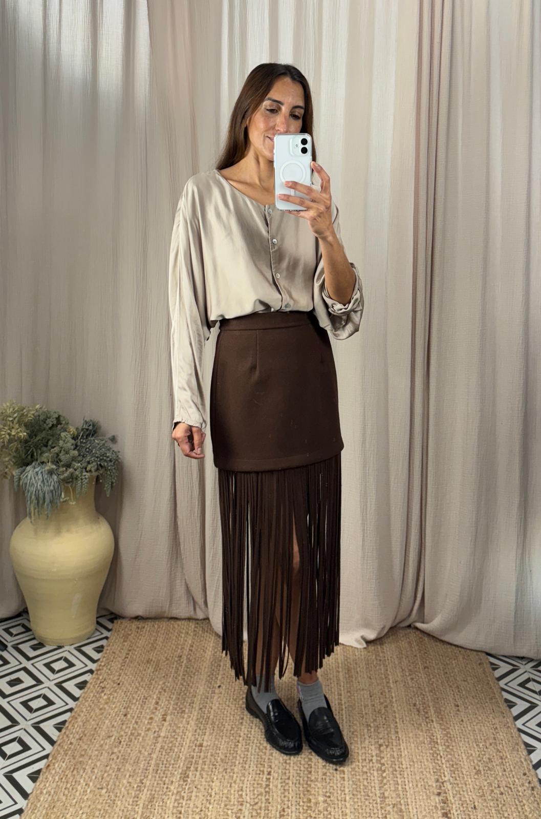 Falda ajustada y lisa. De aire boho, con flecos a la altura del muslo hasta media pierna aprox.