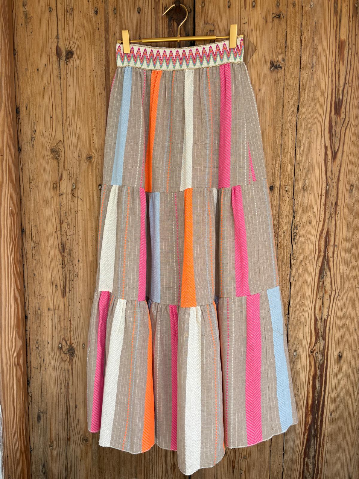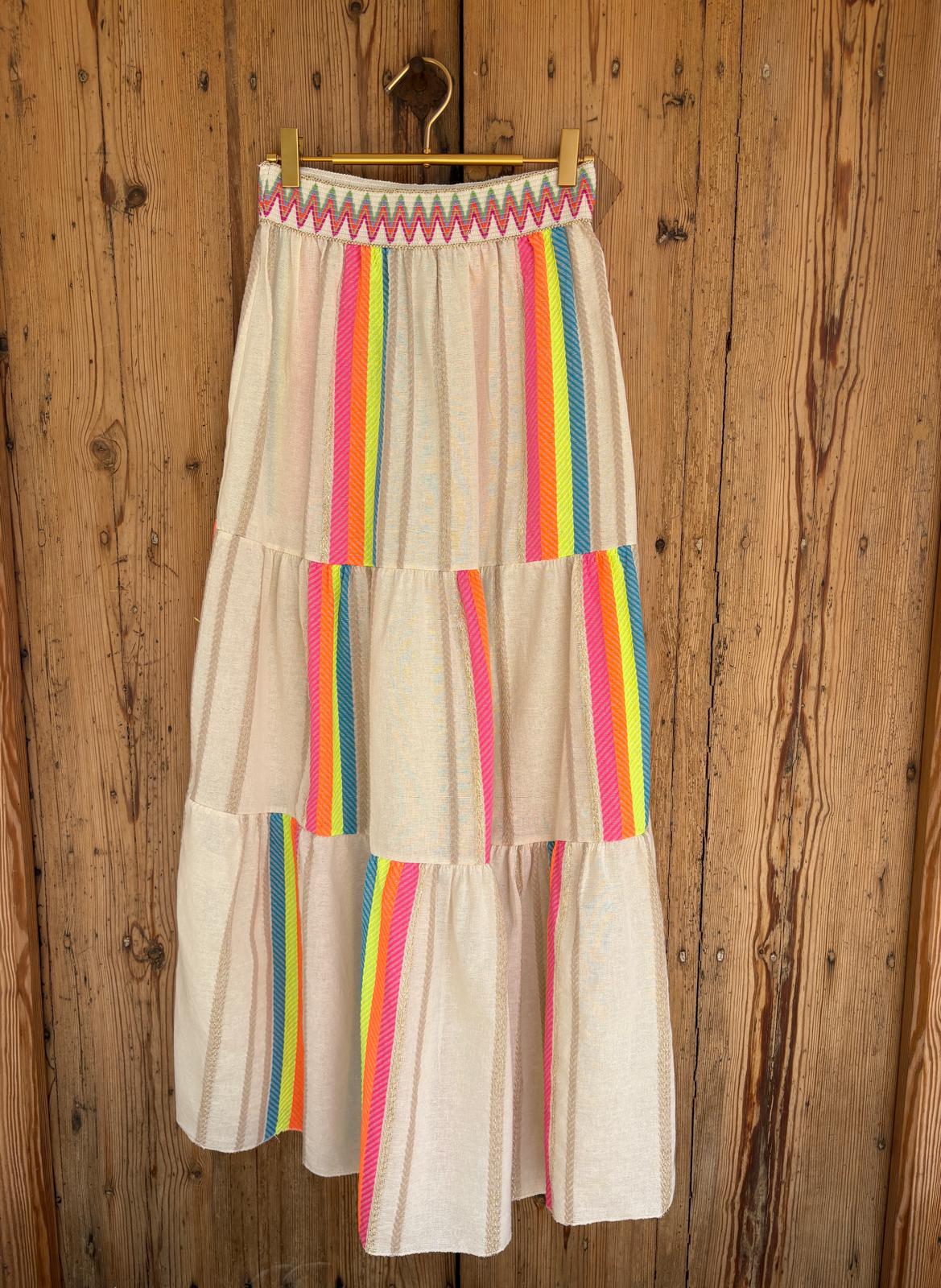 Falda larga de estilo bohemio, en tono crudo o beige. Franjas coloridas e hilos dorados que le dan un aire alegre. Disponible en varios tonos.