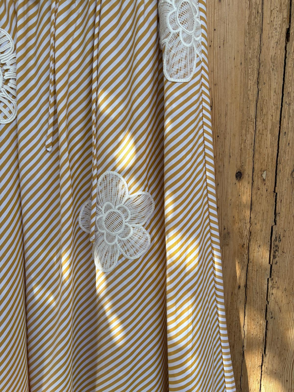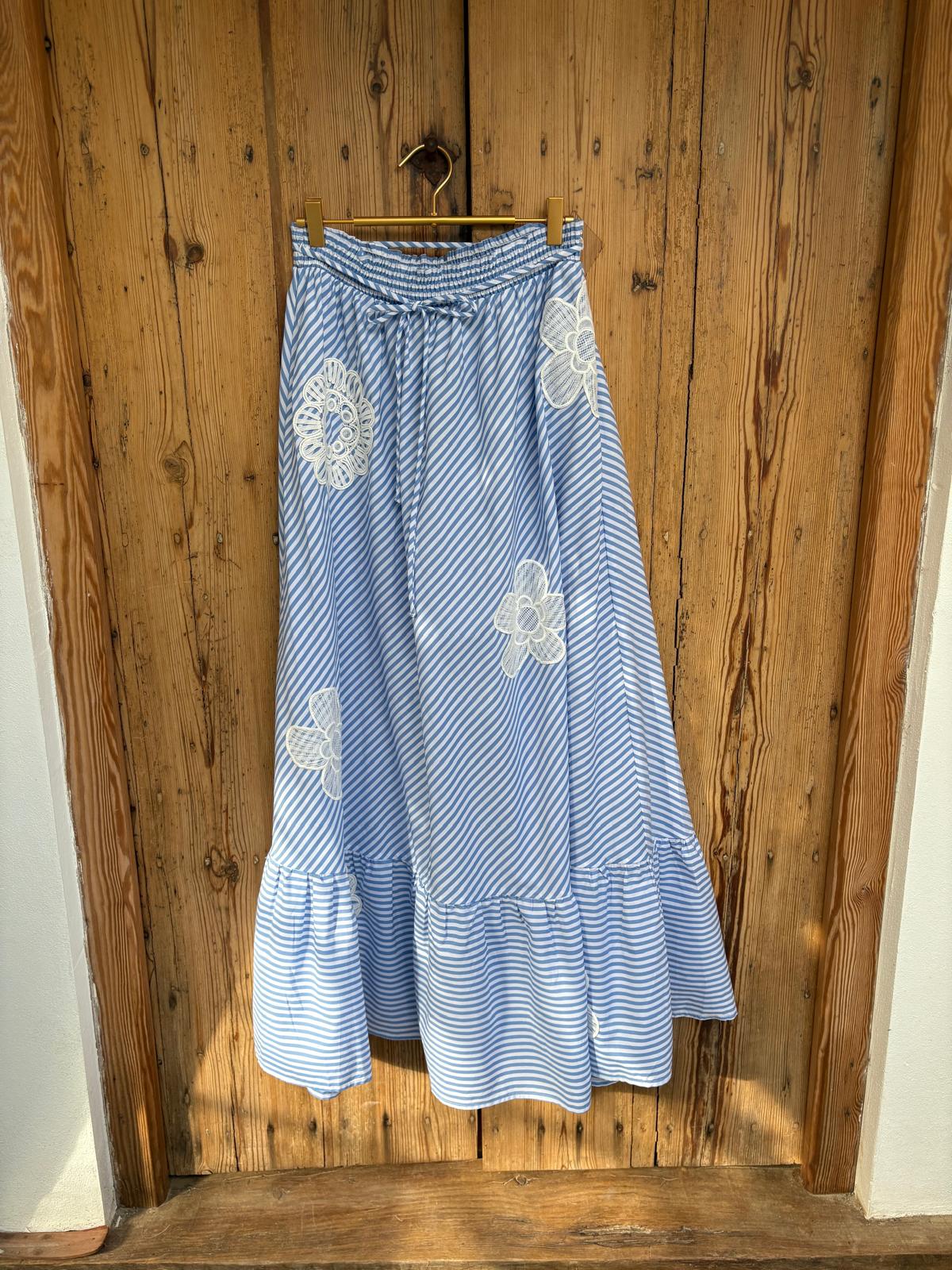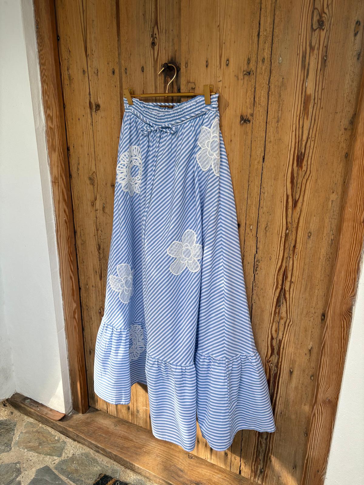 Falda midi de corte fluido, tela de rayas con apliques florales añadiendo un toque romántico. Volante en el dobladillo inferior que le da volumen y movimiento. Cintura elástica con cordón ajustable.