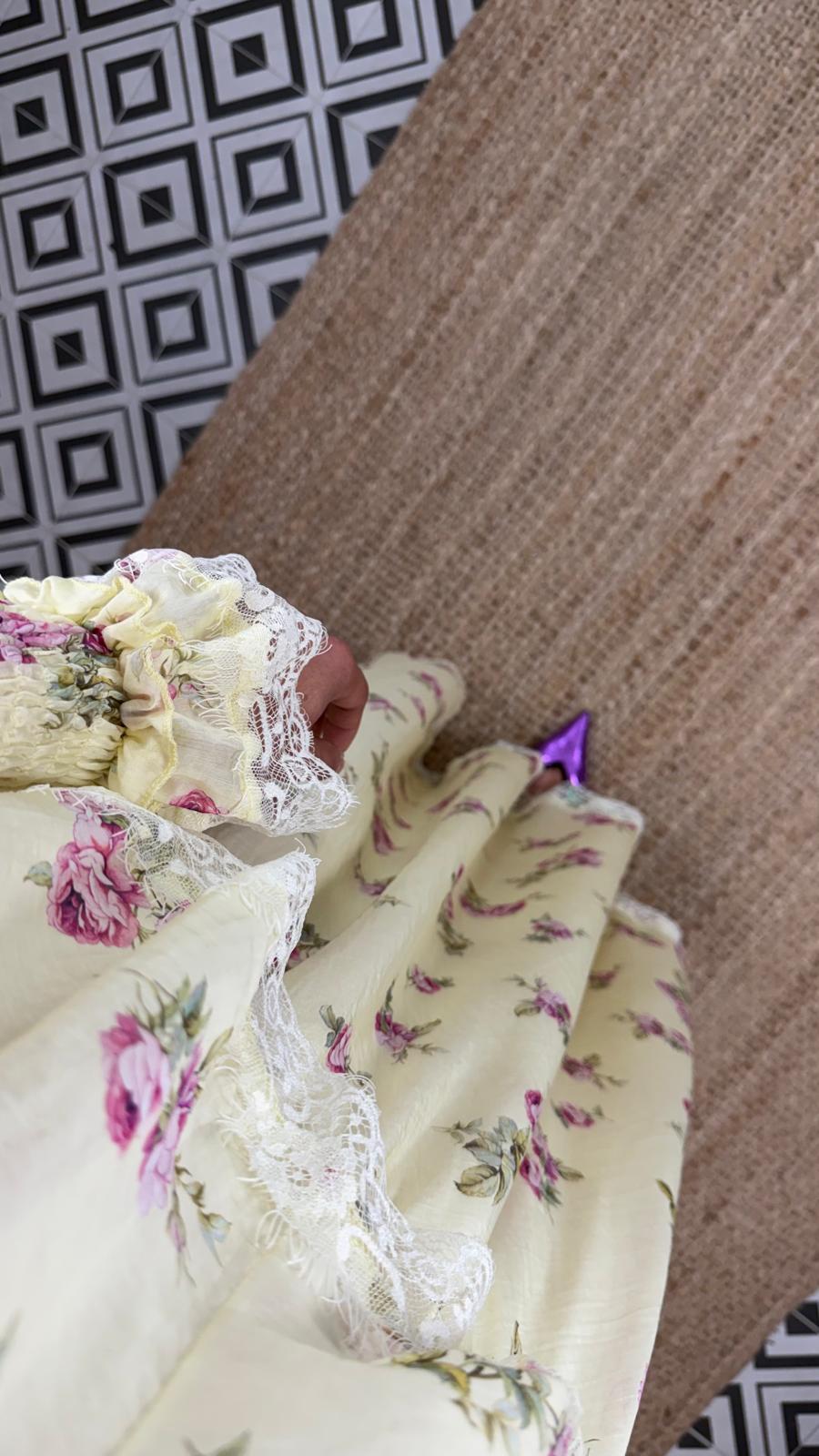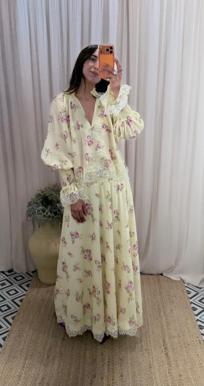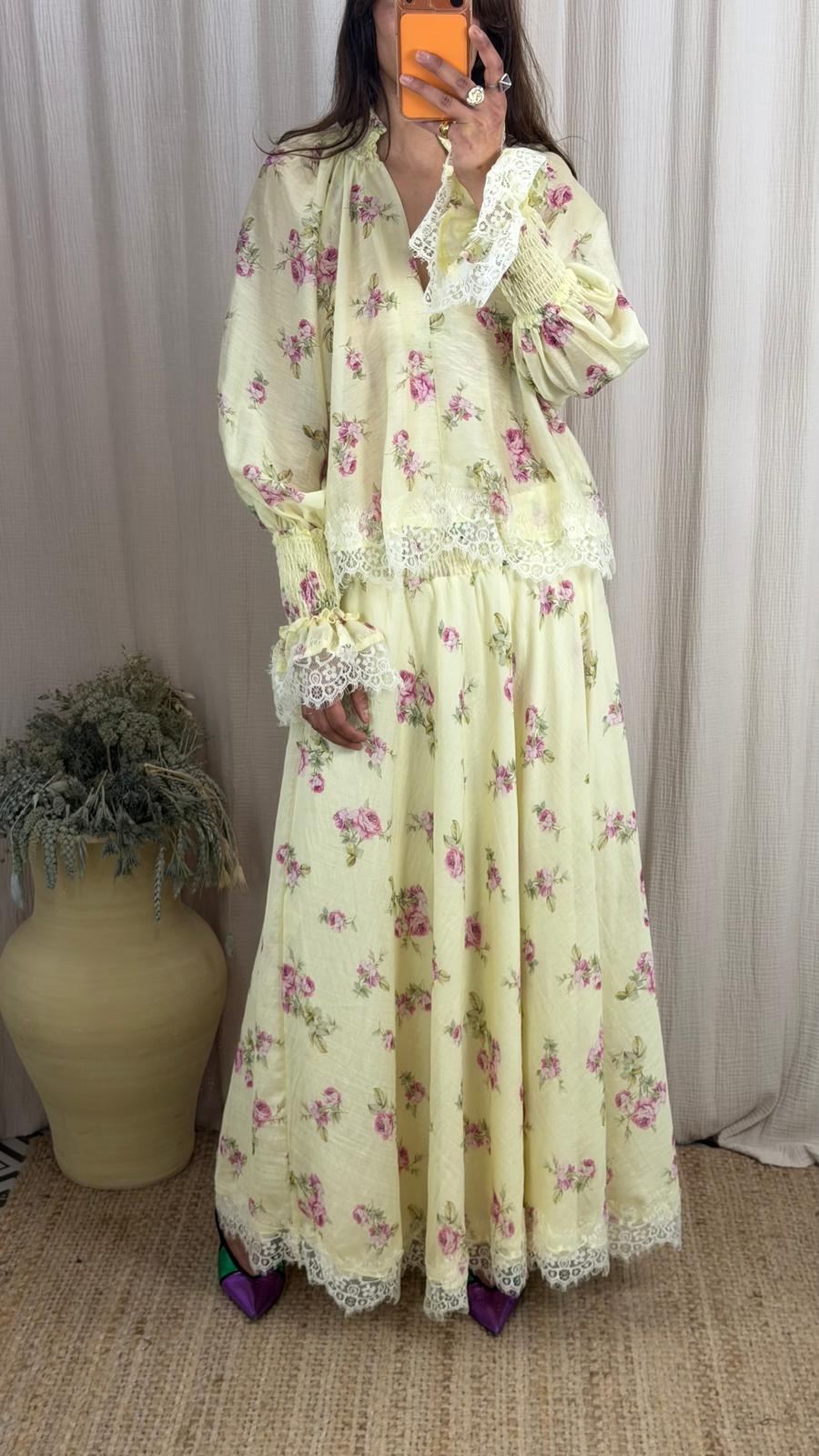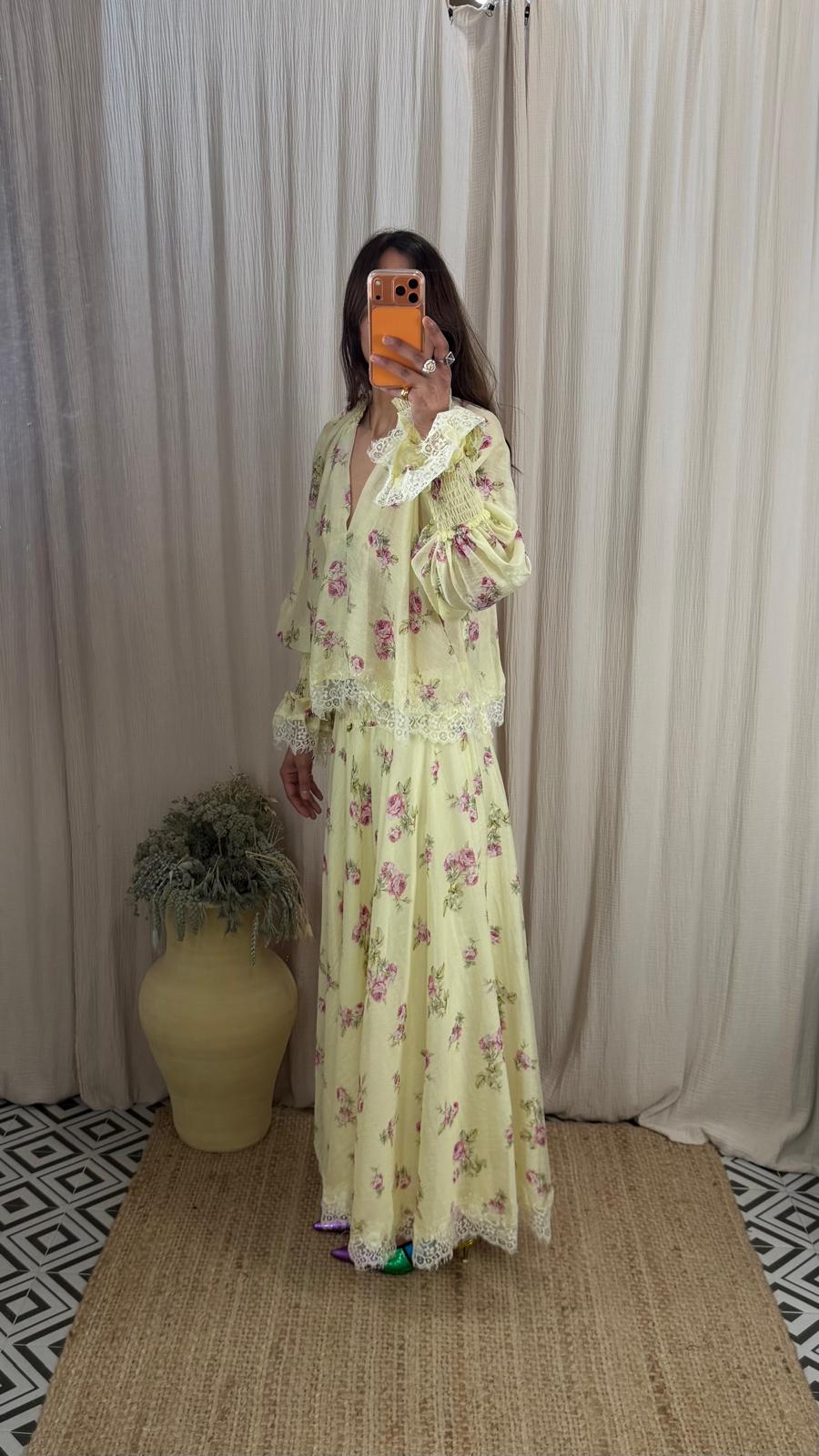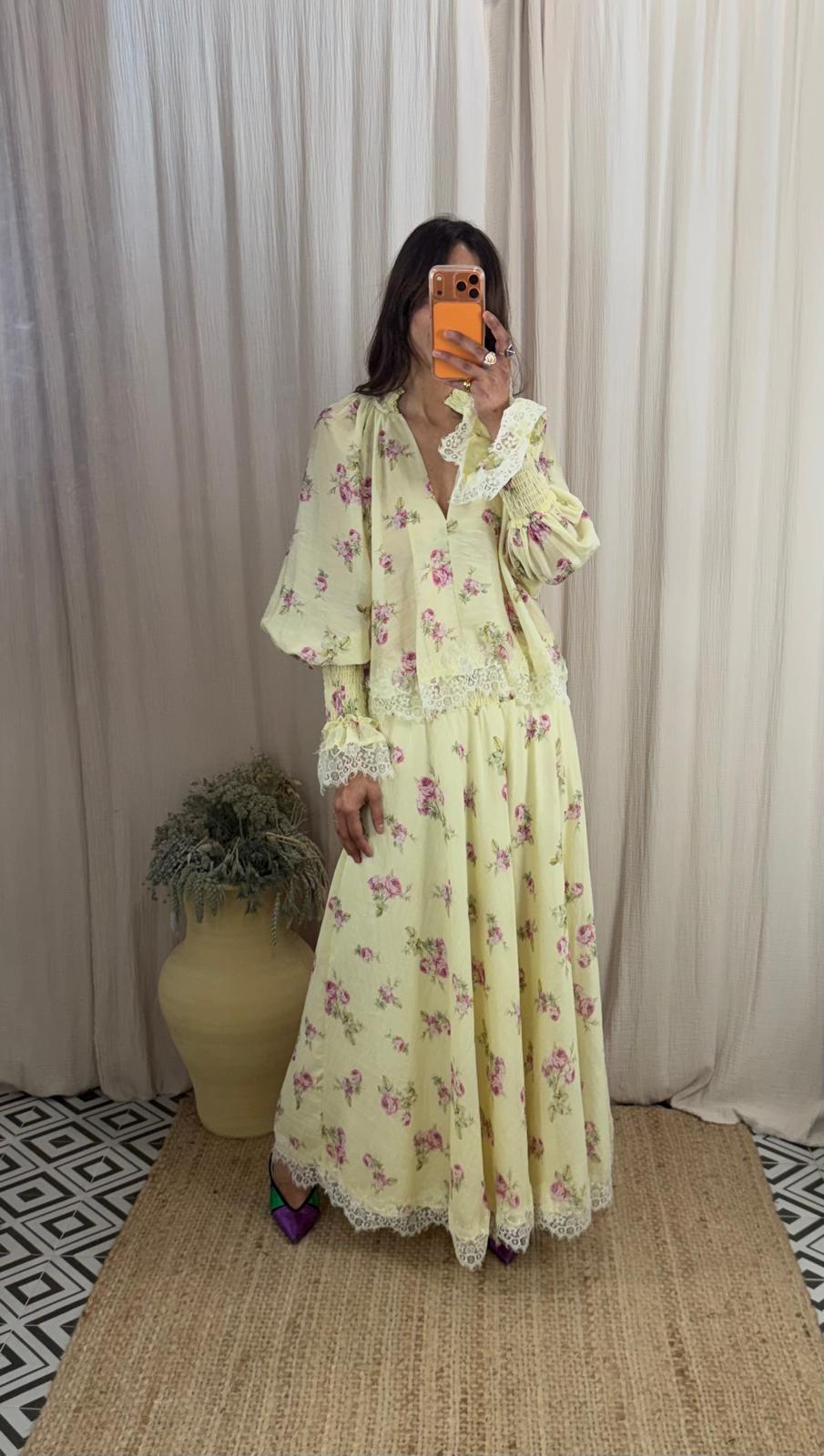 Falda con vuelo de corte amplio. Cintura elástica fruncida. Color mantequilla con estampado floral. El bajo esta rematado con un encaje que refuerza el estilo romántico.