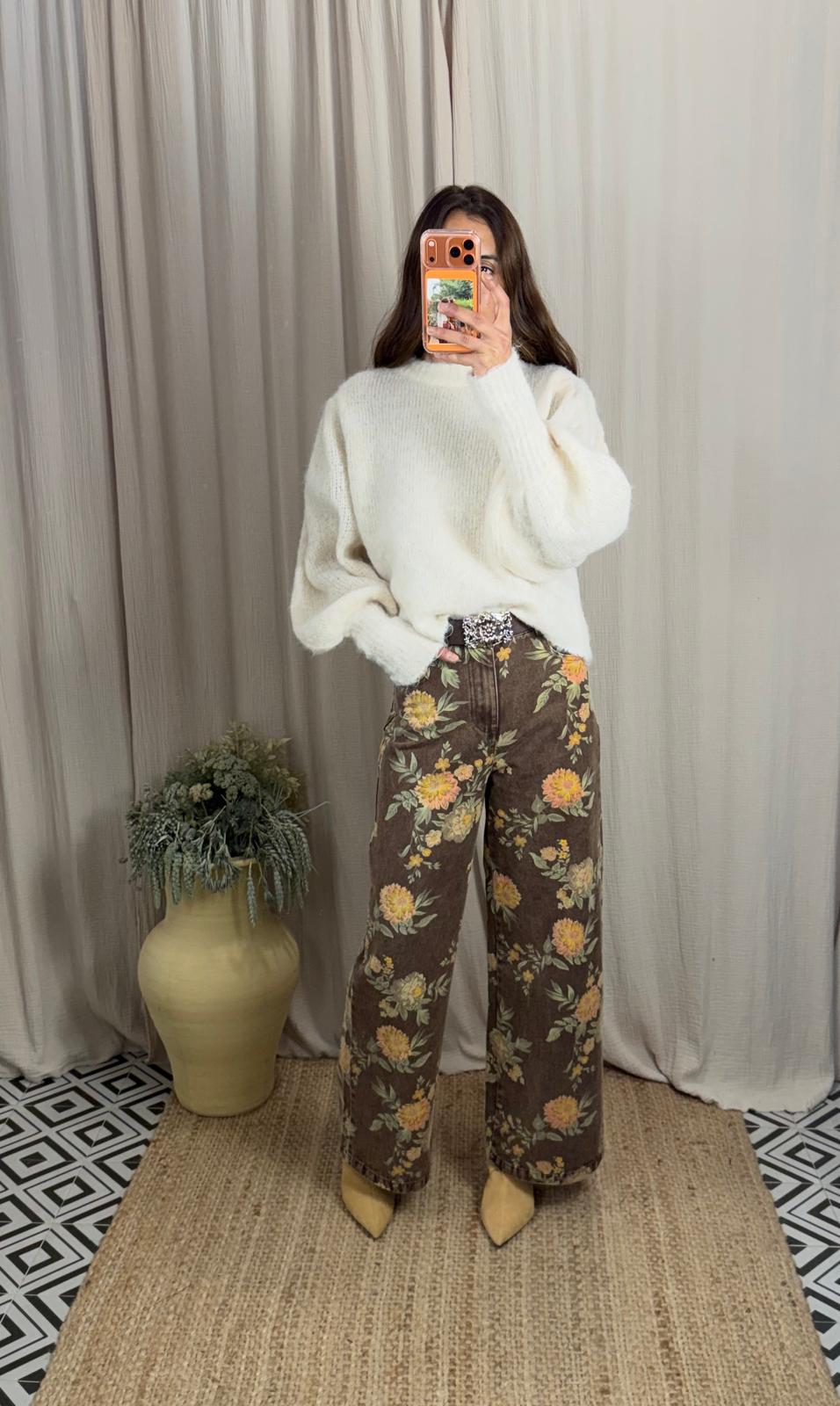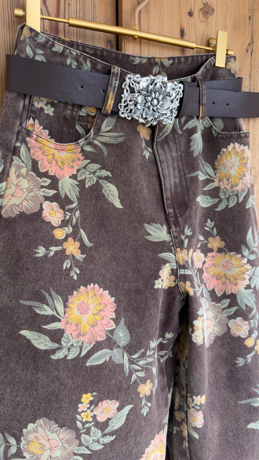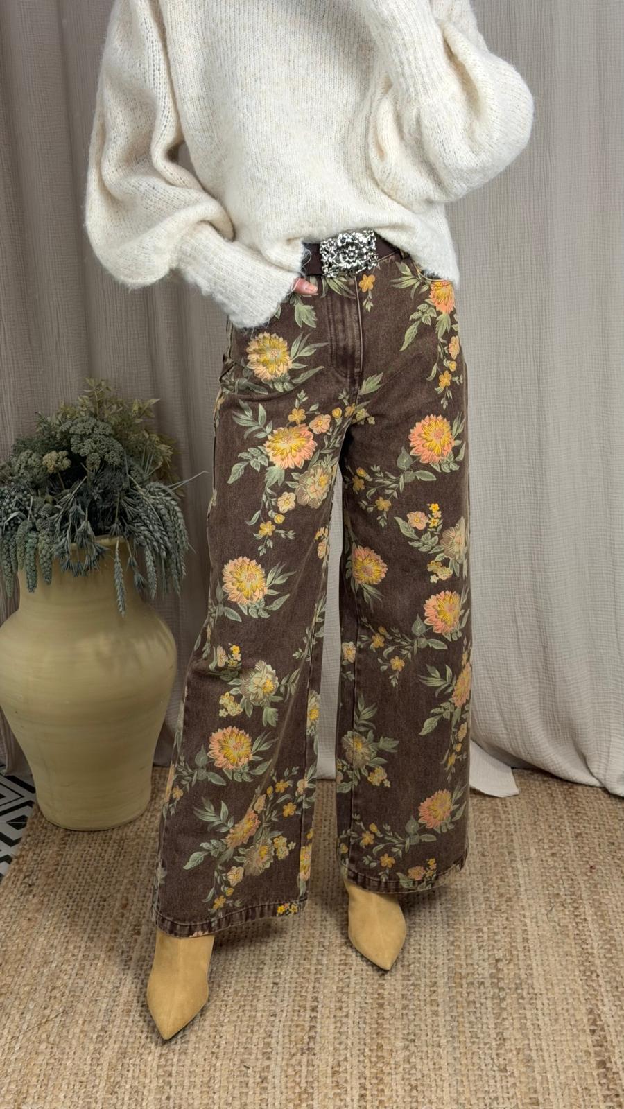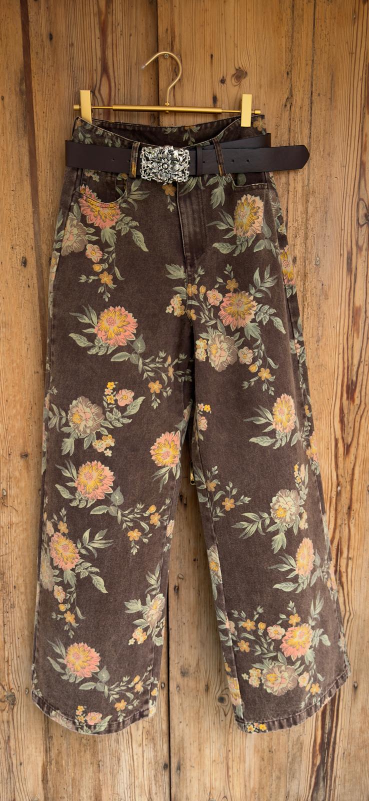 Jeans de corte recto y pierna ancha. Cintura medio/alta. Presenta un estampado floral en tonos cálidos sobre fondo marrón. Incluye cinturón.