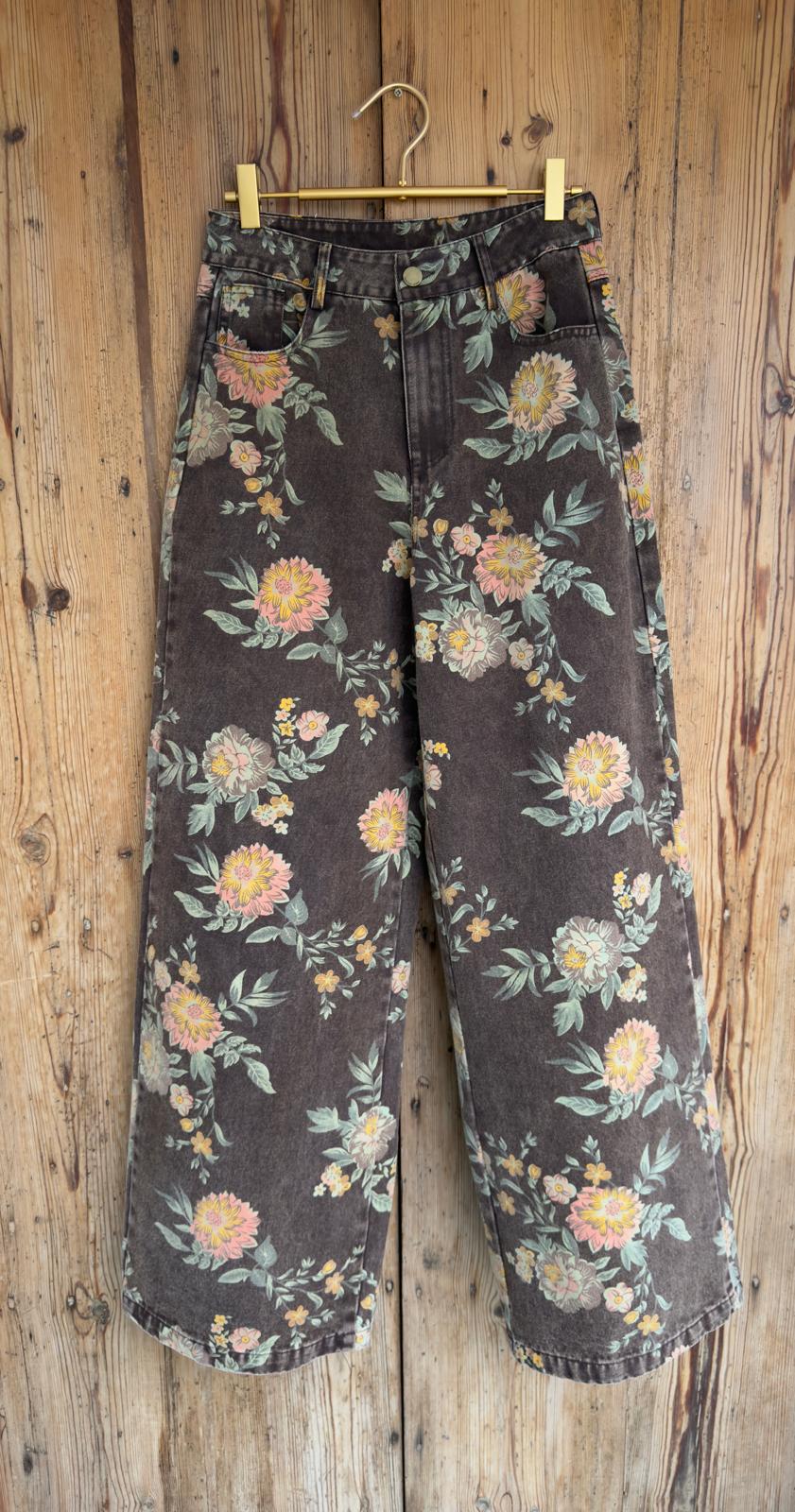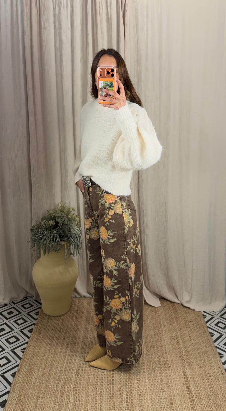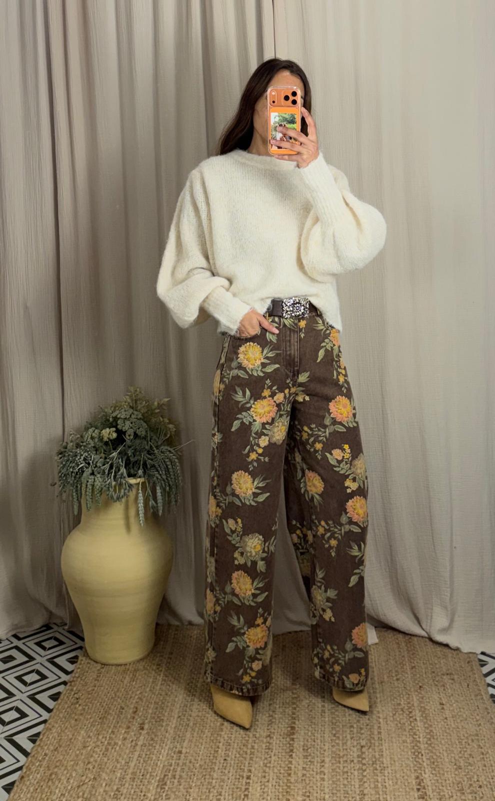 Jeans de corte recto y pierna ancha. Cintura medio/alta. Presenta un estampado floral en tonos cálidos sobre fondo marrón. Incluye cinturón.