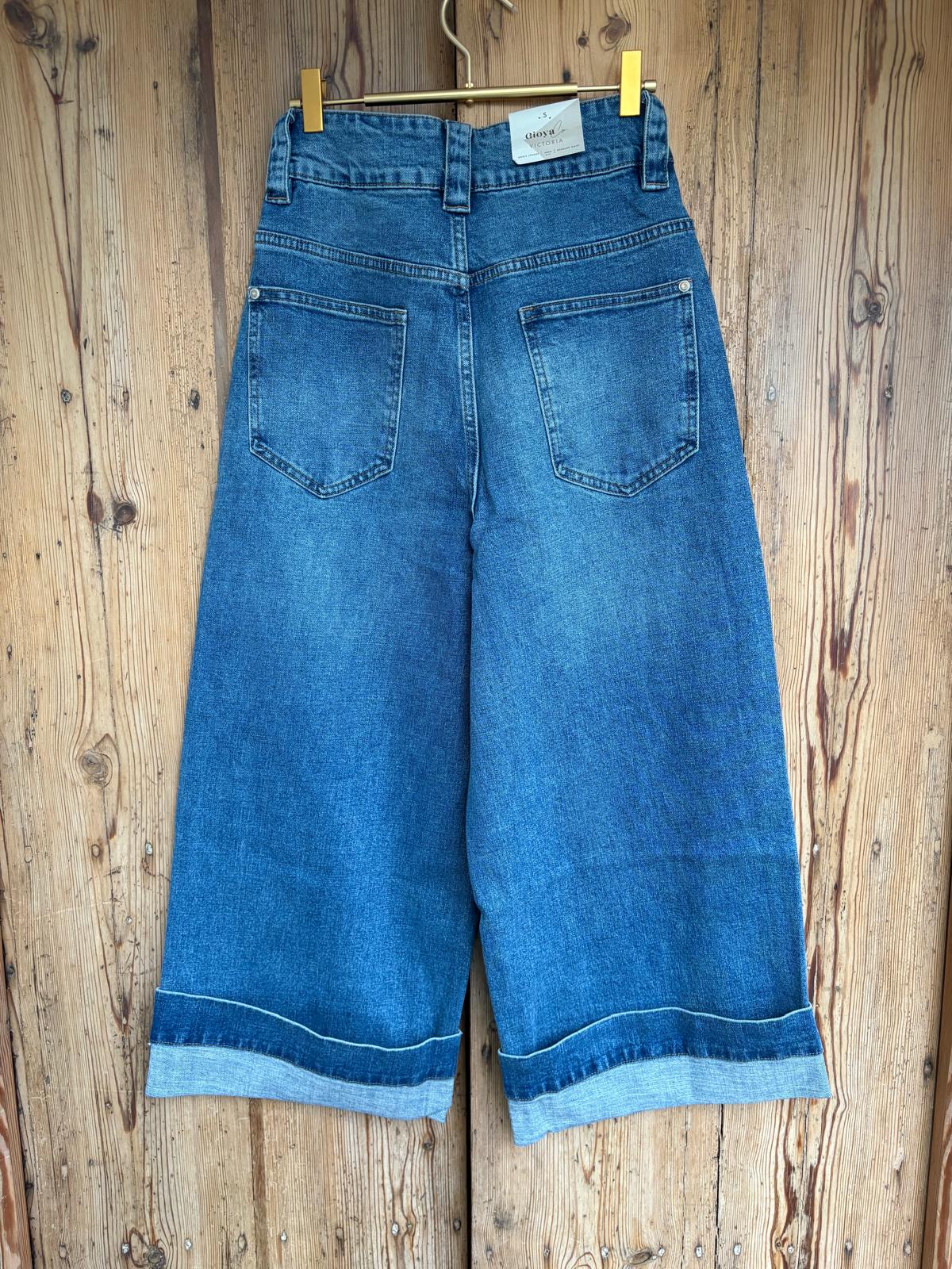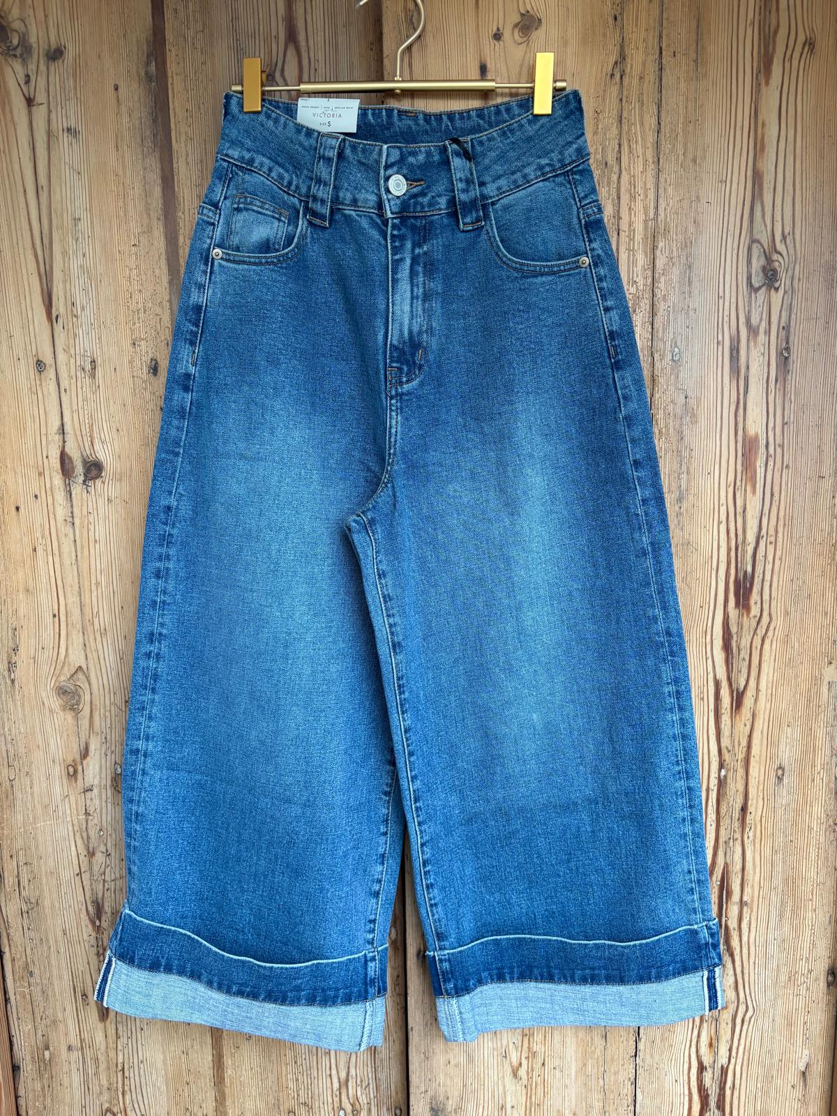 Jeans de corte recto, anchos. Detalle de dobladillo.