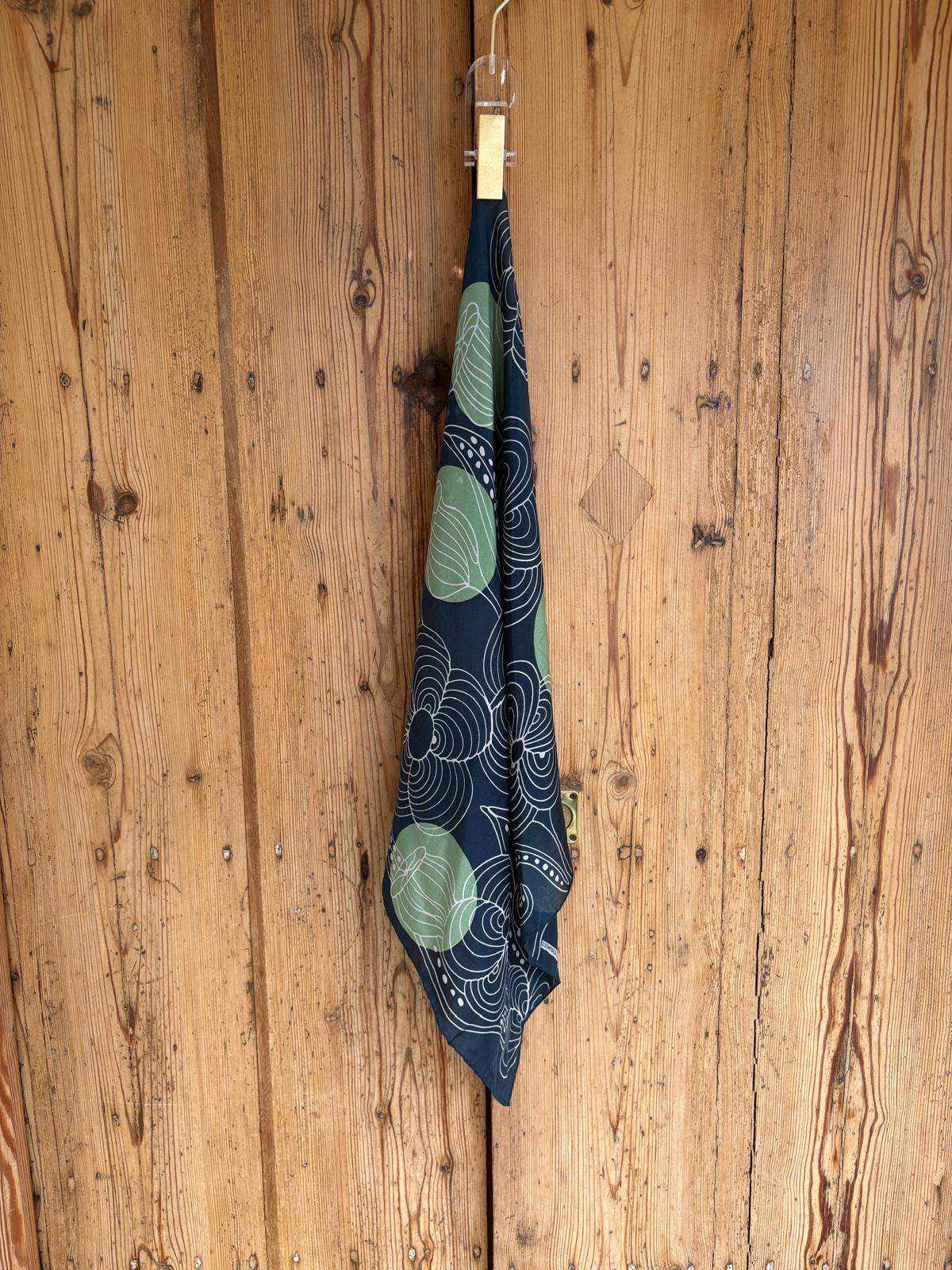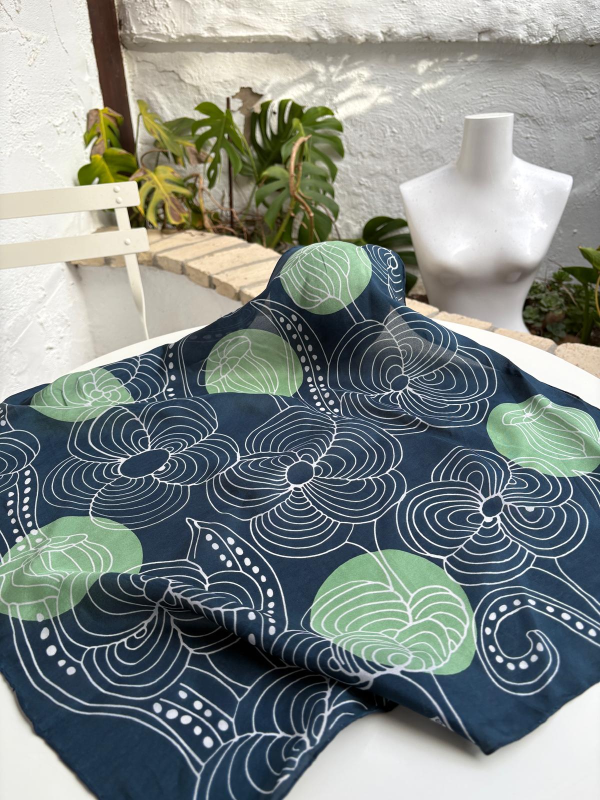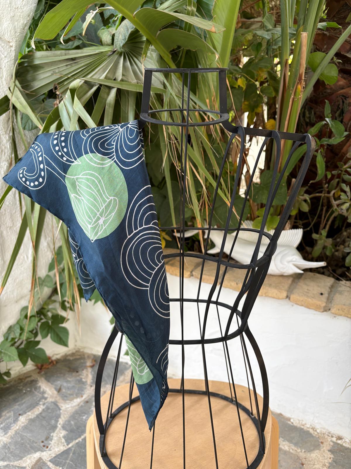 Los mini pañuelos de seda son un regalo original, se pueden llevar en el cuello, alrededor de la muñeca, como diadema, en un moño o alrededor del bolso. Impreso a mano en la India. 50 x 50 cm.