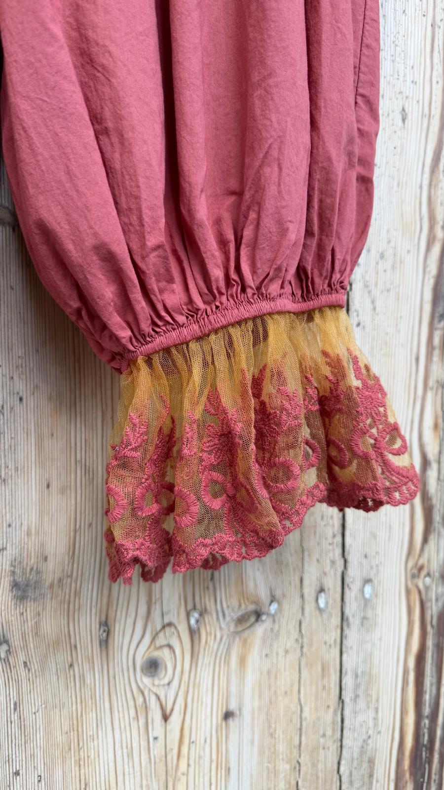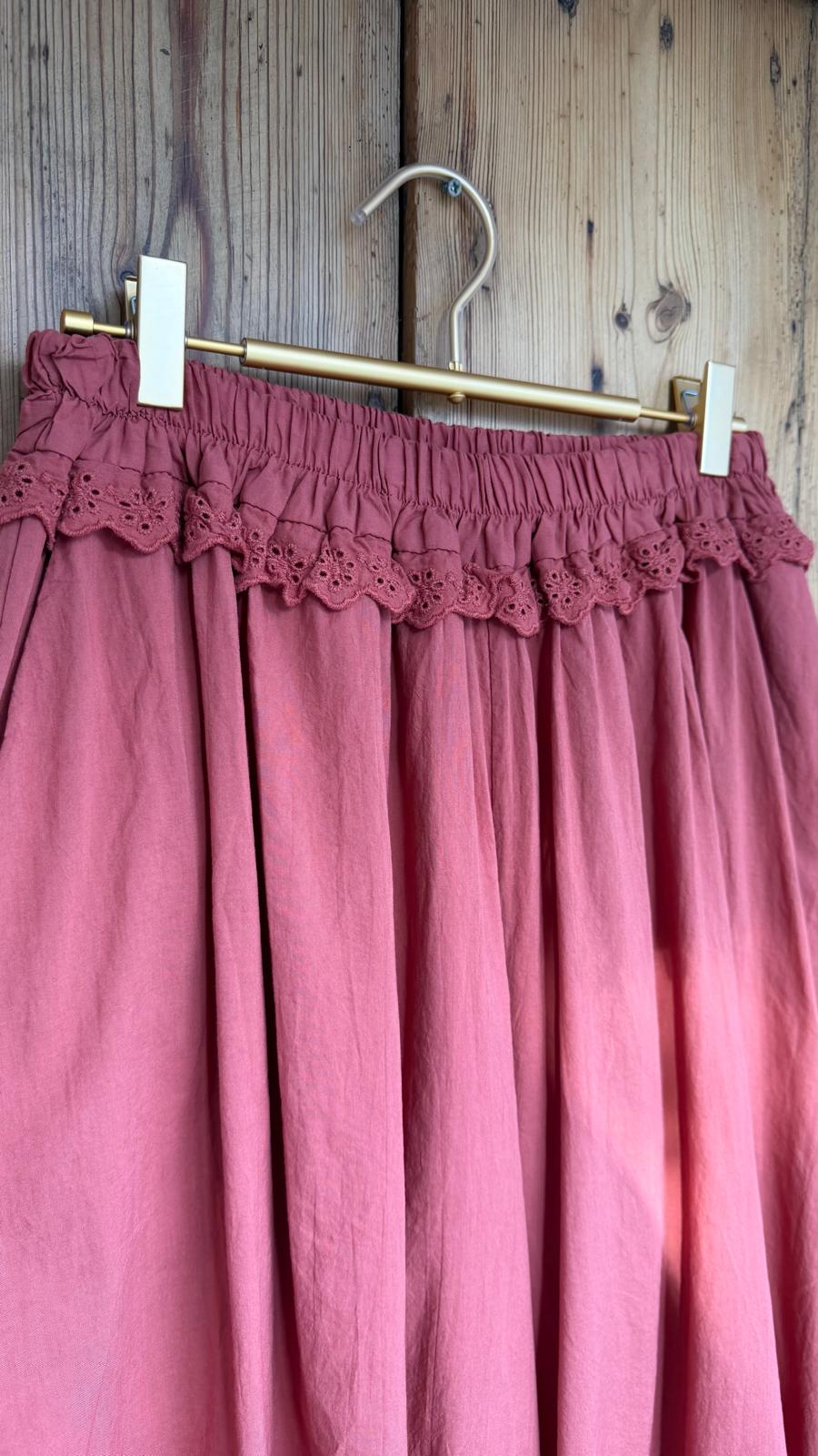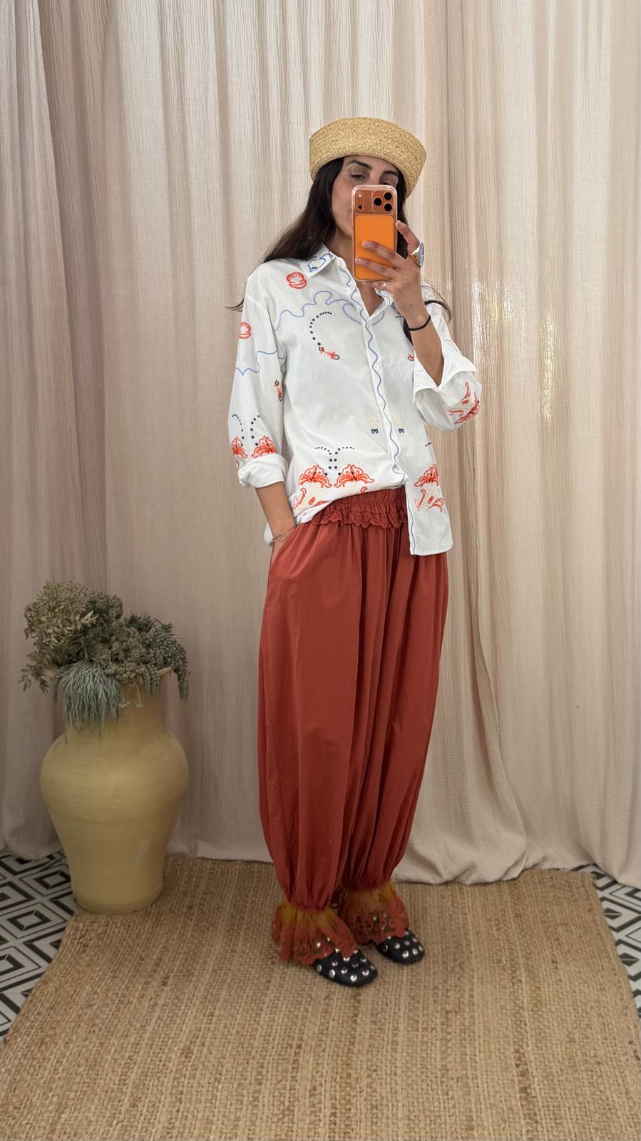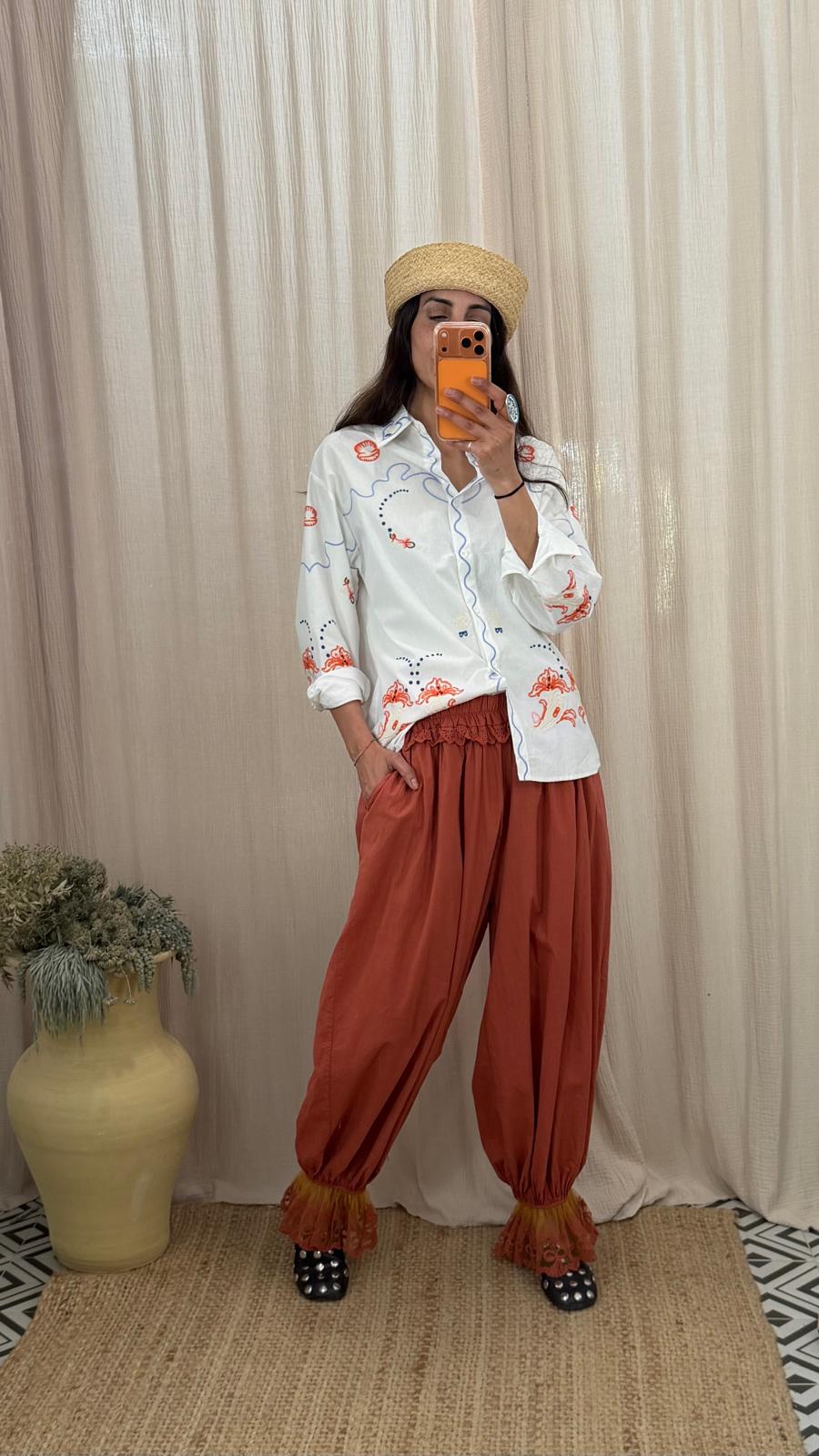 Pantalón bombacho de algodón en tono terracota. Cintura elástica con detalle de volante y acabado bordado. El bajo fruncido incorpora una delicada terminación en encaje con contraste de color.