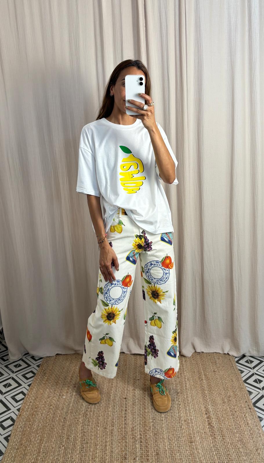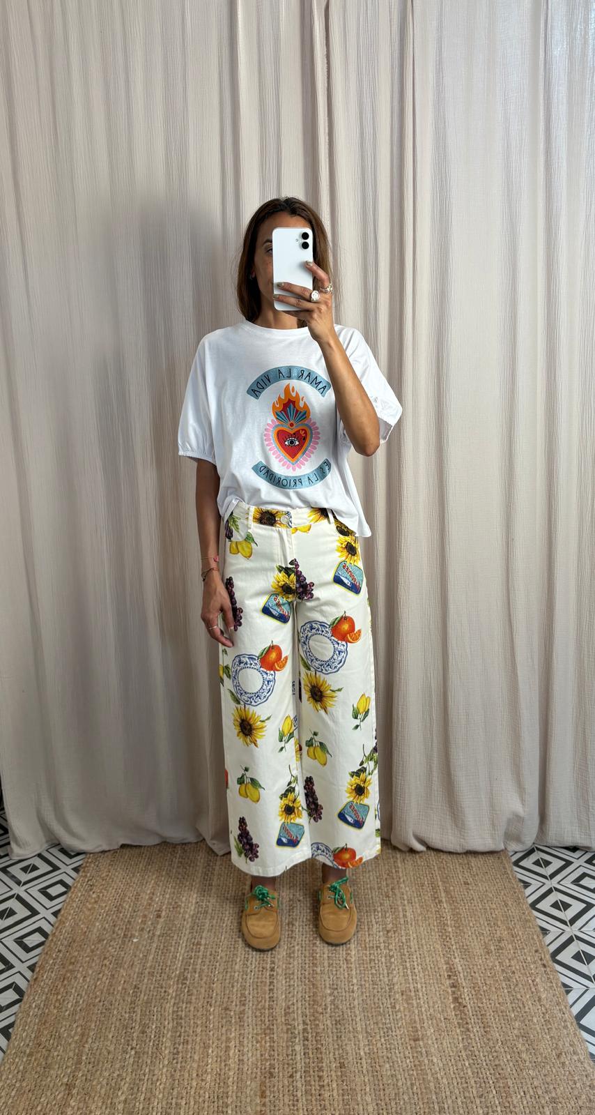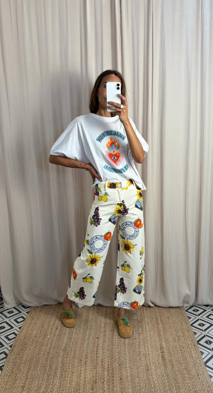 Pantalón de pierna recta con estampado de aire mediterráneo, bolsillos delanteros.