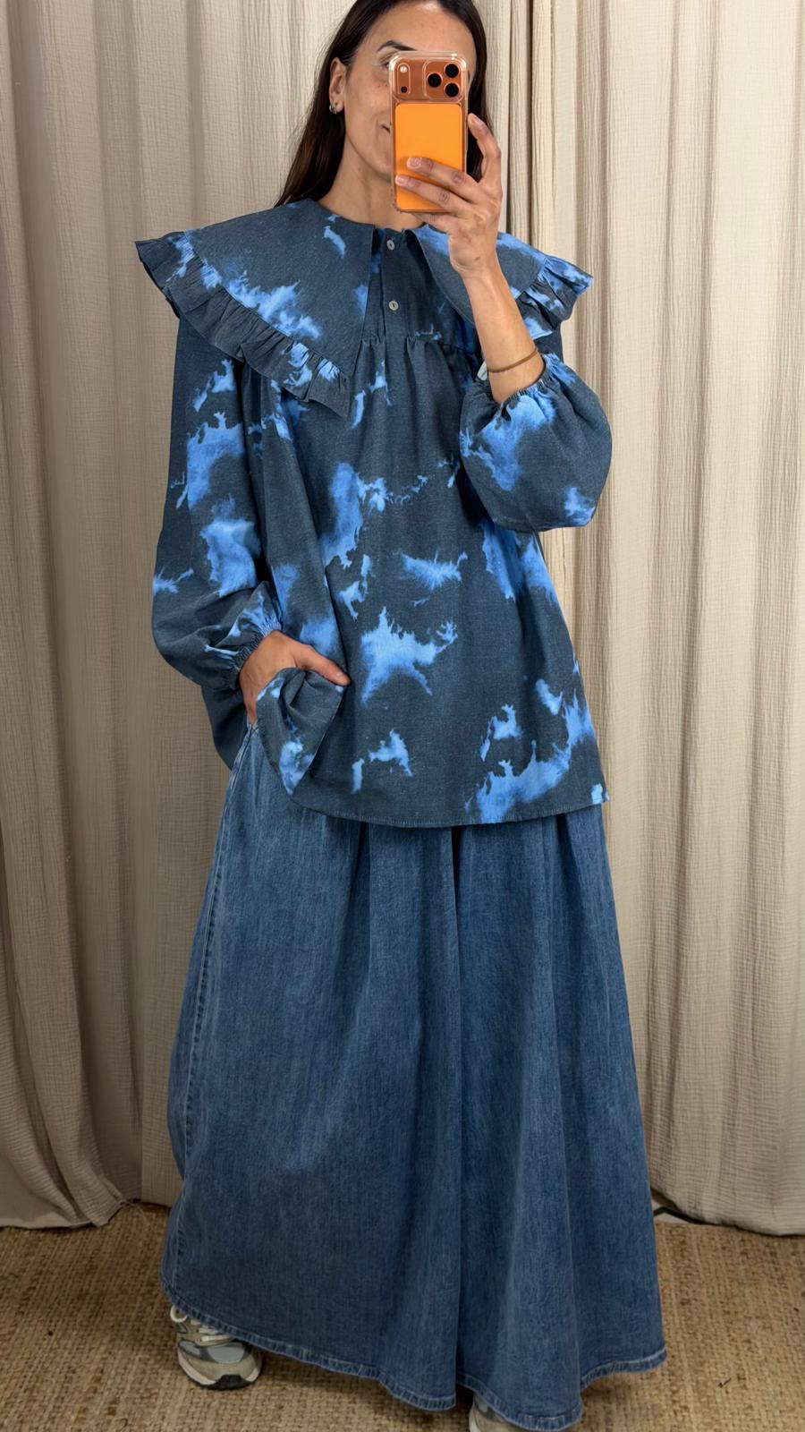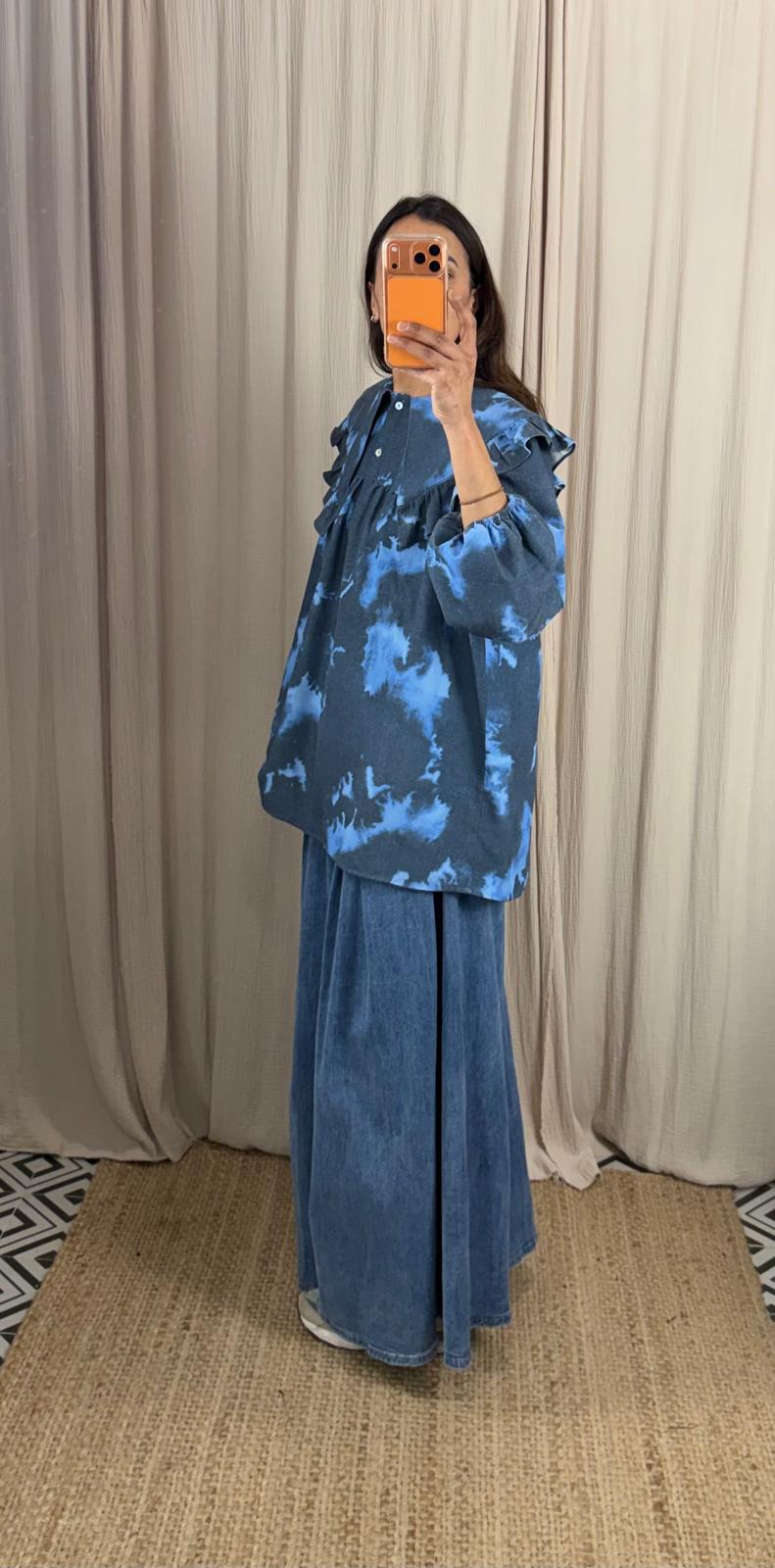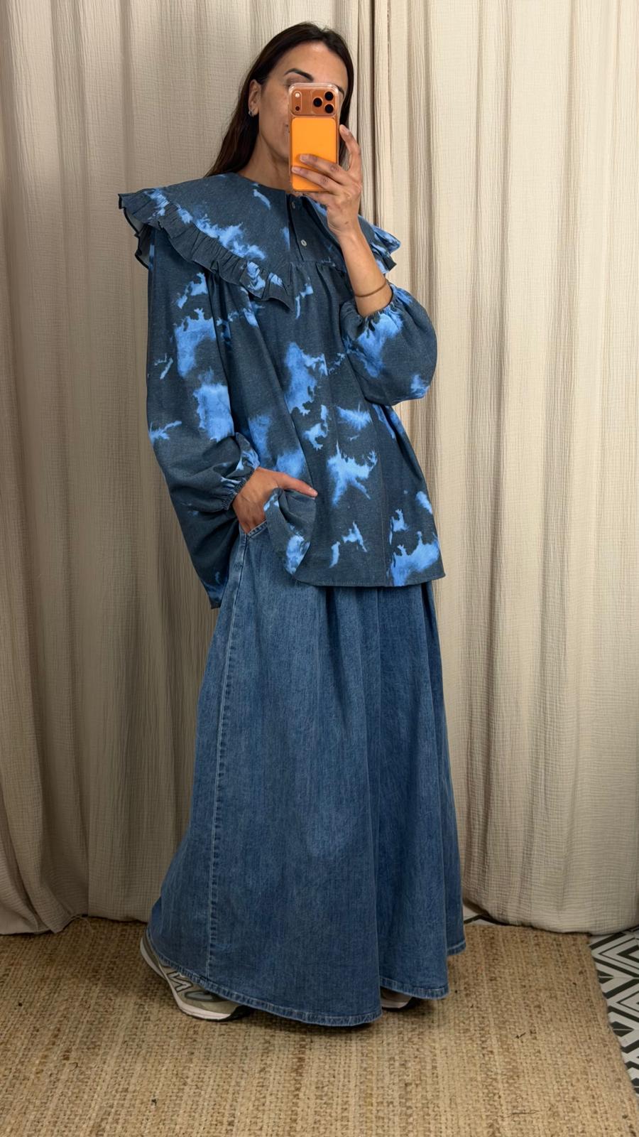 Denim azul medio. Diseño ancho con vuelo, lo que hace que visualmente parezca una falda. Cintura elástica.