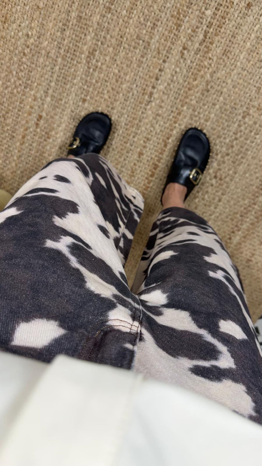 Jeans de corte recto y amplio. Tiro medio/alto. Estampado de animal print en tonos neutros. El contraste del estampado aporta carácter al look, convirtiéndolo en una pieza versàtil.