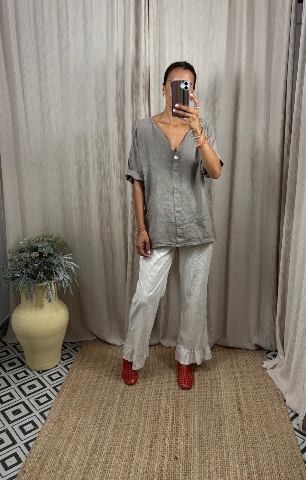 Pantalón de corte recto, tejido en cuadros vichy. Cintura elástica y volante inferior en el bajo.
