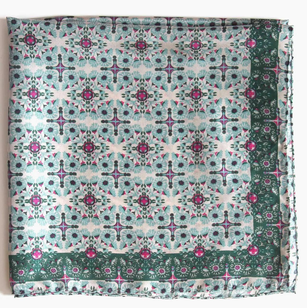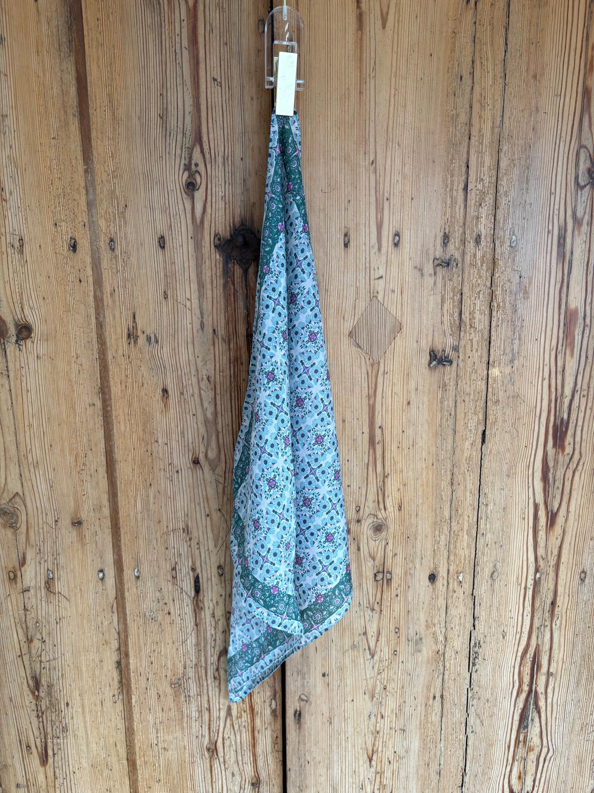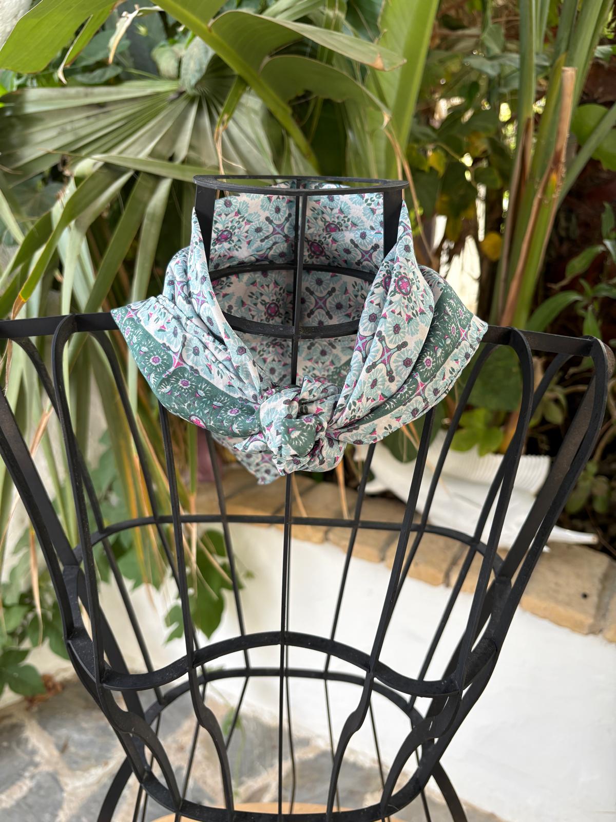 Los mini pañuelos de seda son un regalo original, se pueden llevar en el cuello, alrededor de la muñeca, como diadema, en un moño o alrededor del bolso. Impreso a mano en la India. 50 x 50 cm.