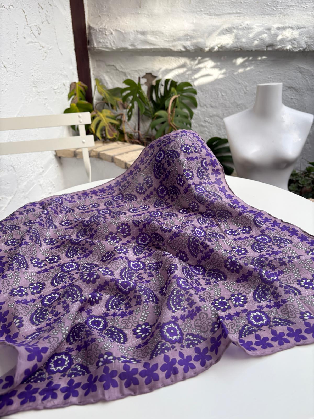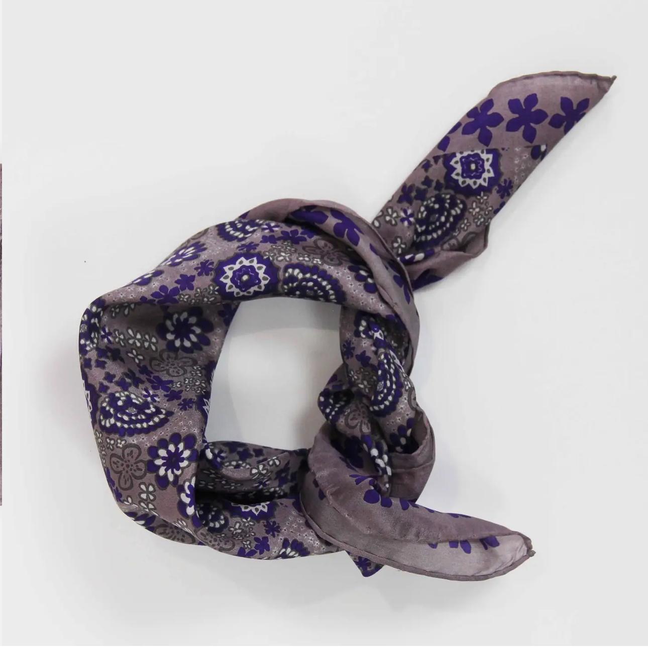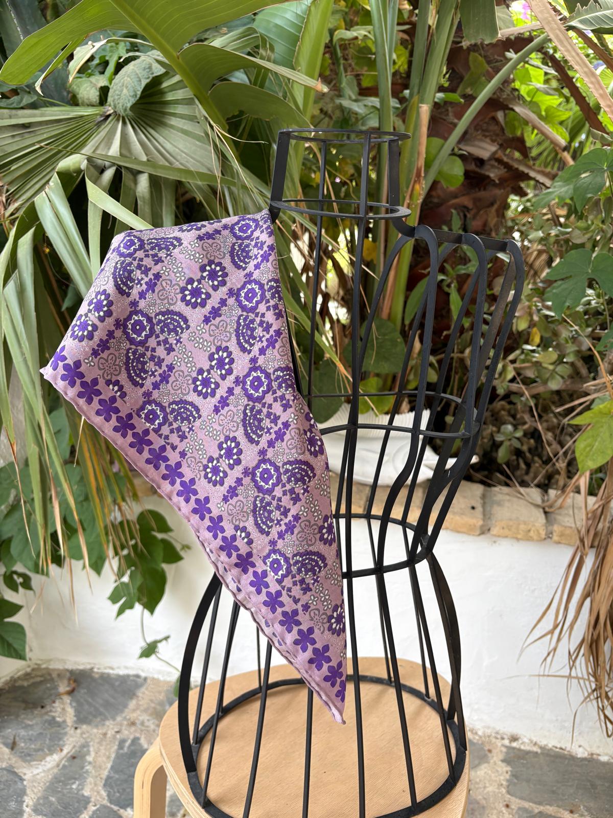 Los mini pañuelos de seda son un regalo original, se pueden llevar en el cuello, alrededor de la muñeca, como diadema, en un moño o alrededor del bolso. Impreso a mano en la India. 50 x 50 cm.