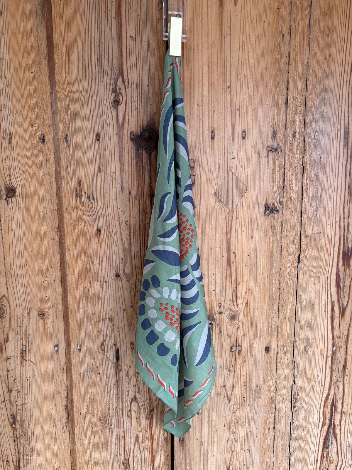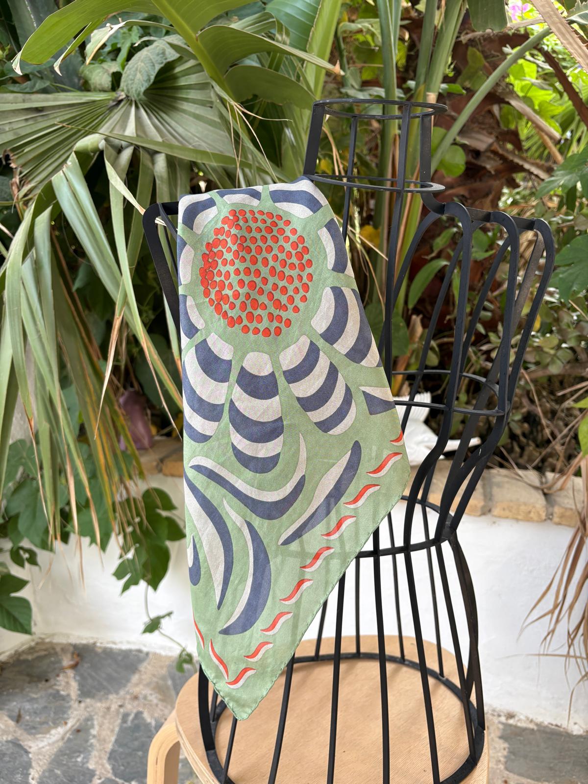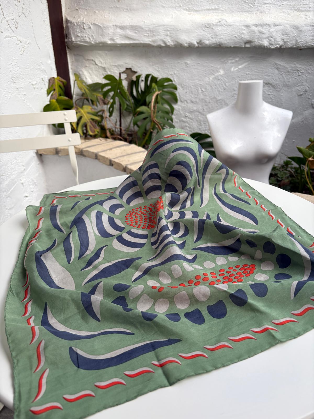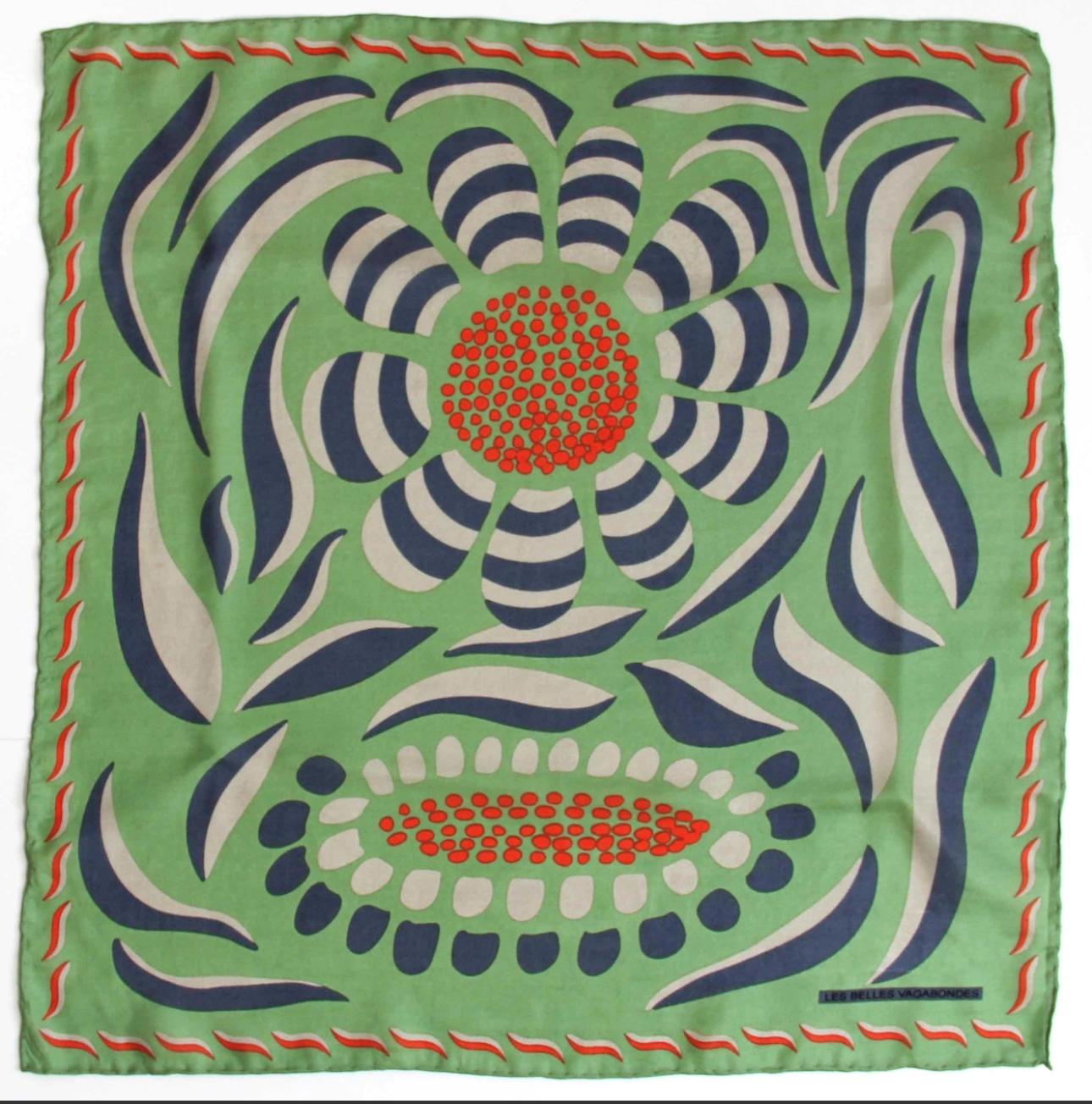 Los mini pañuelos de seda son un regalo original, se pueden llevar en el cuello, alrededor de la muñeca, como diadema, en un moño o alrededor del bolso. Impreso a mano en la India. 50 x 50 cm.