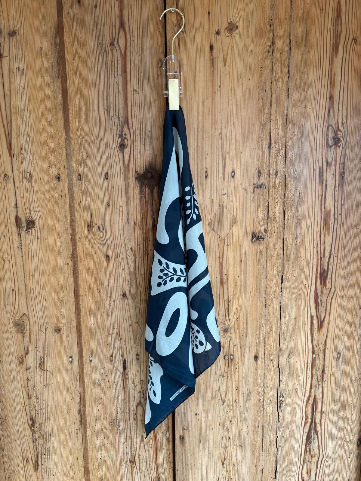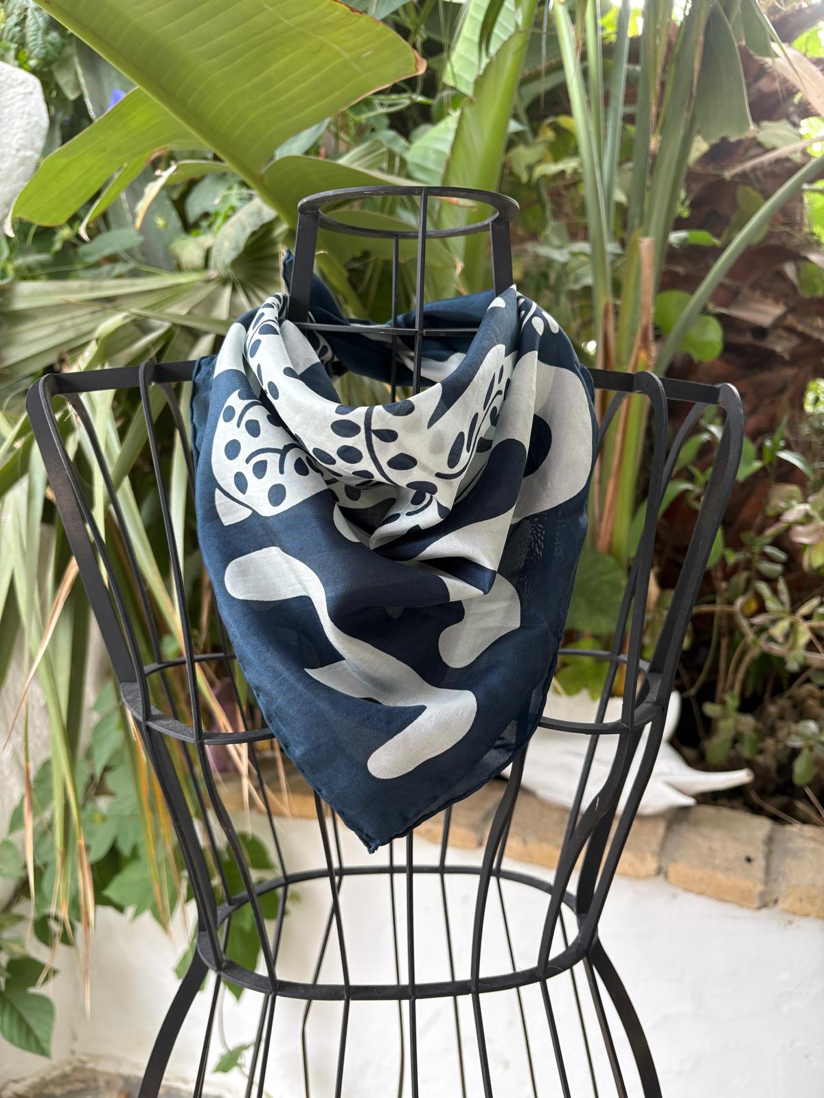 Los mini pañuelos de seda son un regalo original, se pueden llevar en el cuello, alrededor de la muñeca, como diadema, en un moño o alrededor del bolso. Impreso a mano en la India. 50 x 50 cm.