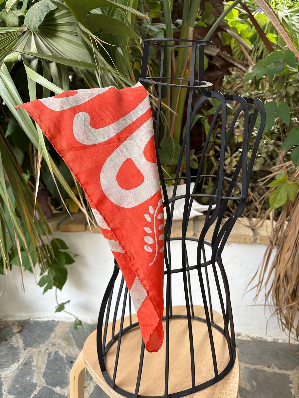 Los mini pañuelos de seda son un regalo original, se pueden llevar en el cuello, alrededor de la muñeca, como diadema, en un moño o alrededor del bolso. Impreso a mano en la India. 50 x 50 cm.