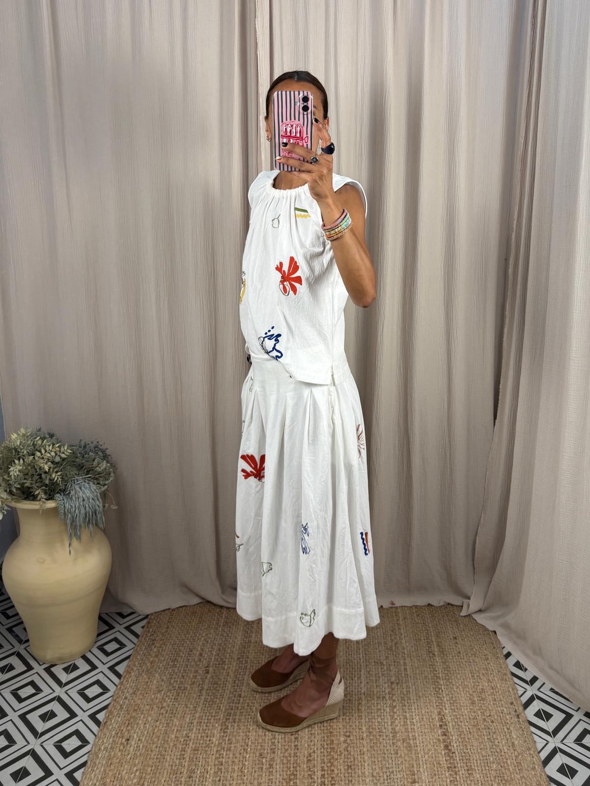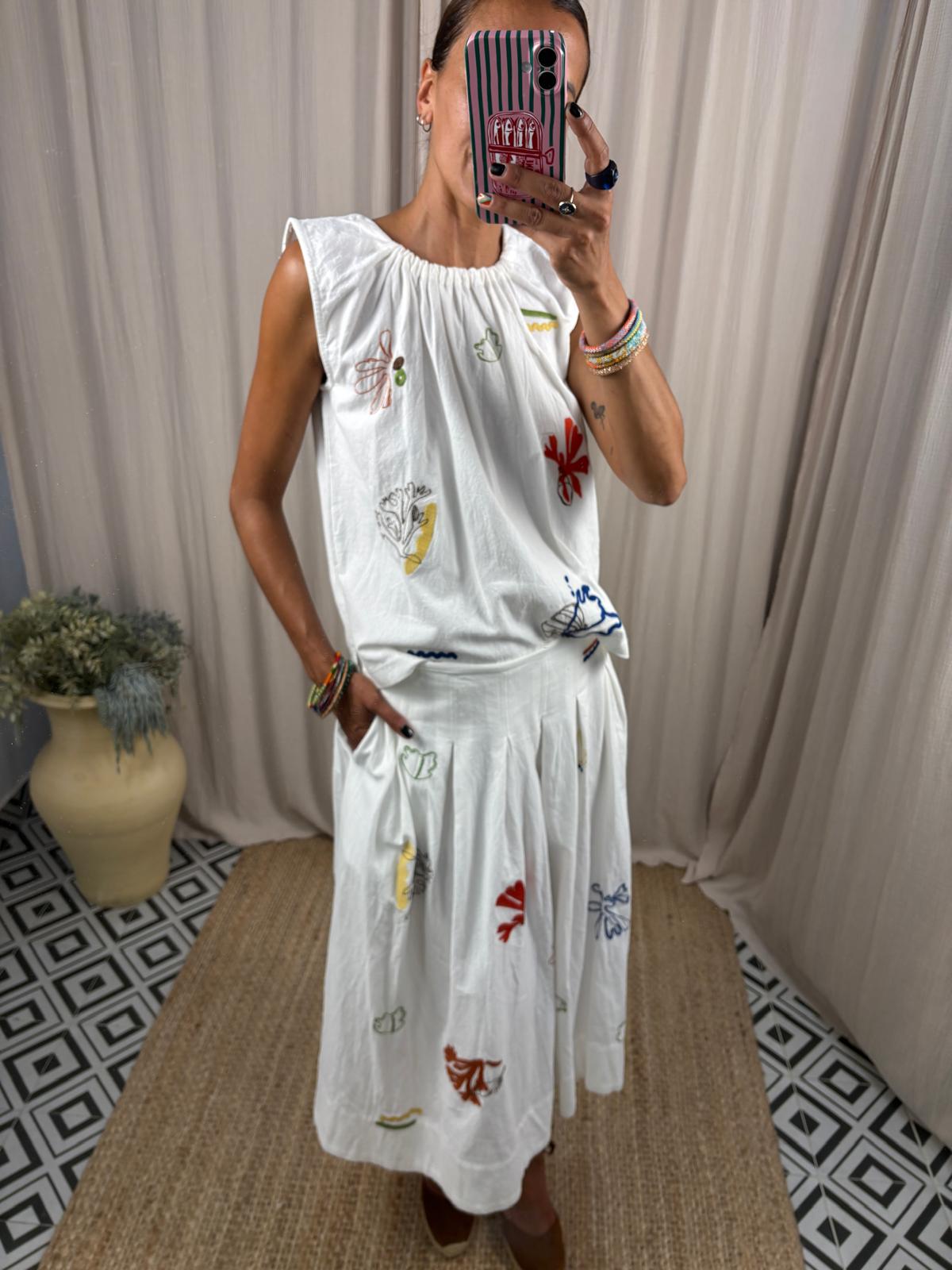 Total look compuesto por blusa sin mangas de corte suelto con cuello redondo y fruncido, se cierra con cordón ajustable. Falda midi de talle medio, amplia y tableada. Borados colorido en ambas prendas. Puede dar talla hasta la 40. Tejido rústico grueso.