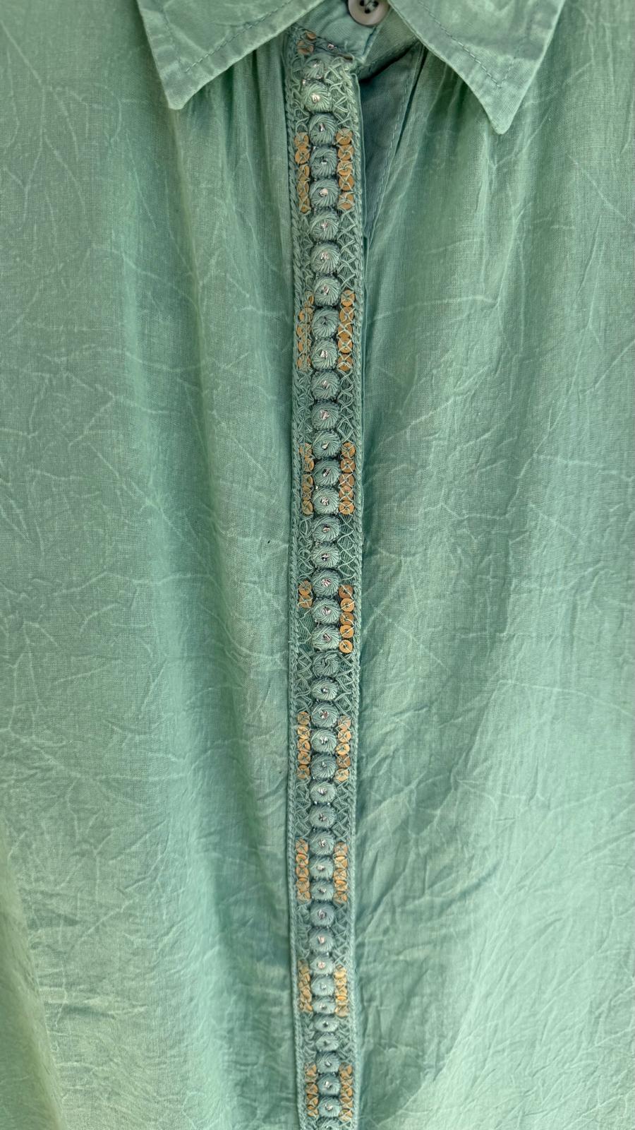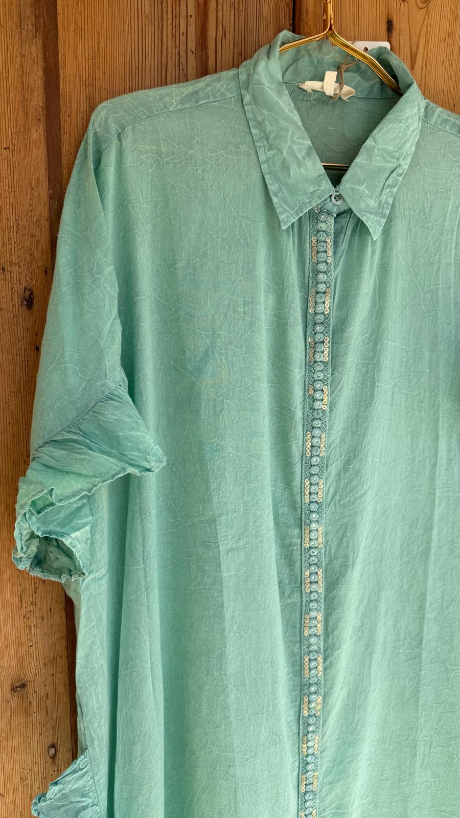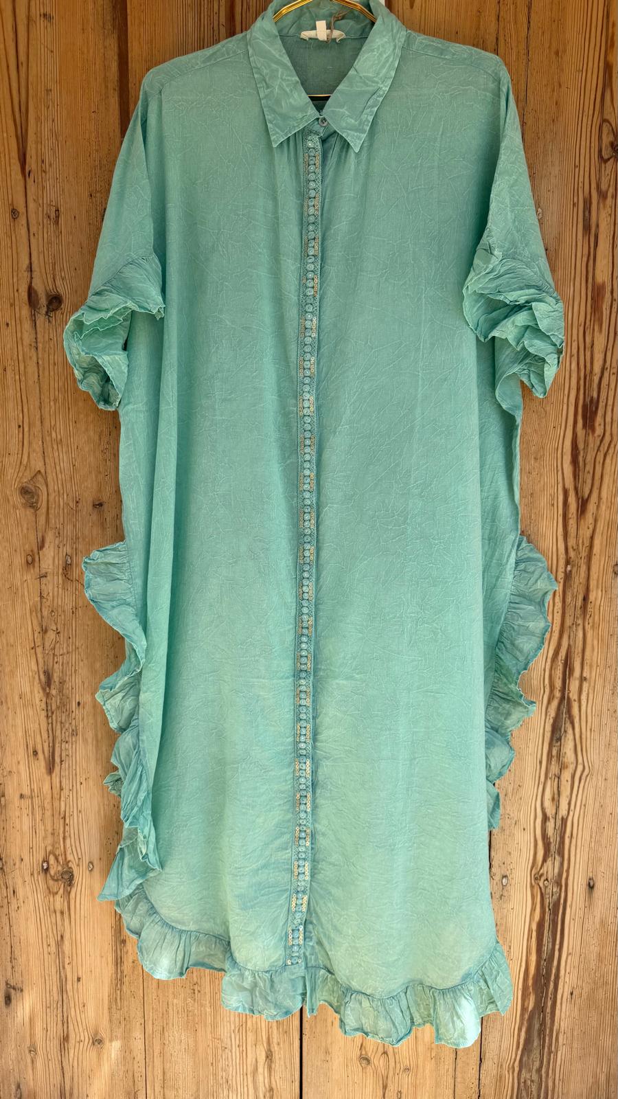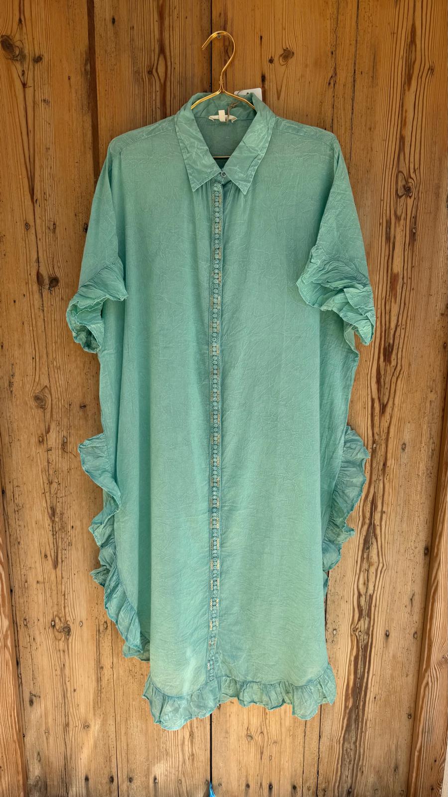 Vestido camisero de estilo relajado. Textura ligeramente arrugada. Cuello camisero clásico y cierre frontal con tapeta decorada. Corte recto y holgado. Detalle de volantes laterales y en bajo.