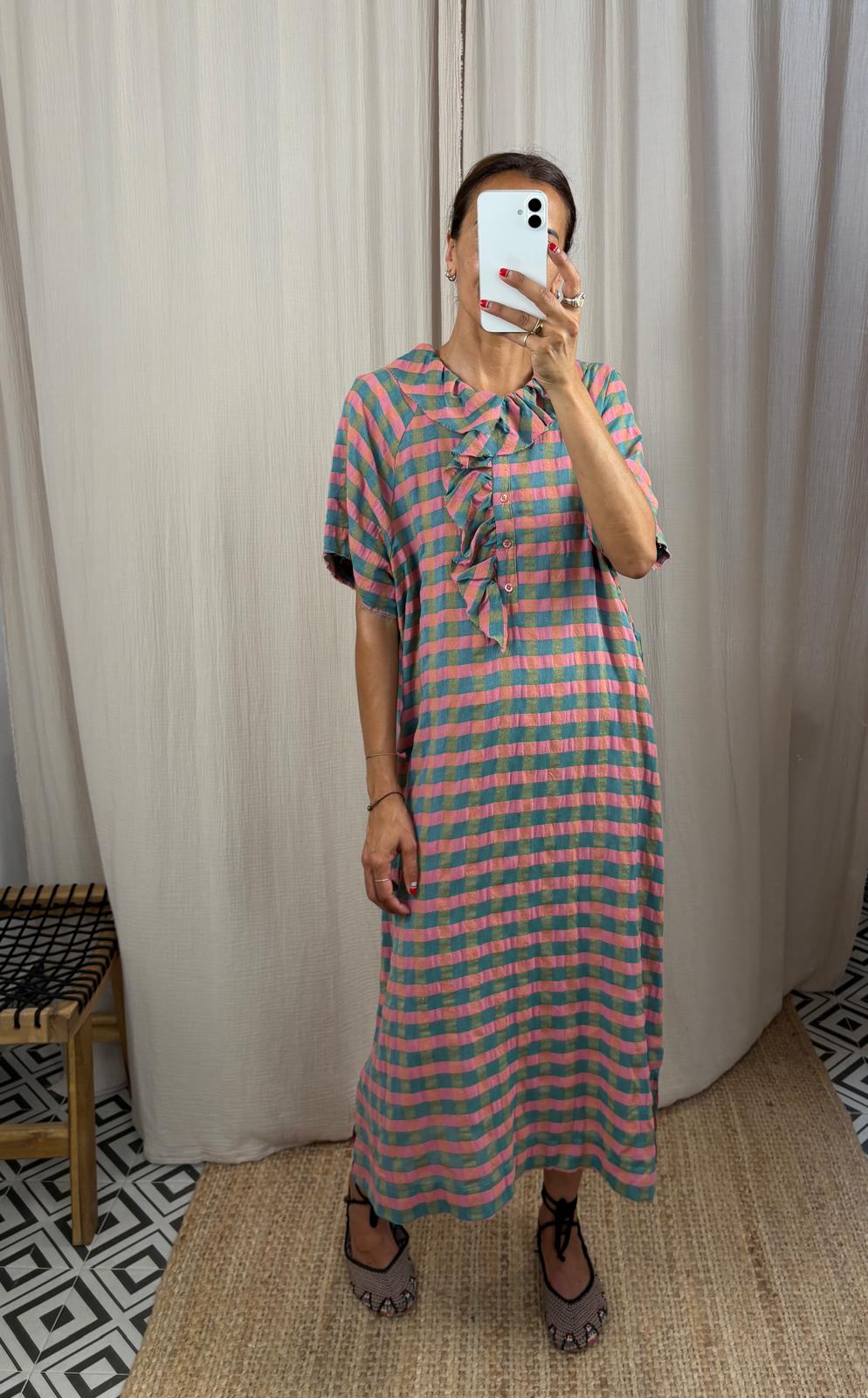 Vestido casual de corte recto, patrón de cuadros. Cuello redondo con volante que se extiende a modo cascada. Pequeñas aberturas laterales.
