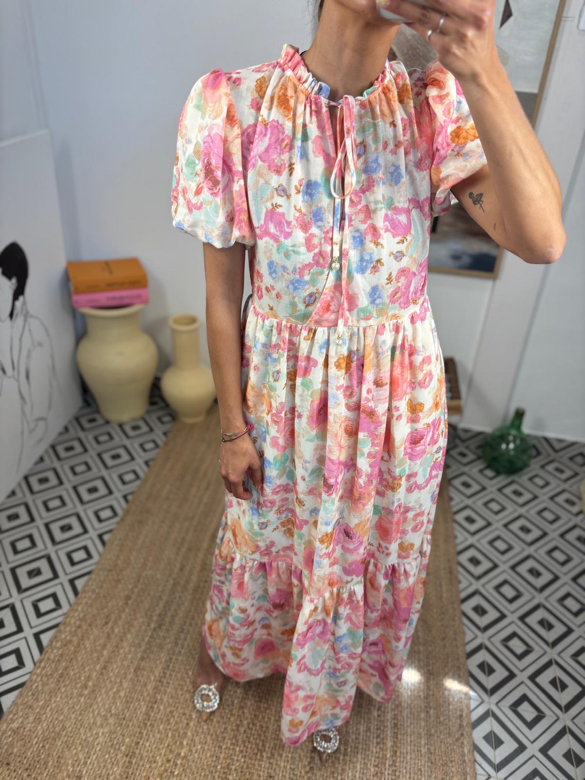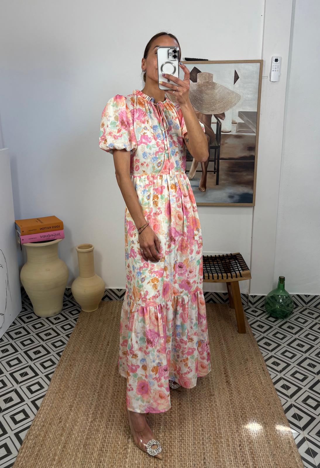 Vestido largo con falda amplia en tejido de lino y algodón. Mangas cortas abullonadas y escote redondo con cordón en el centro.