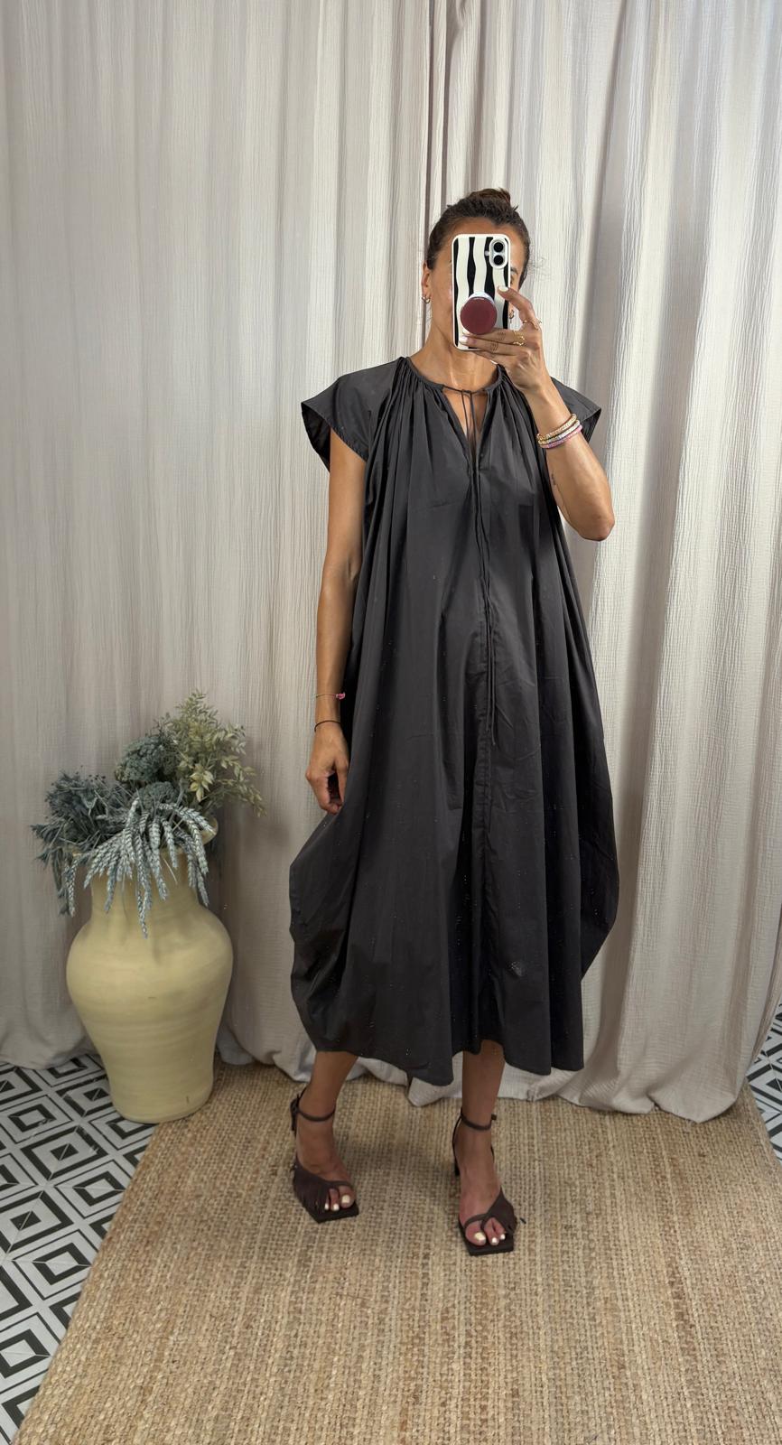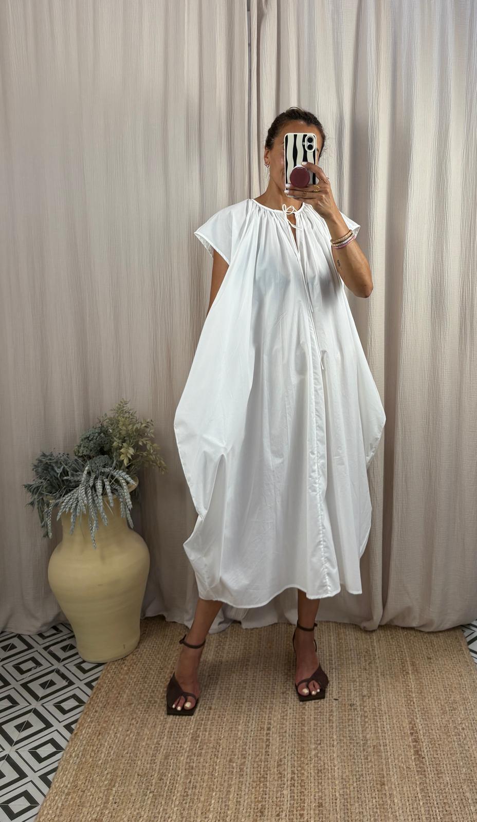Vestido amplio y suelto, cuello redondo con una ligera abertura en el centro que se ata con una pequeña lazada. Mangas prolongadas del mismo vestido, bolsillos laterales y silueta abombada.