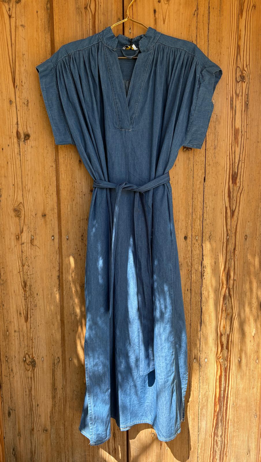 Vestido en azul índigo, similar al denim pero con textura ligera y fluida. Escote en V con cuello mao, bolsillos laterales y cinturón de la misma tela.