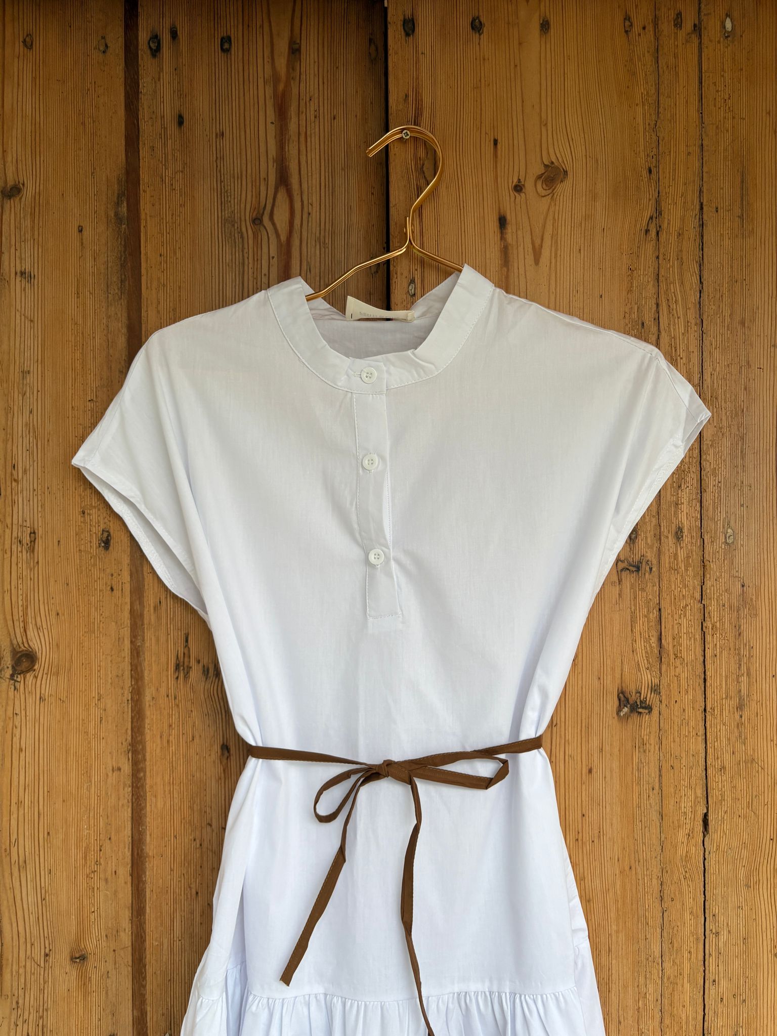 Vestido de silueta relajada, de largo midi. Cuello tipo mao y botonadura en la parte superior. incluye un cordón fino que permite ajustar la prenda si desea marcar la cintura. Mangas tipo capa sin costura marcada.