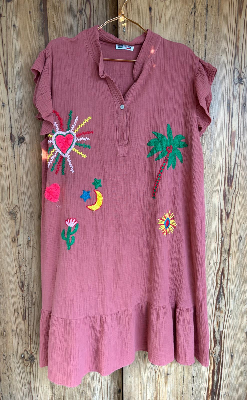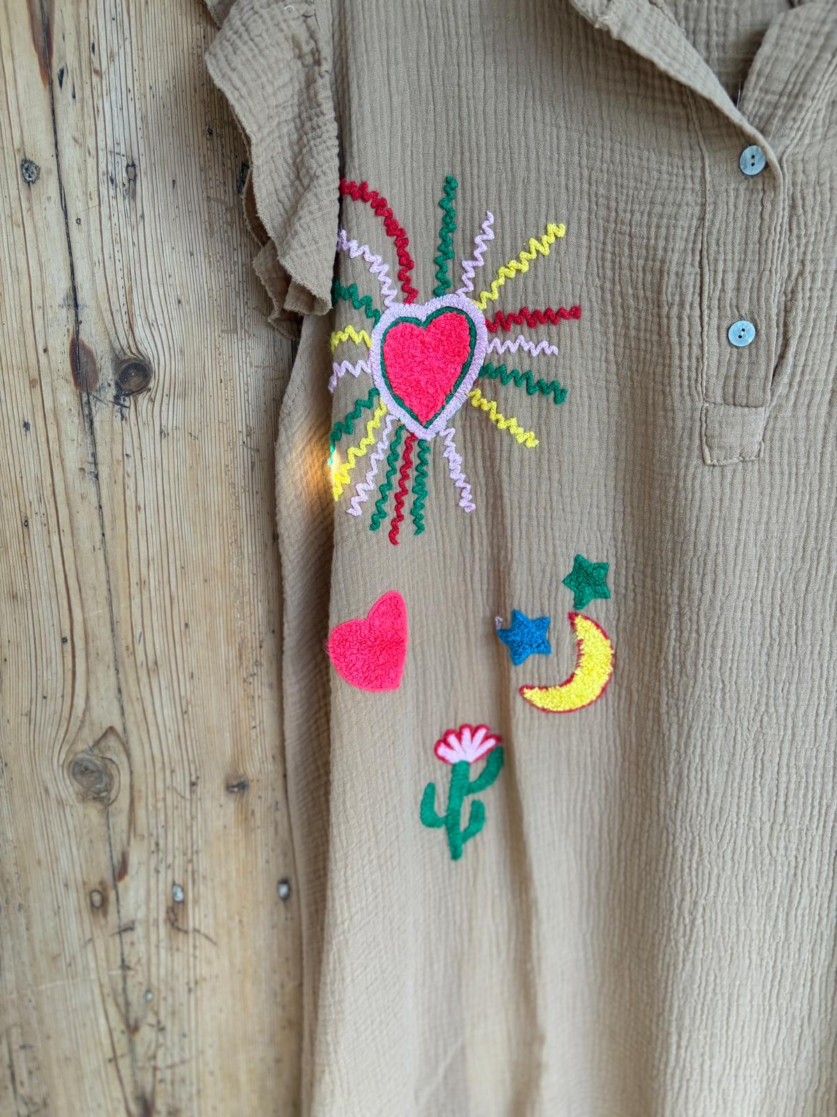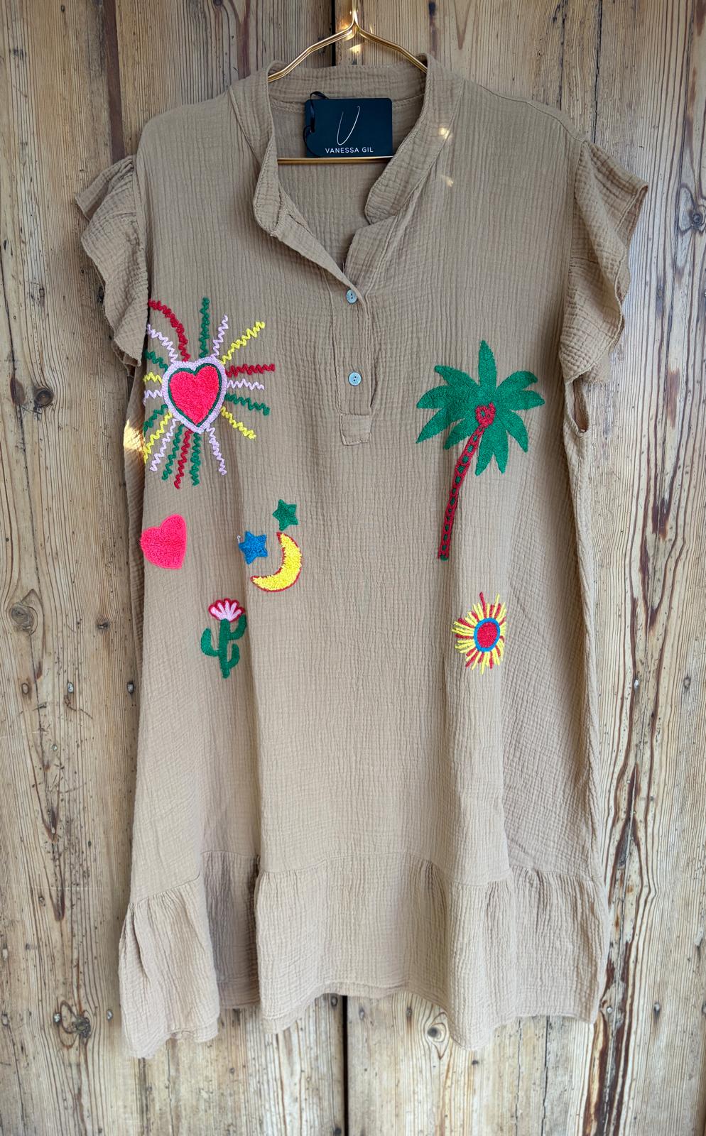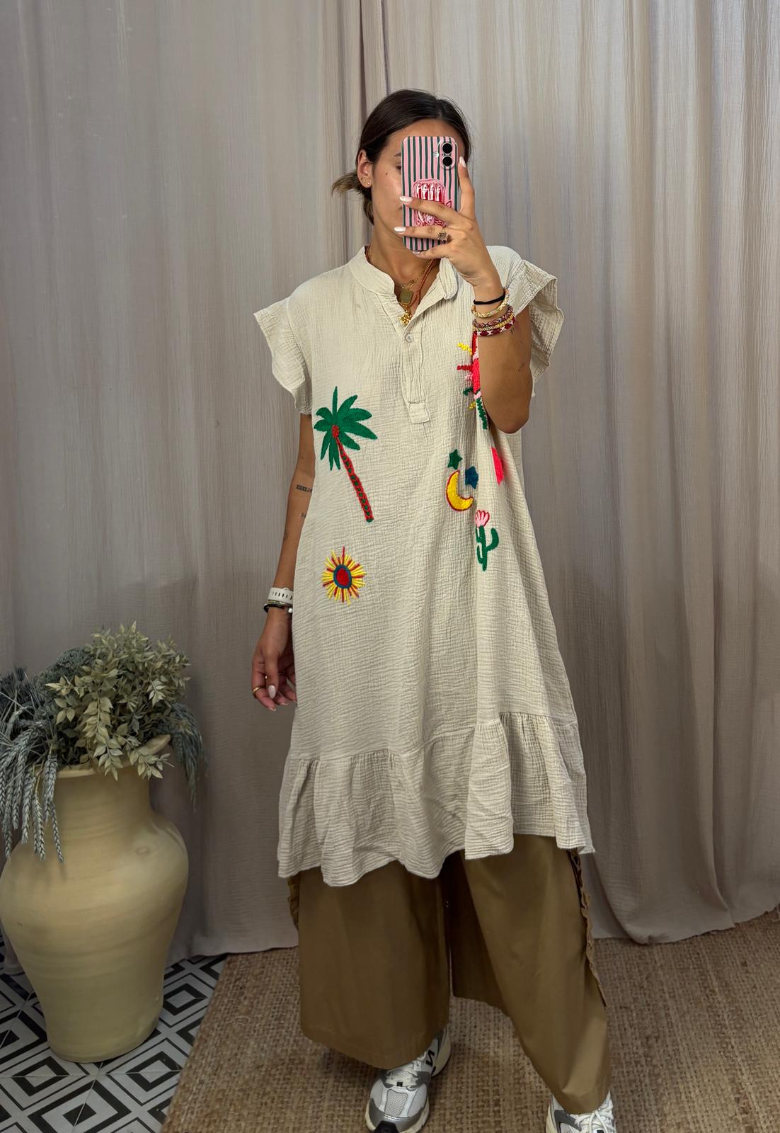 Vestido de corte recto y suelto. Cuello mao con pequeña abertura y parte inferior con volante. Bordados multicolor en la parte frontal.
