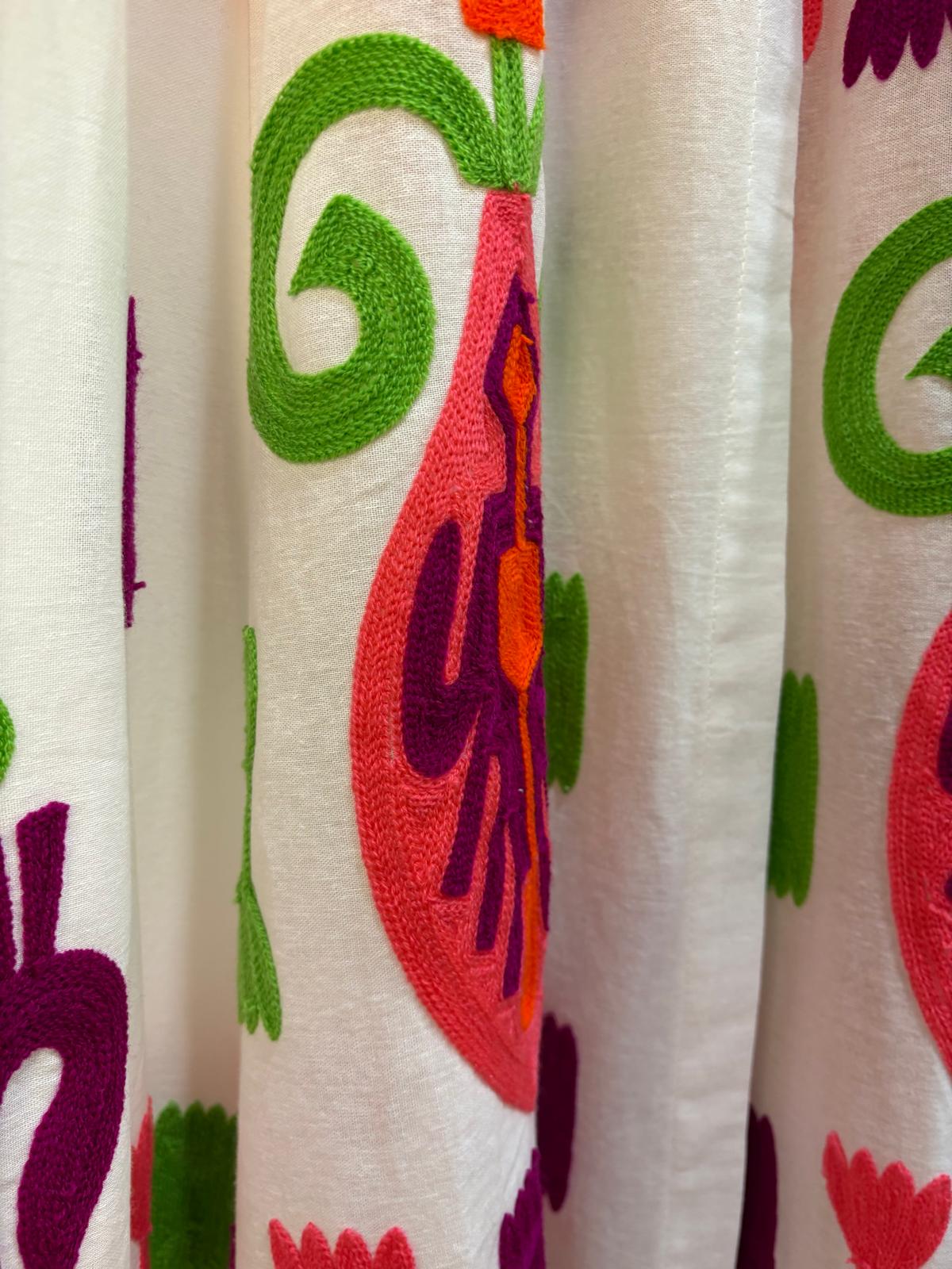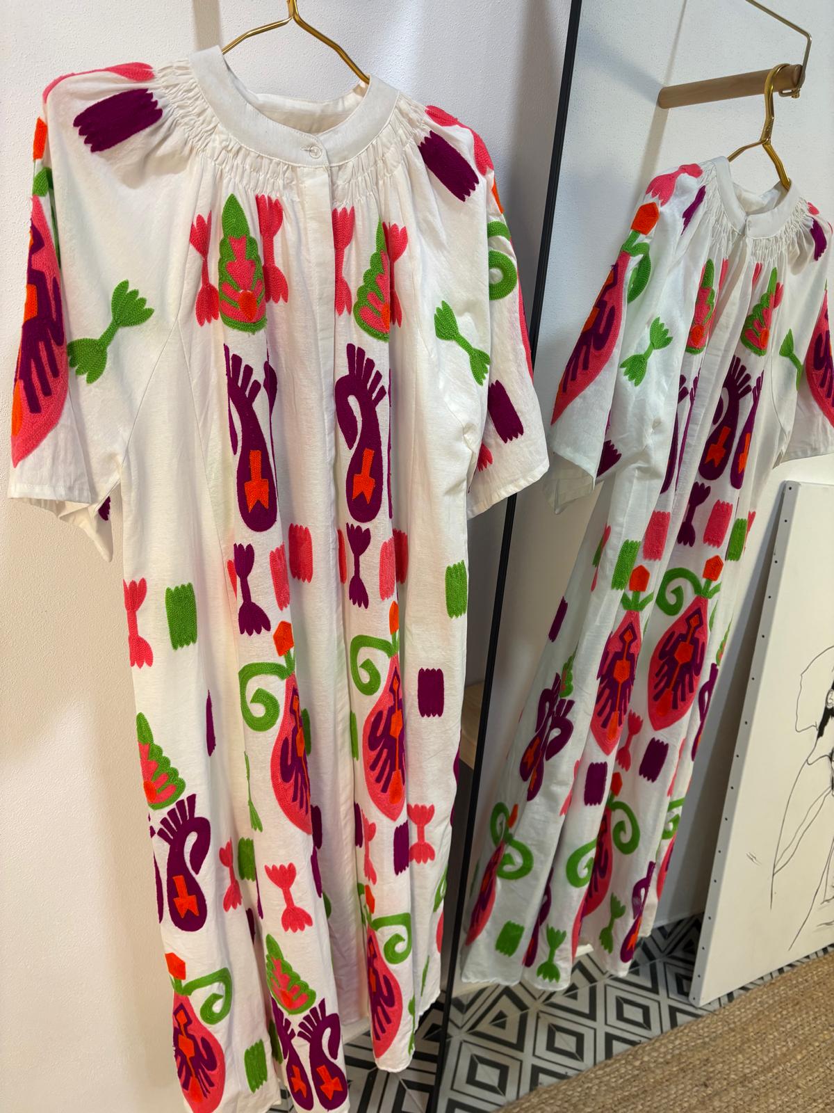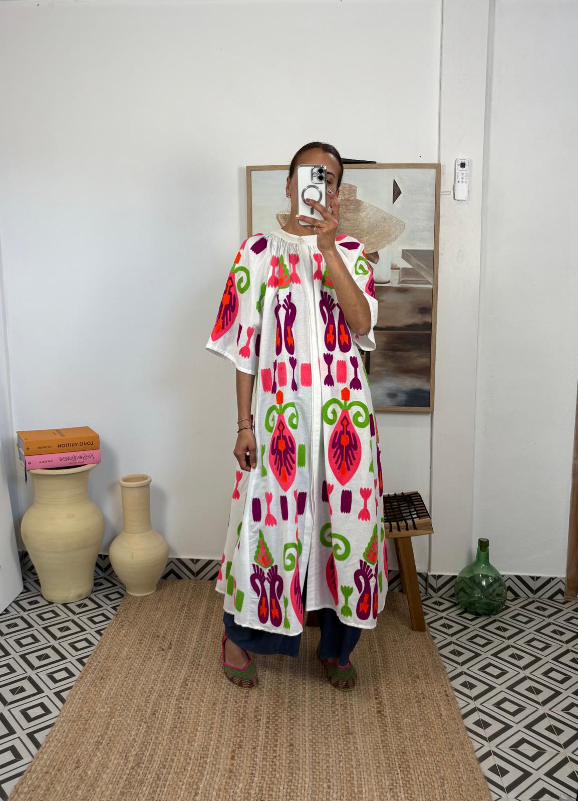 Vestido largo, de silueta suelta y amplia, tipo túnica. Escote redondo ligeramente fruncido. Mangas amplias tipo murciélago, de largo 3/4. Tejido en algodón blanco decorado con bordados en colores vivos.
